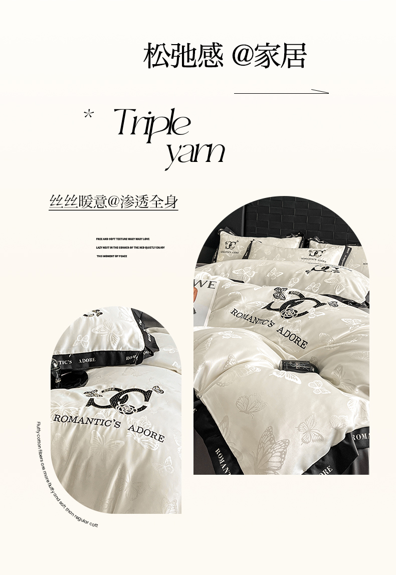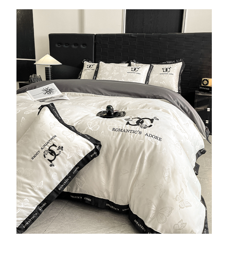 当前位置: 91家纺网 > 商品网购 > 床品套件 > 四件套 > 其它四件套 > 宇航家纺 2026新款专版厚织亮丝提花水洗真丝四件套梦蝶系列 梦蝶白拼深灰