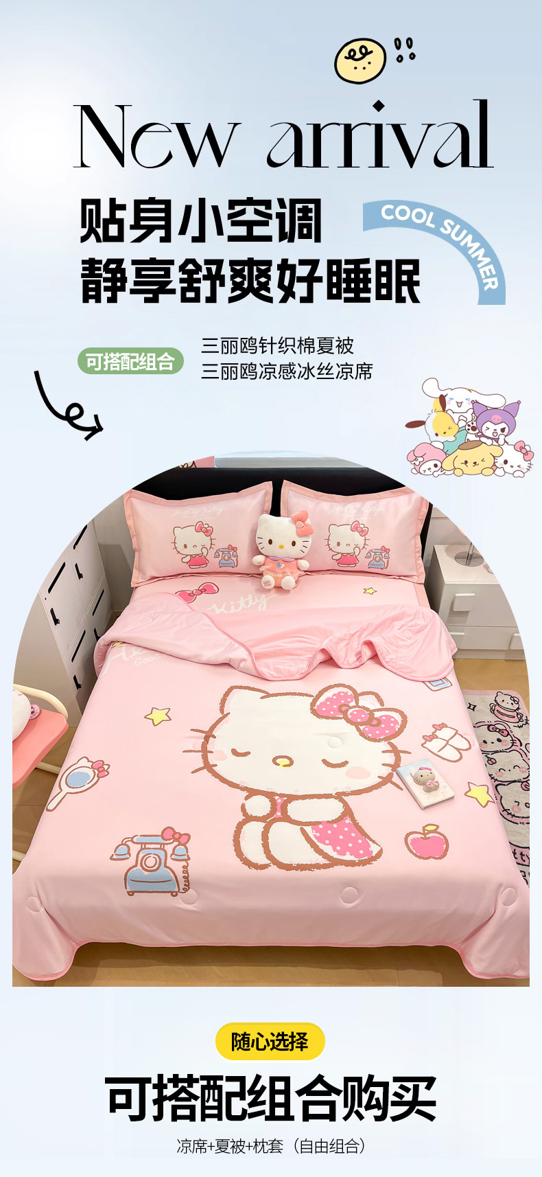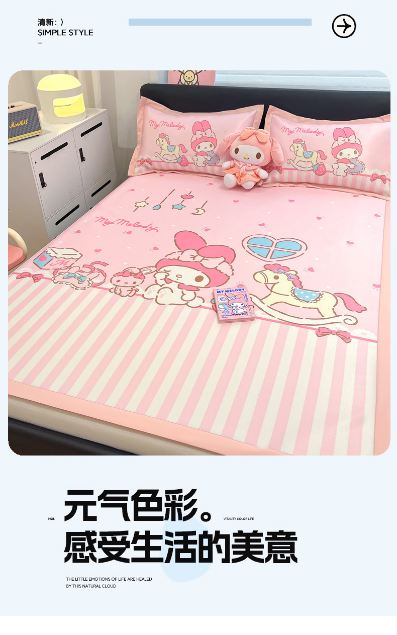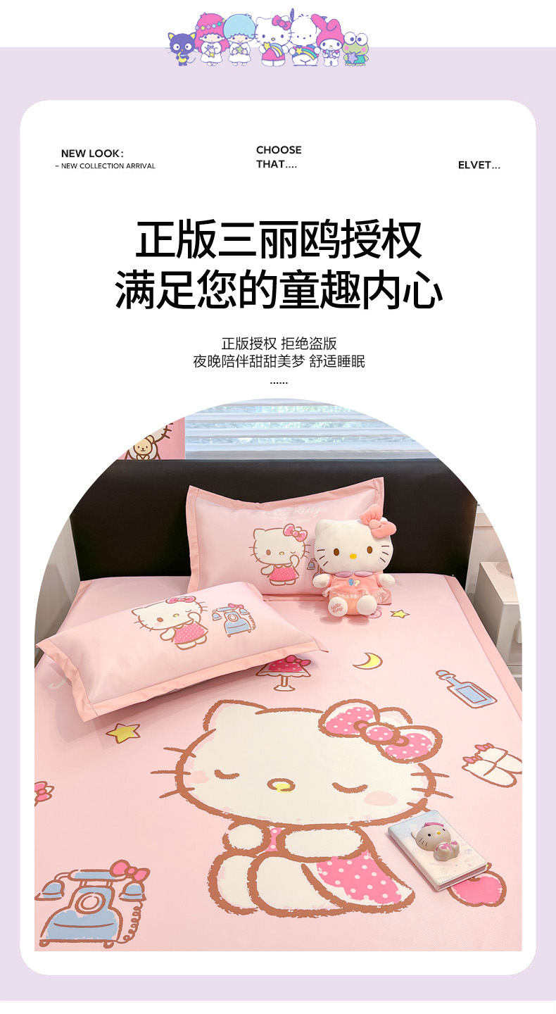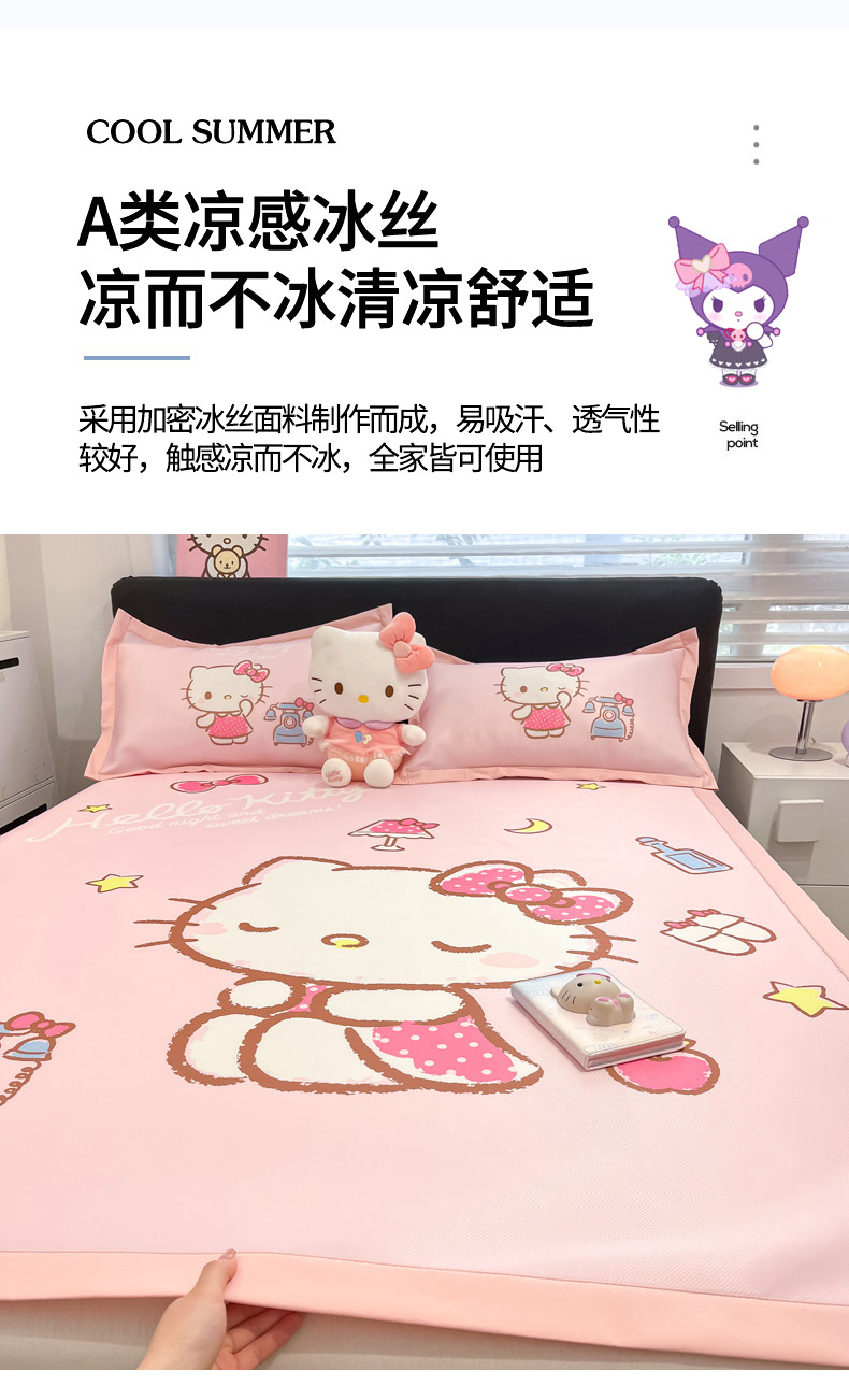 当前位置: 91家纺网 > 商品网购 > 床品套件 > 四件套 > 其它四件套 > 2025新款正版授权A类大版数码印花三丽鸥可机洗1200D冰丝凉席席子凉席可组合针织棉夏被四件套-平铺款 平铺款-晚安KT