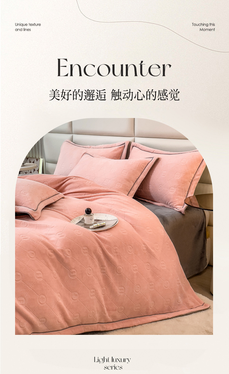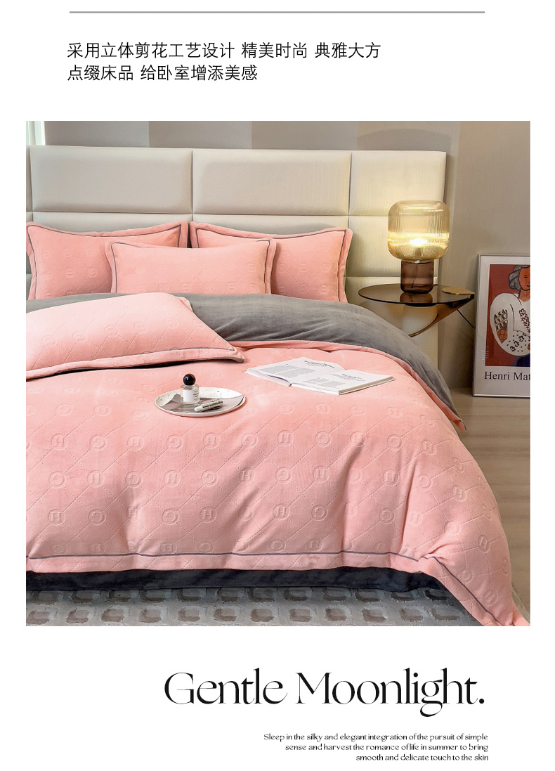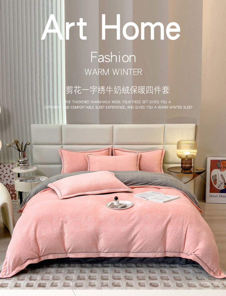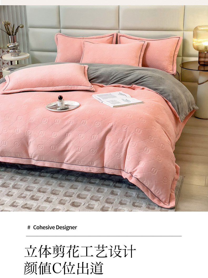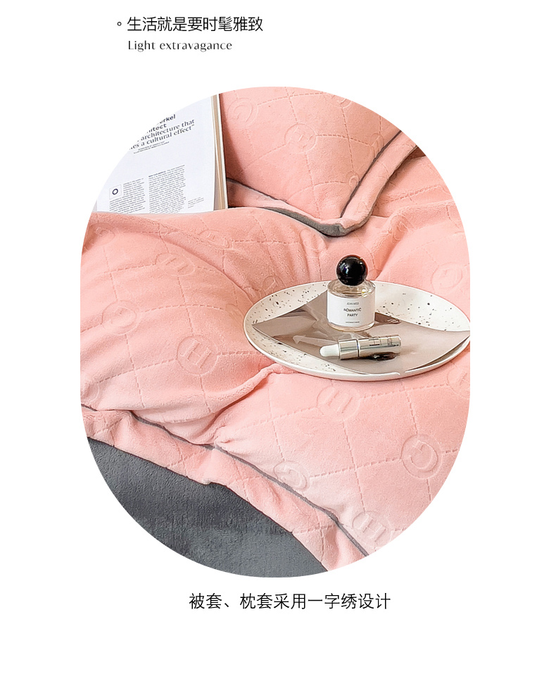 当前位置: 91家纺网 > 商品网购 > 床品套件 > 四件套 > 牛奶绒四件套 > 印季家纺 2025新款HG剪花一字绣牛奶绒四件套 嫩粉-马丁灰