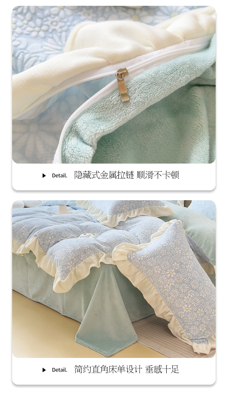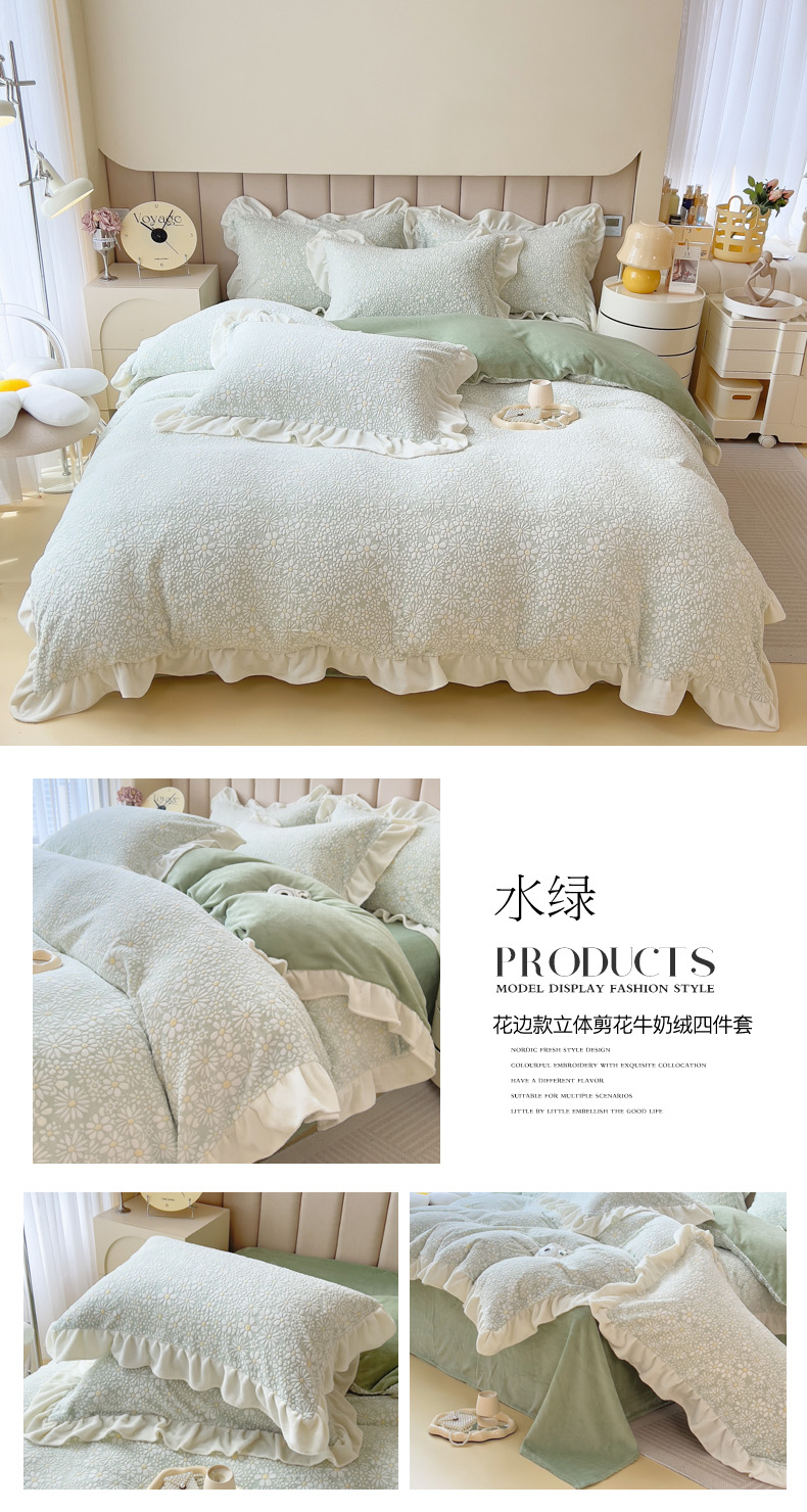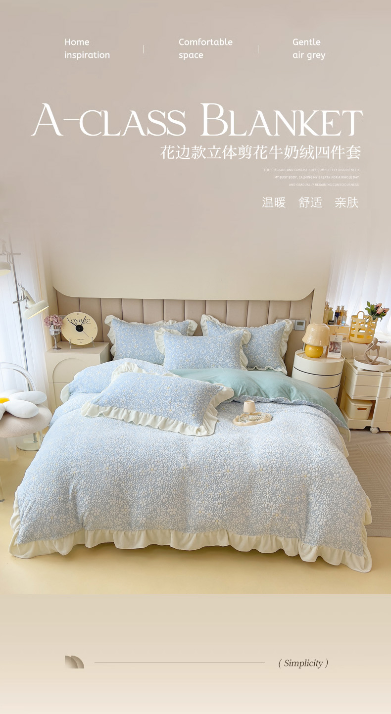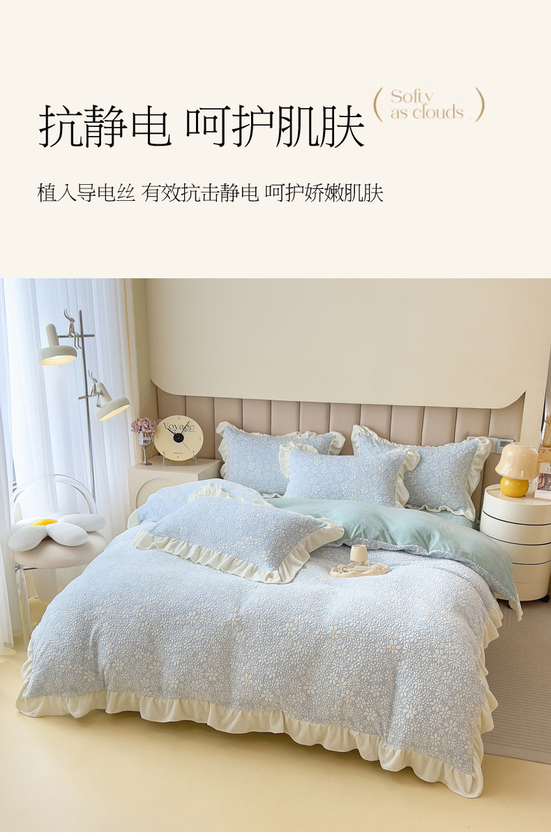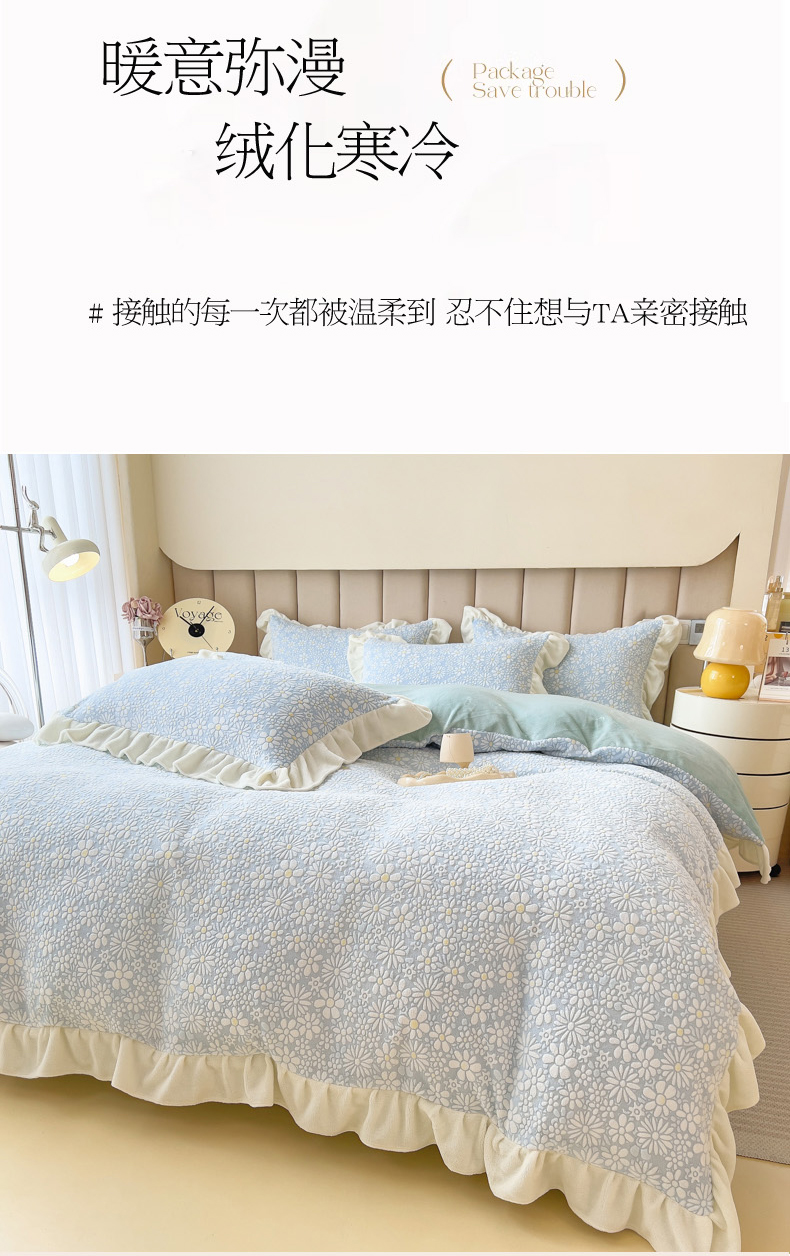 当前位置: 91家纺网 > 商品网购 > 床品套件 > 四件套 > 牛奶绒四件套 > 印季家纺 2025新款花边款立体剪花牛奶绒四件套 天蓝