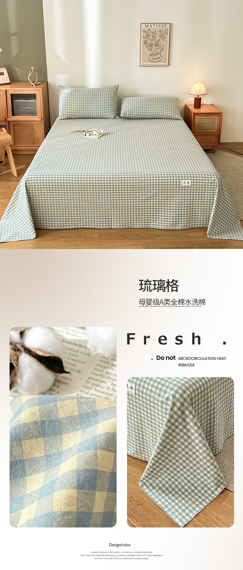 • 91家纺网 家纺一手货源 找家纺 21度C 2026新款A类全棉水洗棉母婴级床单 蓝小格