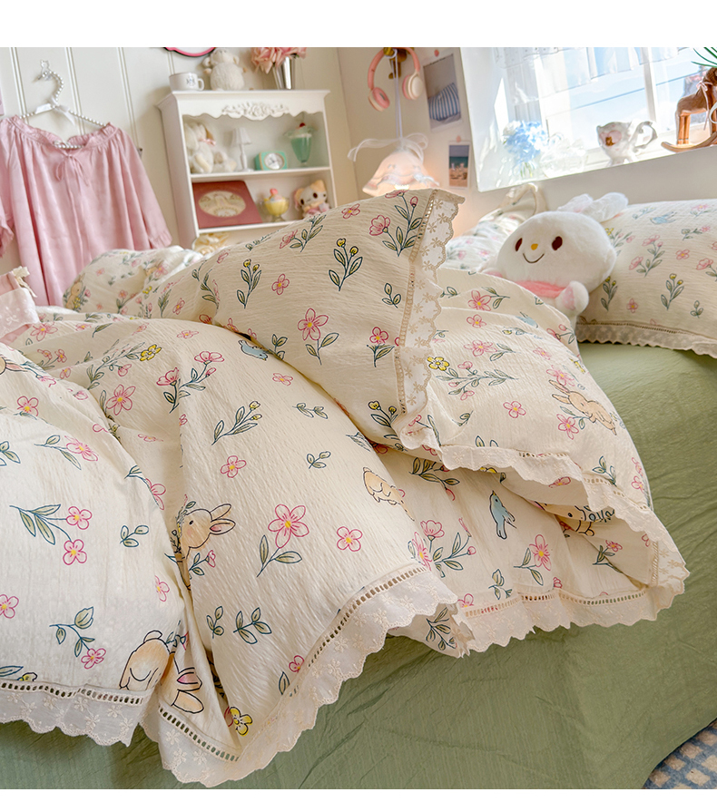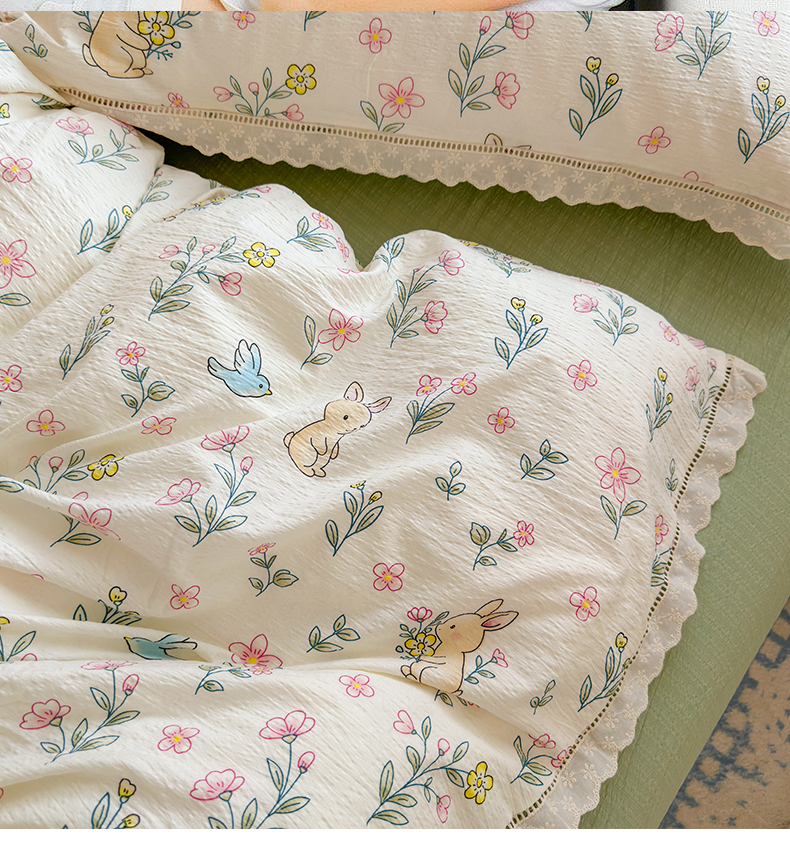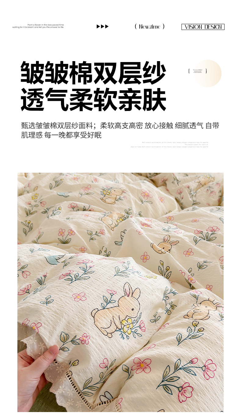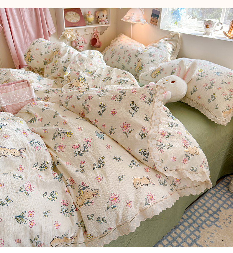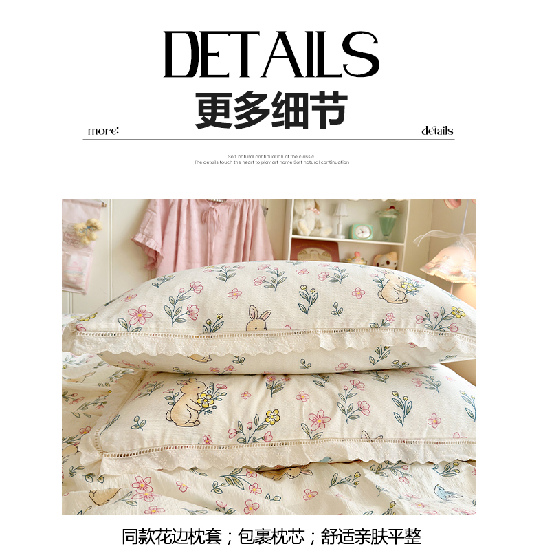 当前位置: 91家纺网 > 商品网购 > 床品套件 > 四件套 > 双层纱四件套 > 优卡迪家纺馆 2026新款全棉花边皱皱棉双层纱四件套下载文件包含买家秀 花园小兔