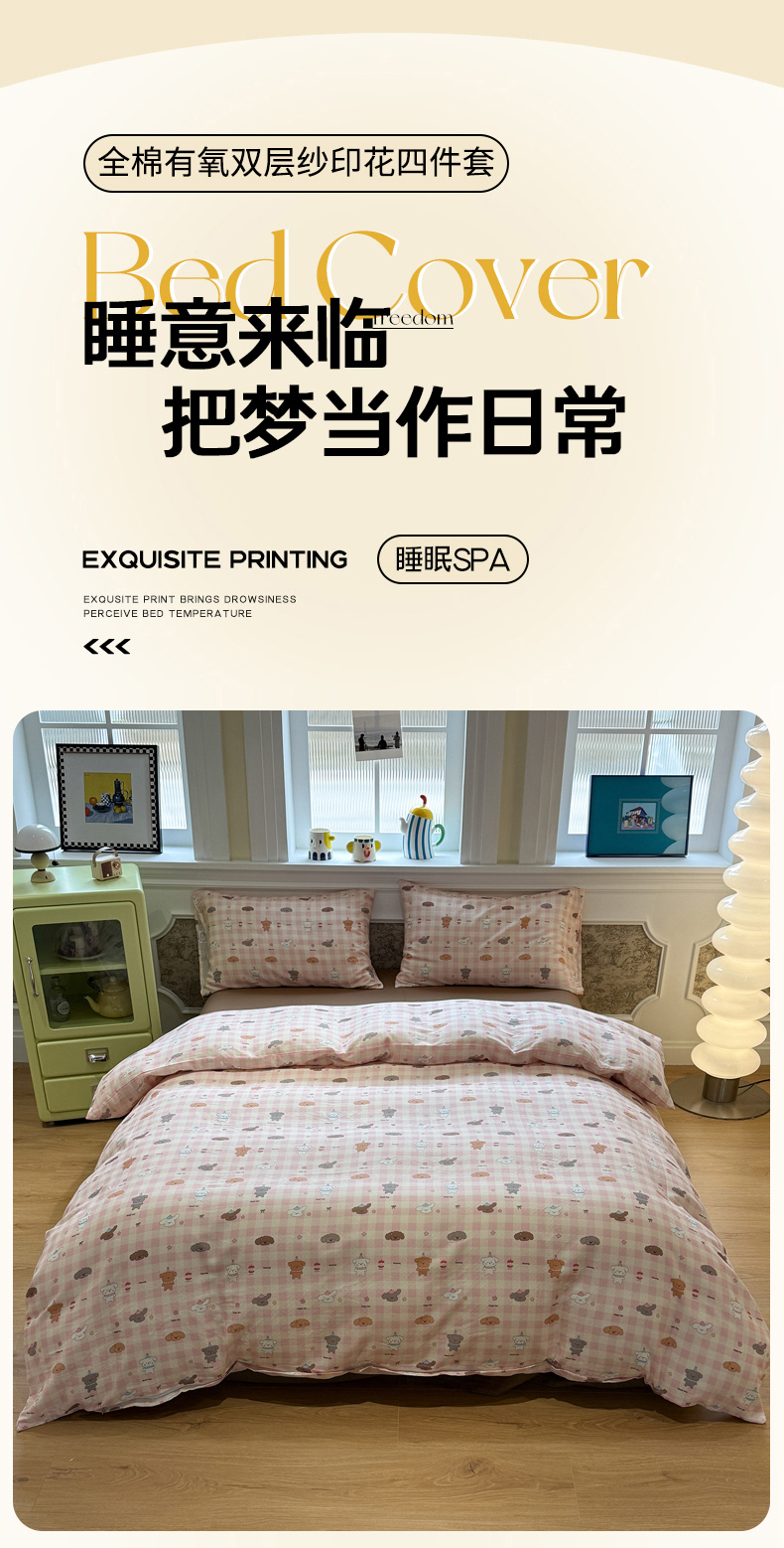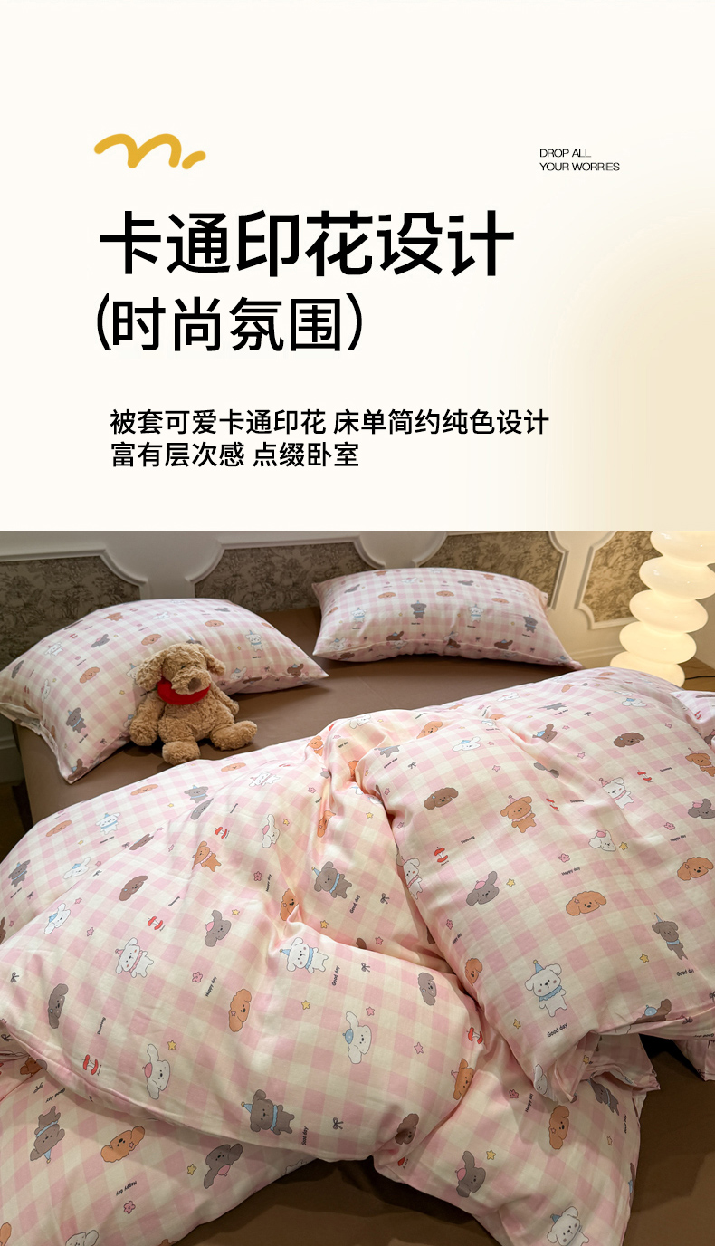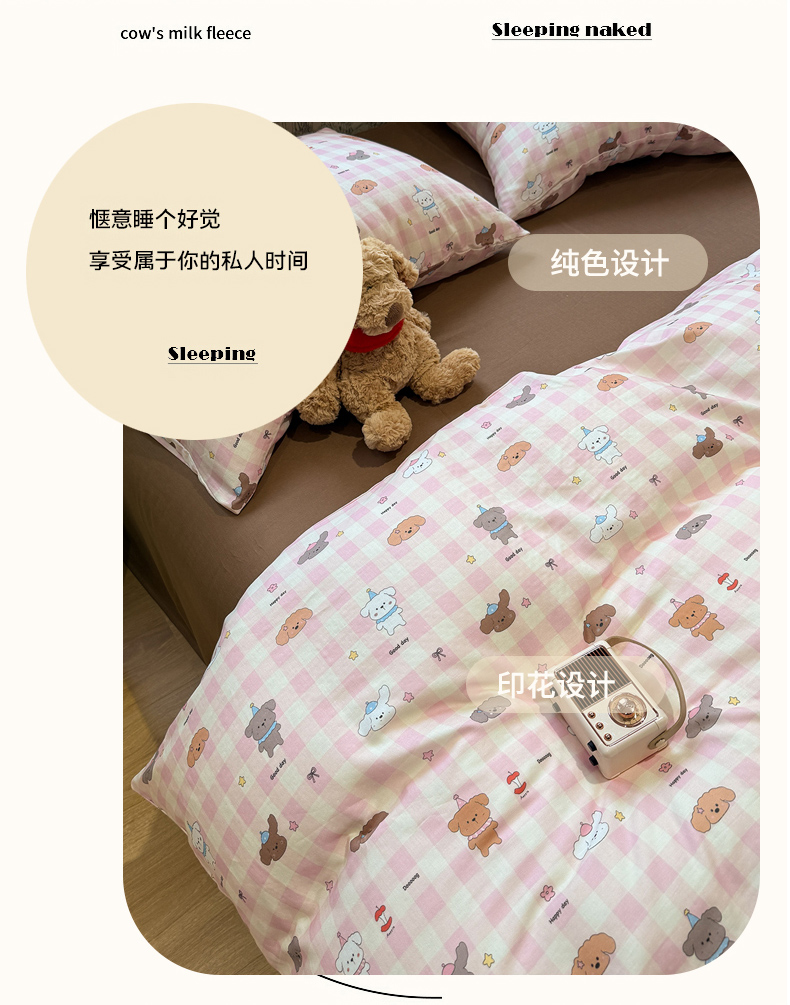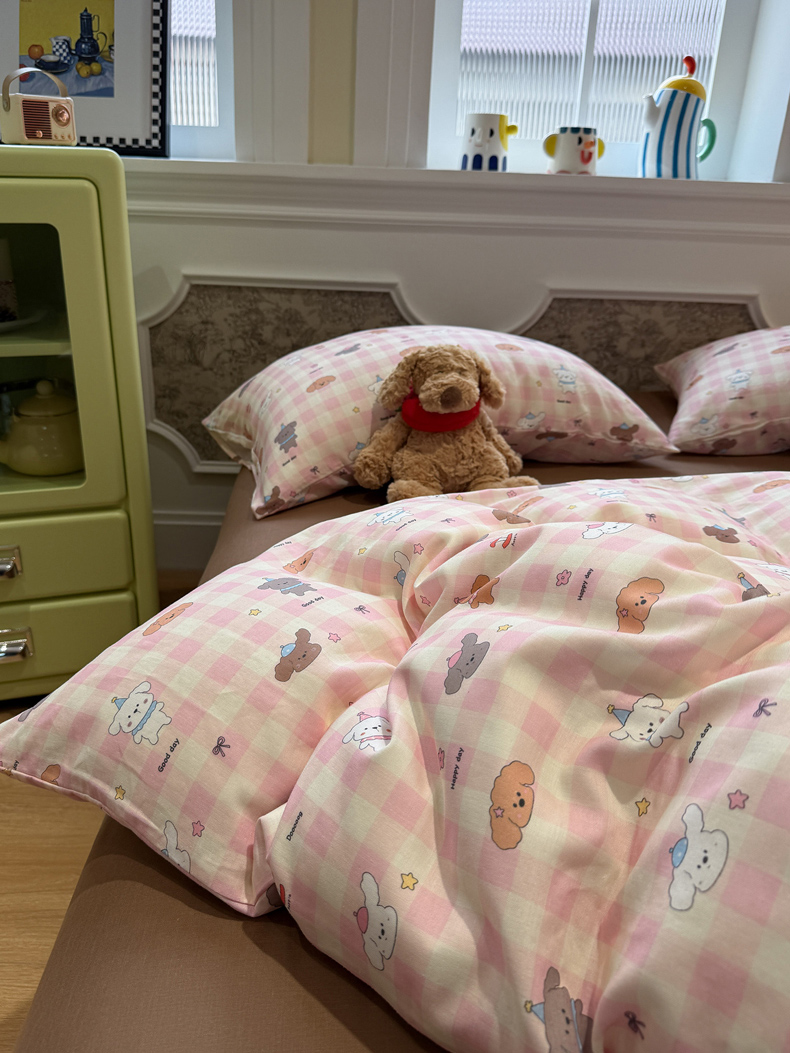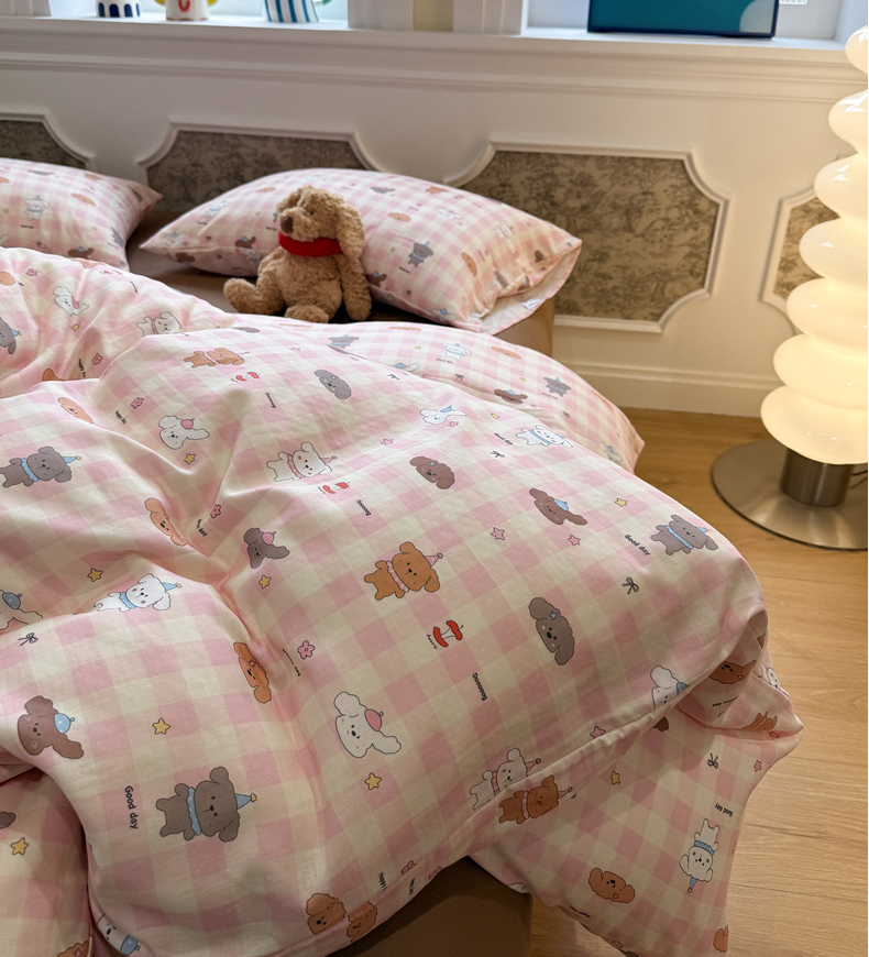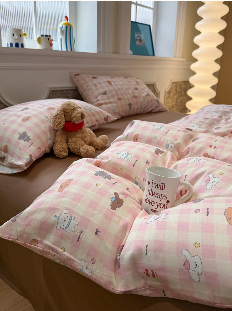 当前位置: 91家纺网 > 商品网购 > 床品套件 > 四件套 > 双层纱四件套 > 塞纳 2026新款.全棉有氧双层纱四件套-场景二 粉格奶狗
