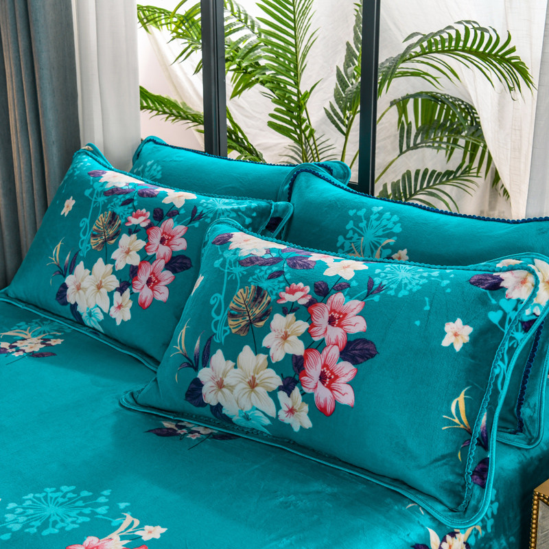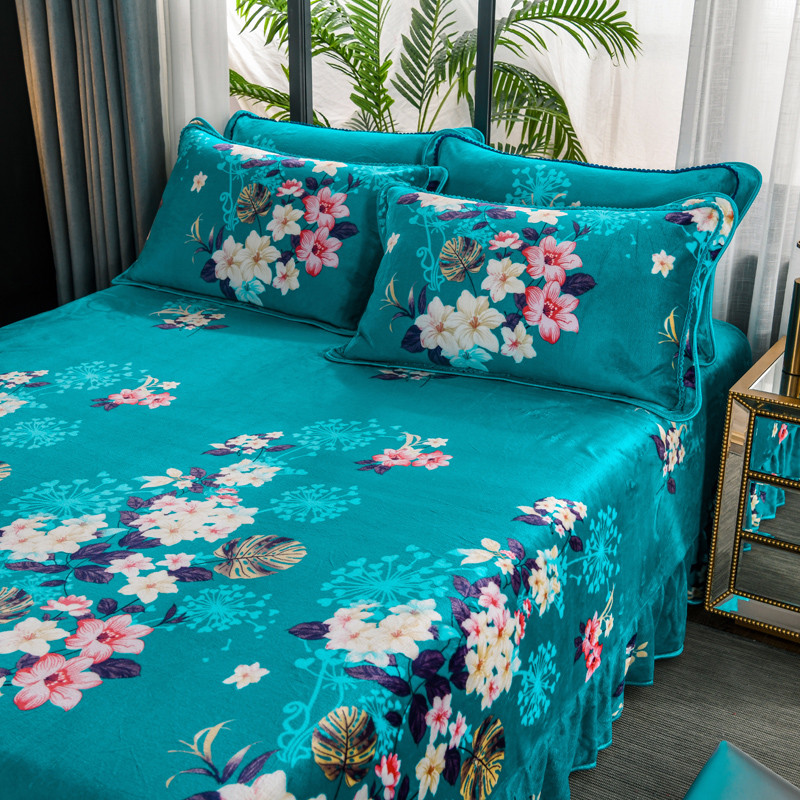 雨洋家纺 2025新款加厚金貂绒床裙床盖 蓝底大花