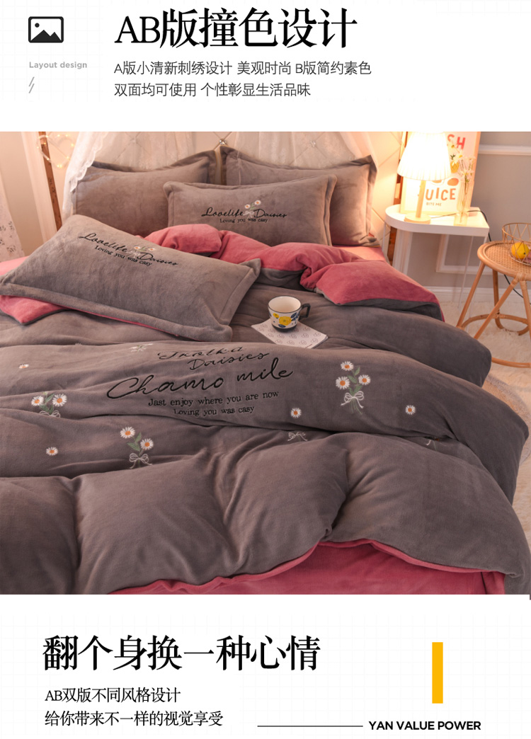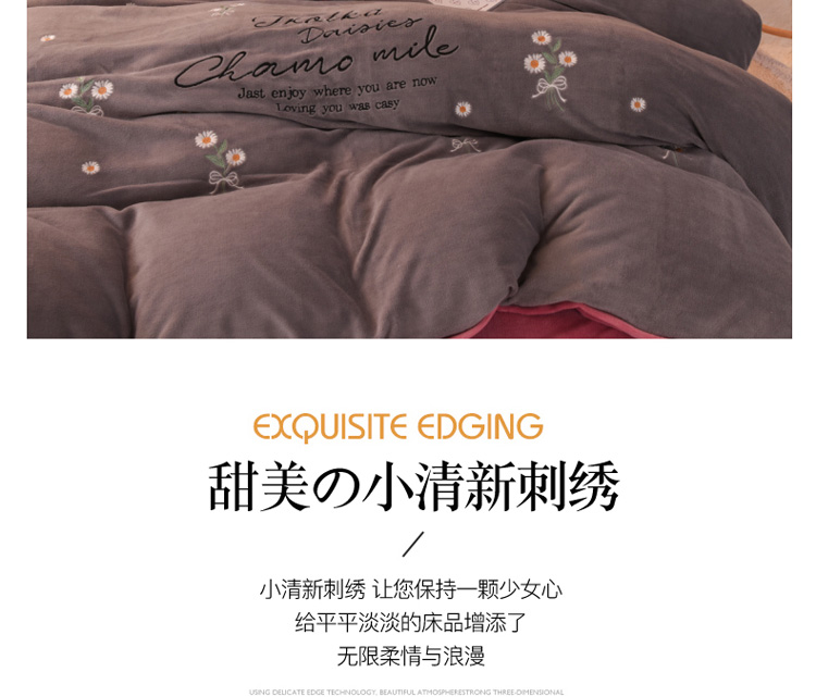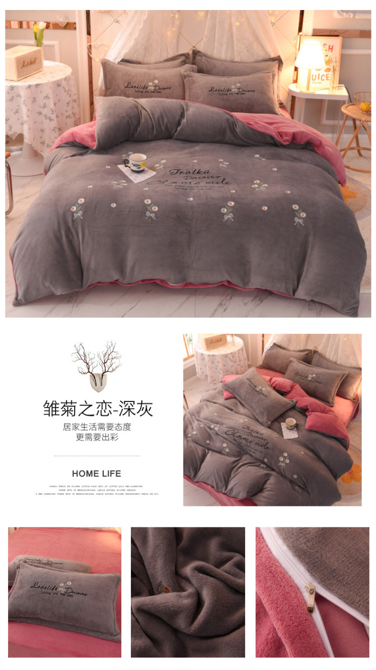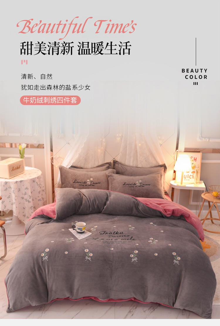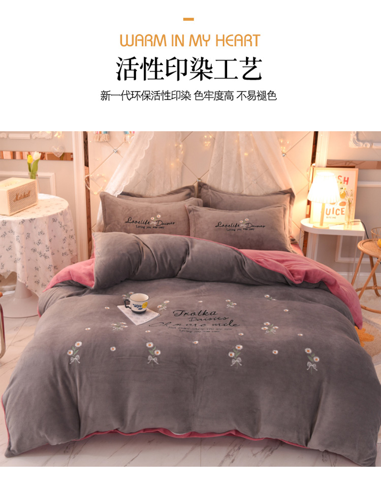 商品名称:捌月牛奶绒小清新刺绣四件套 雏菊之恋-深灰