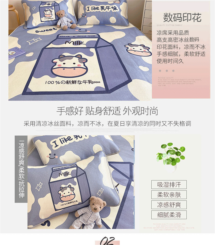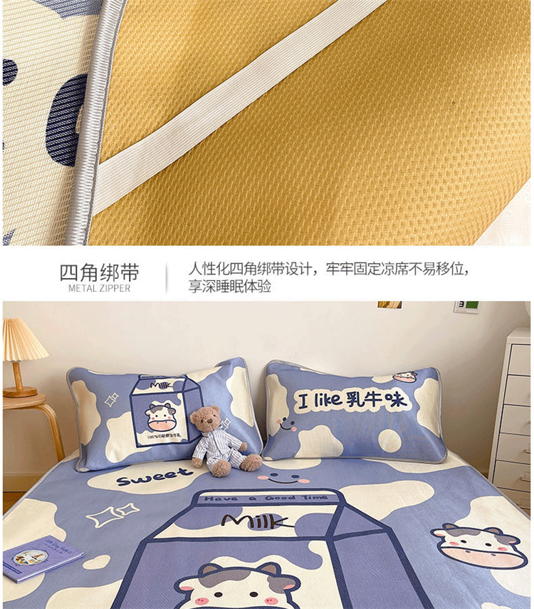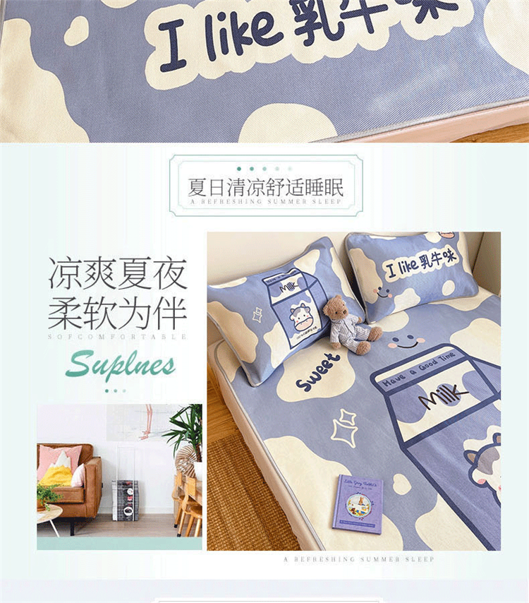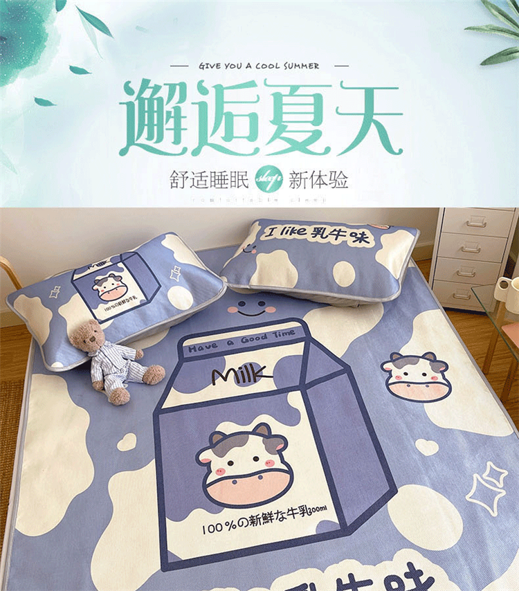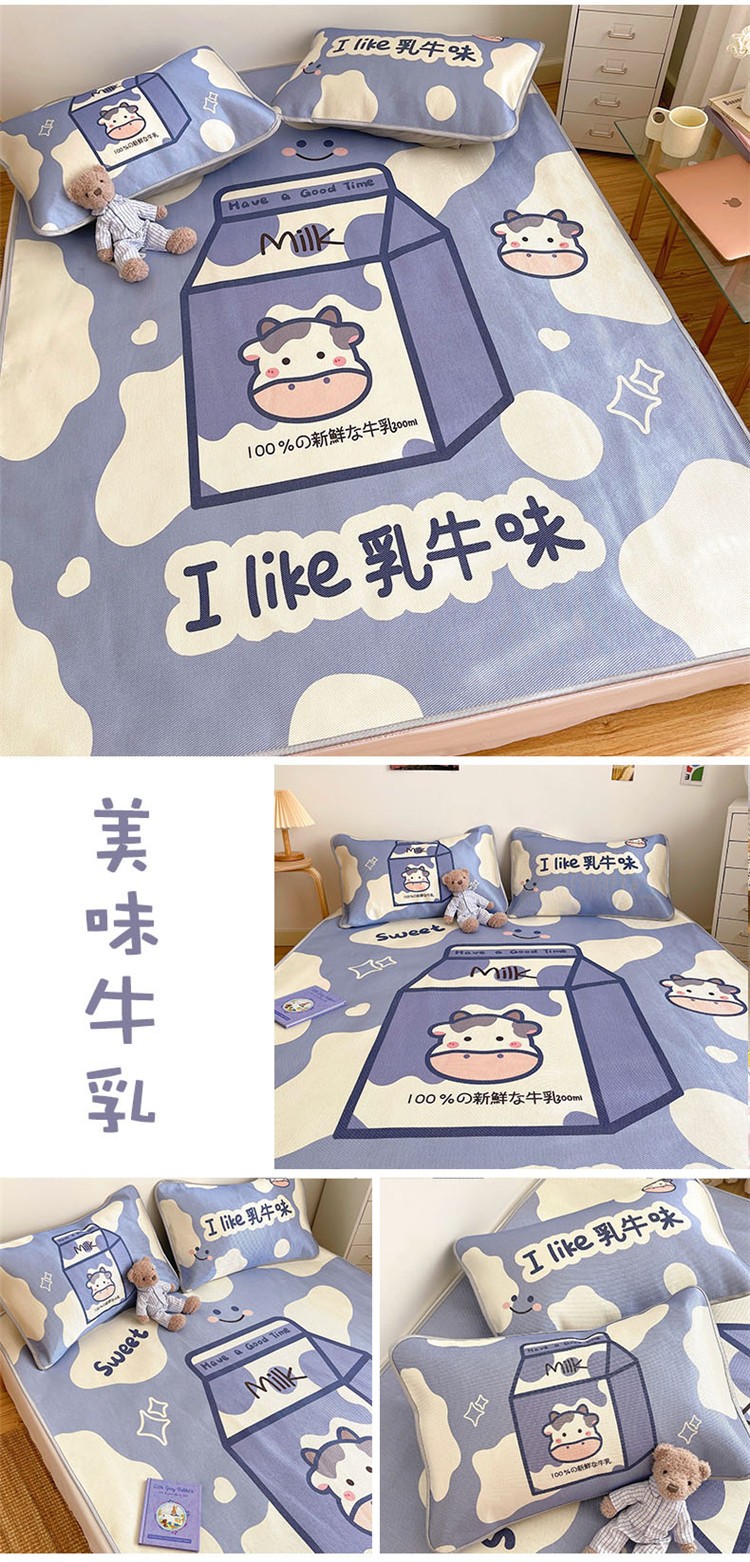 川悦生活 直播供货2021新款小清新大版冰丝席卡通凉席三件套美味牛乳