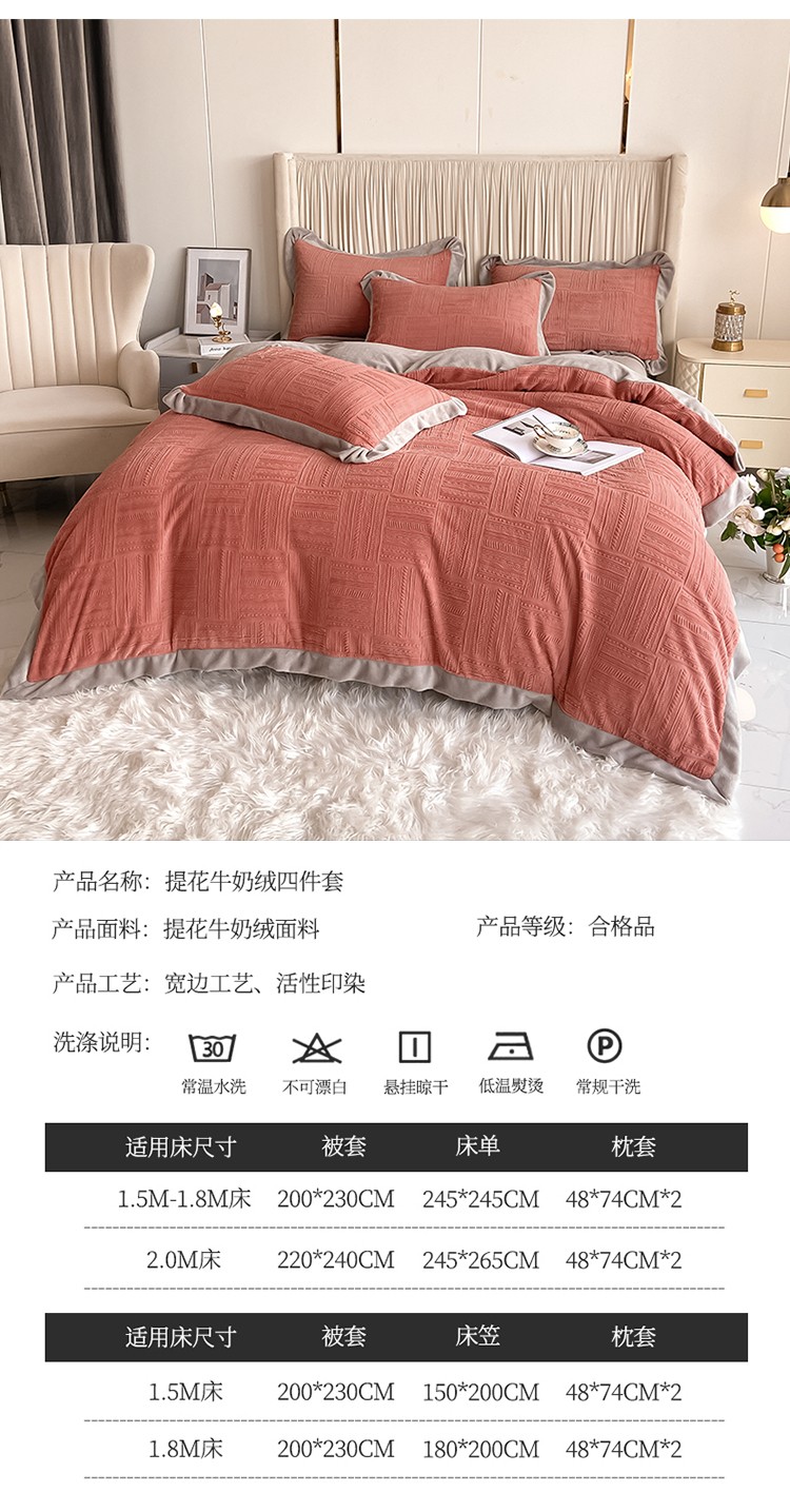 花漾 2023新款雕花提花牛奶绒宽边四件套 慢生活橘