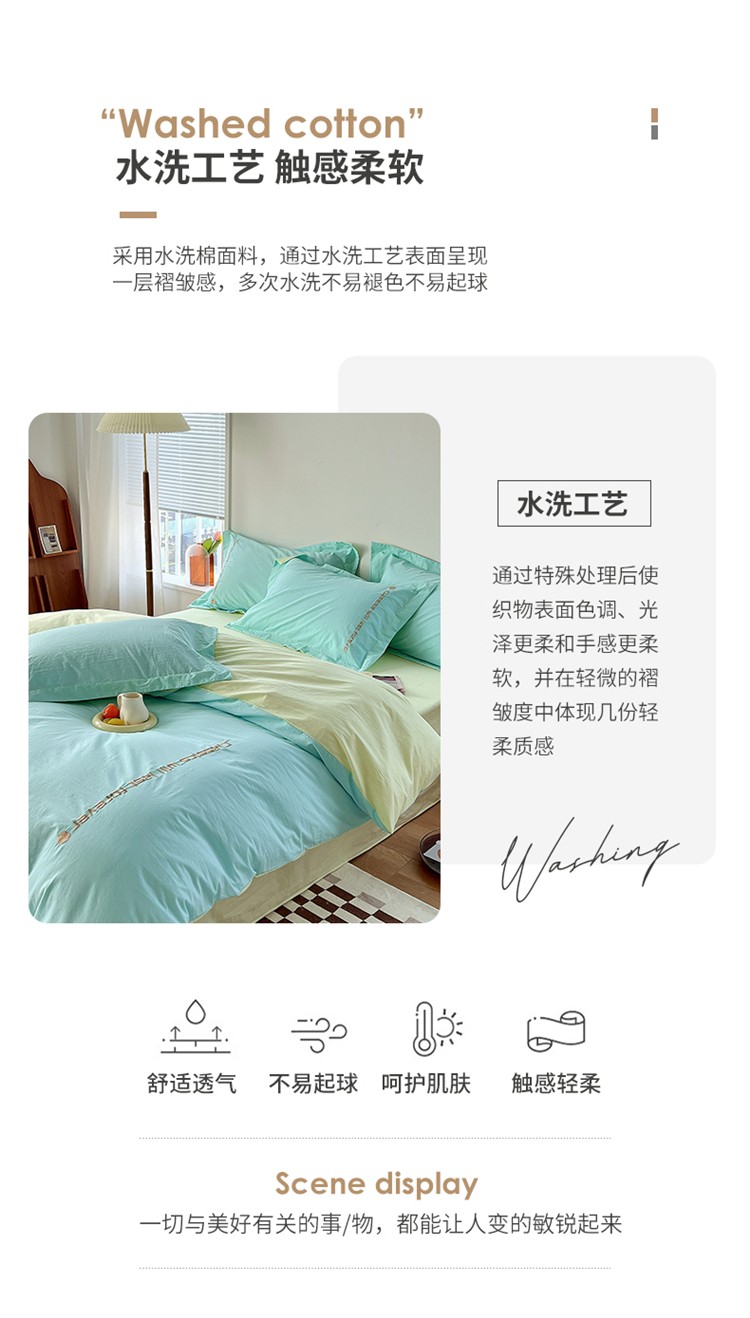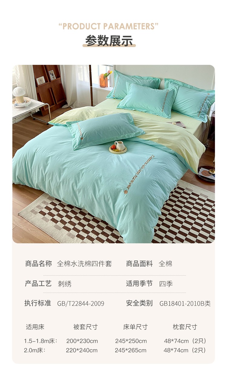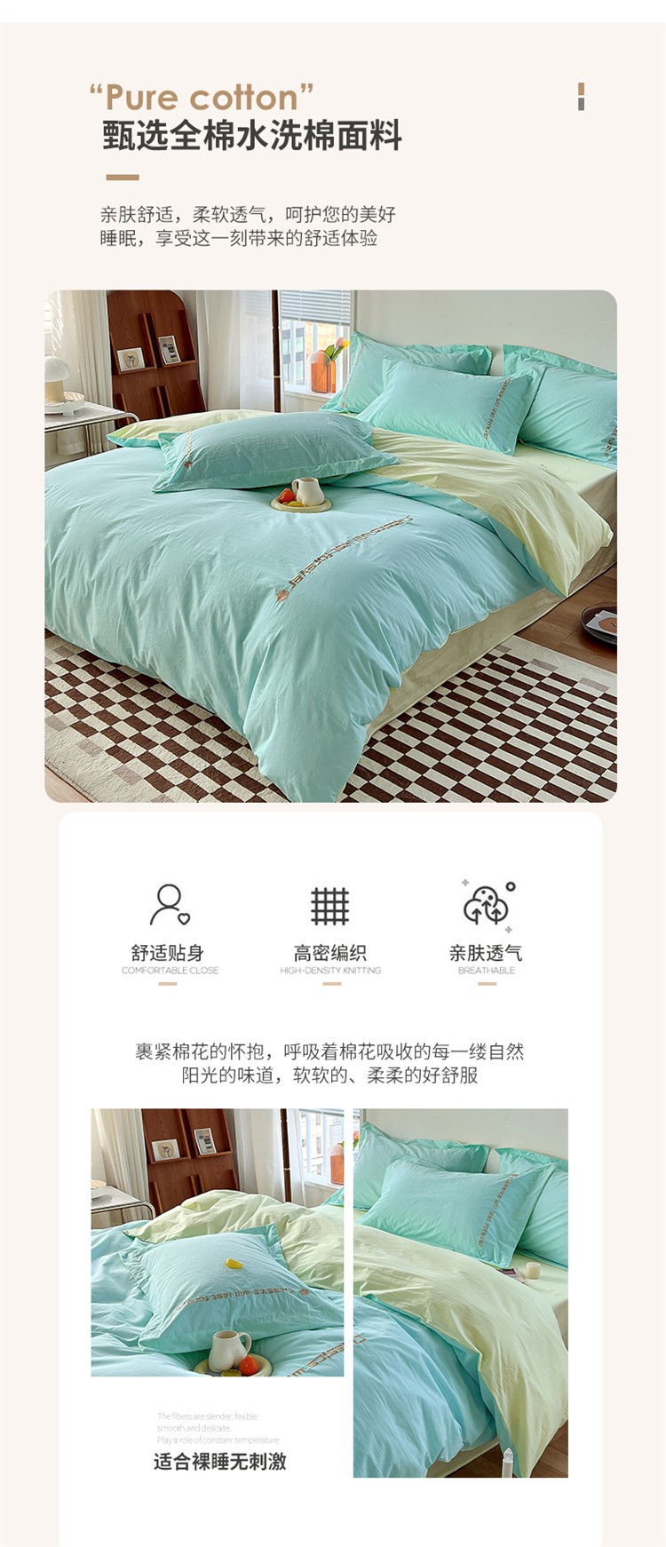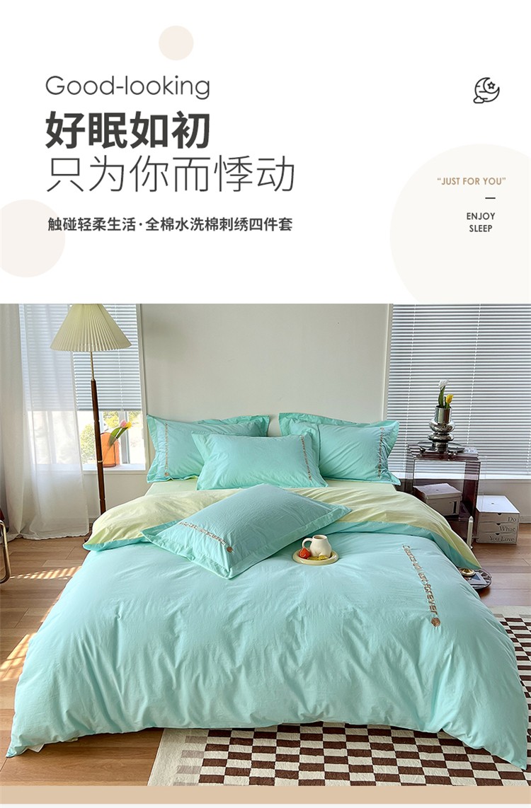 (总)拼社家纺 2025新款母婴及全棉水洗棉刺绣四件套纯棉床上用品,艾玛绿+卡其,繁星蓝+卡其,繁星蓝+玫瑰粉,红豆沙+雅灰,迷雾灰+玫瑰粉,蜜粉+雅灰,奶油白+卡其,奶油白+香橙,牛仔蓝+浅蓝,香橙+雅灰
