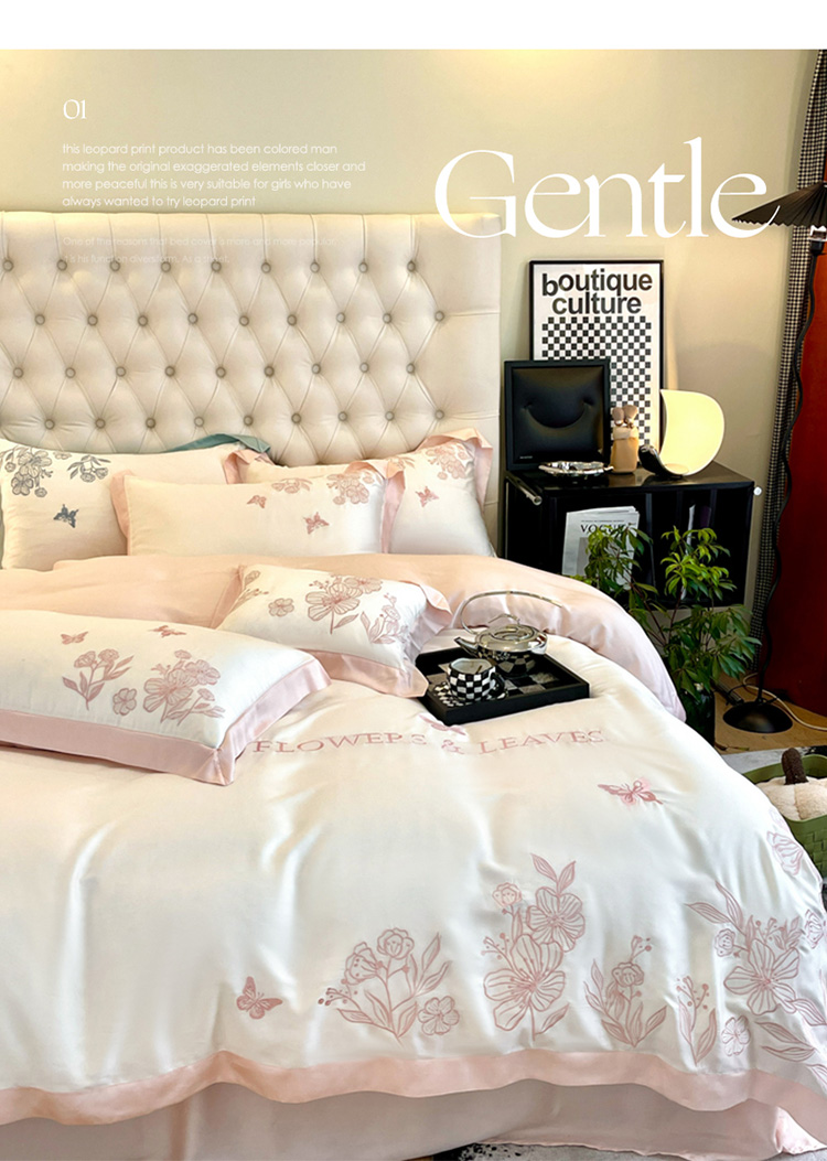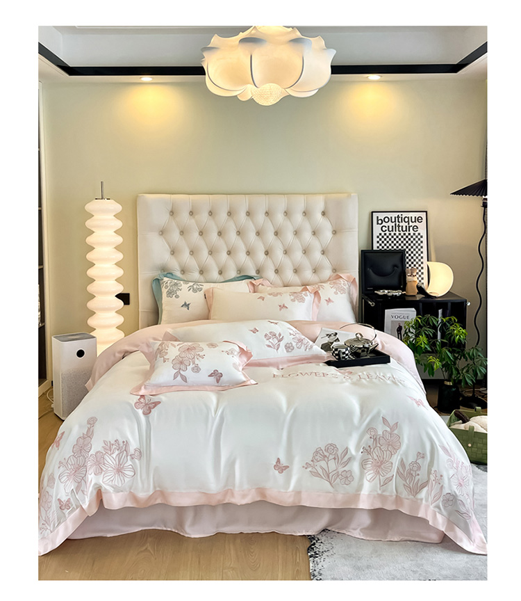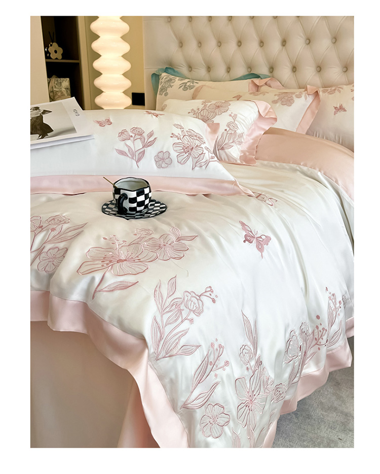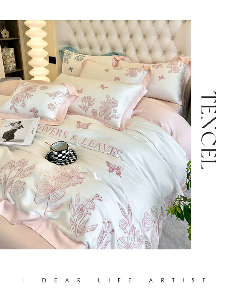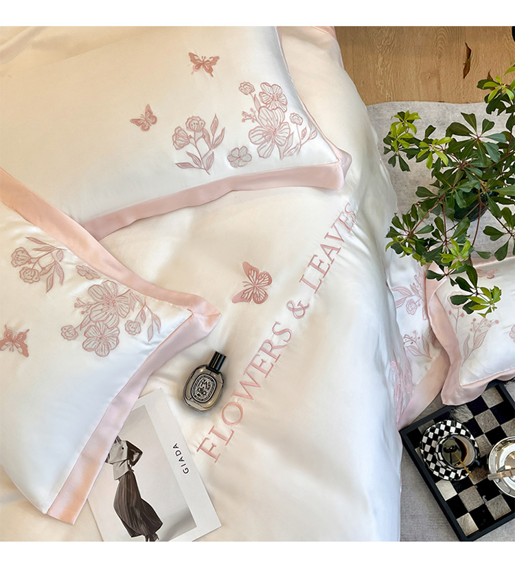 眠帛2022新品60支兰精天丝气质轻奢绣花四件套盛夏盛夏-粉