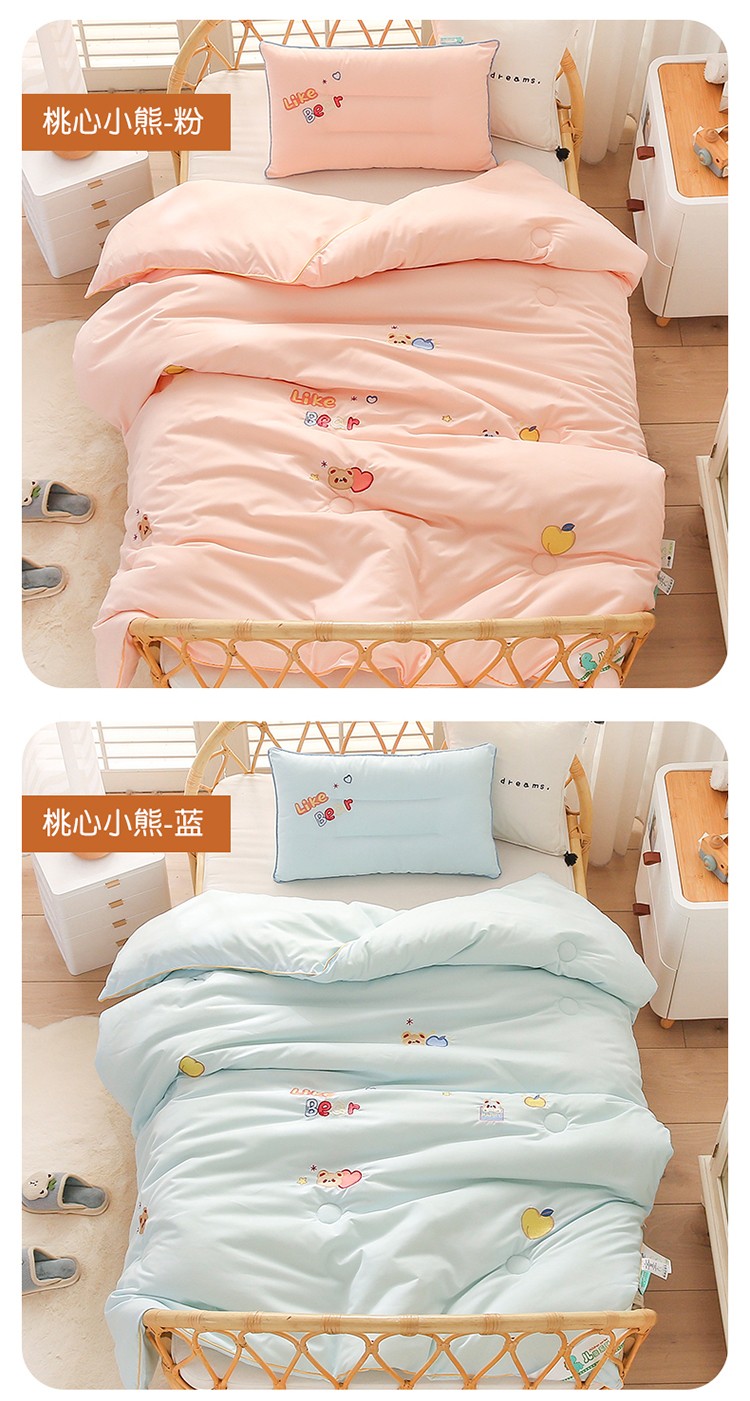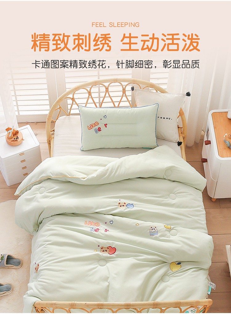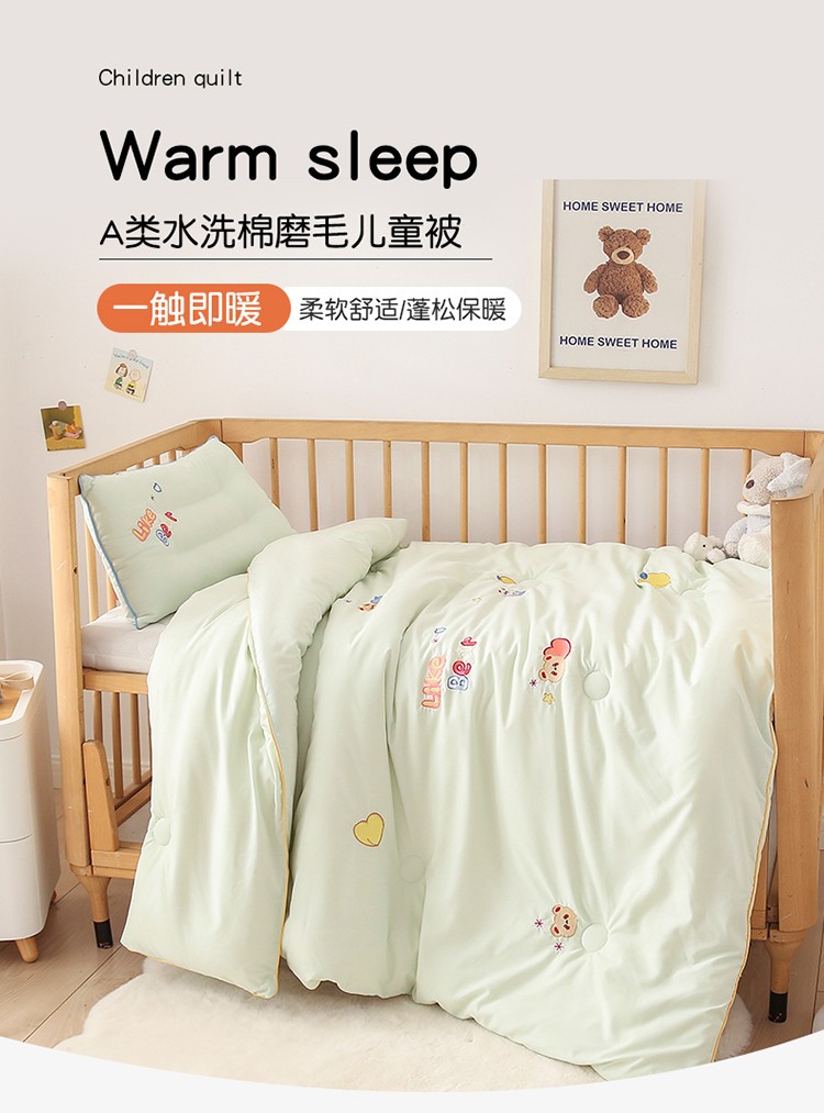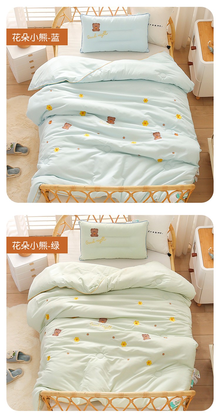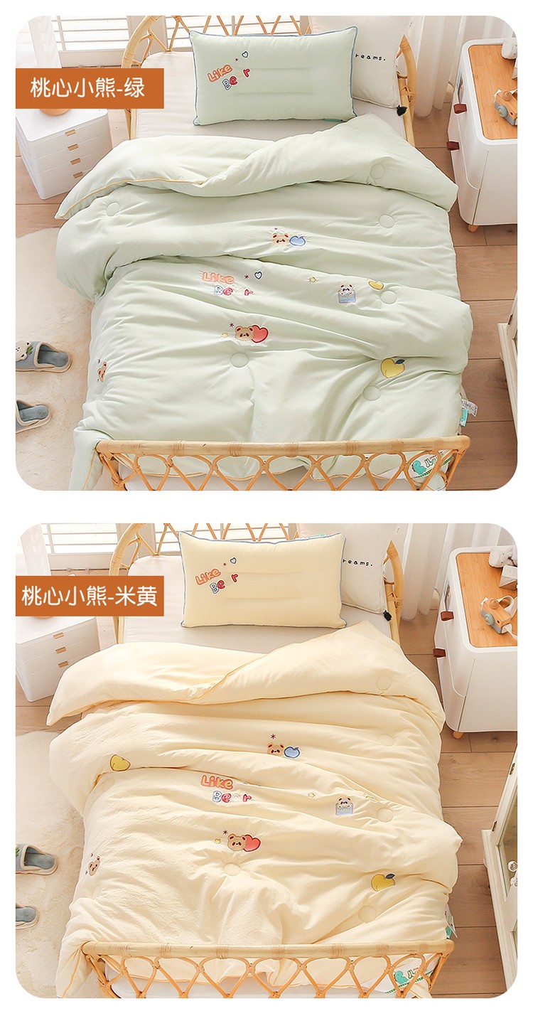 商品名称:A类水洗棉磨毛绣花款幼儿园冬被大豆儿童春秋被芯宝宝午睡被子 桃心小熊-绿