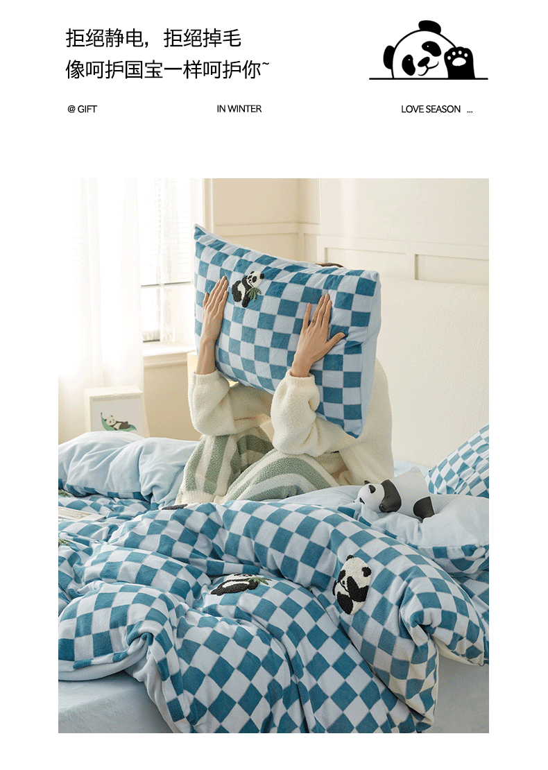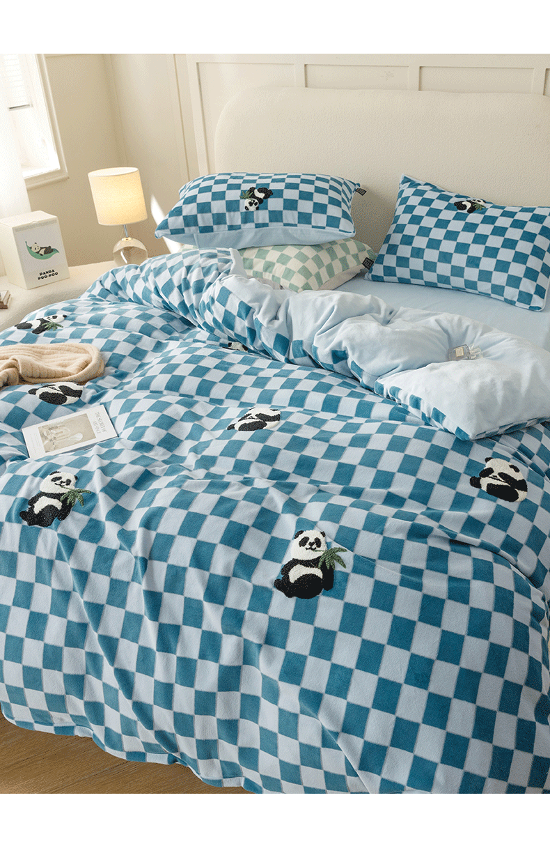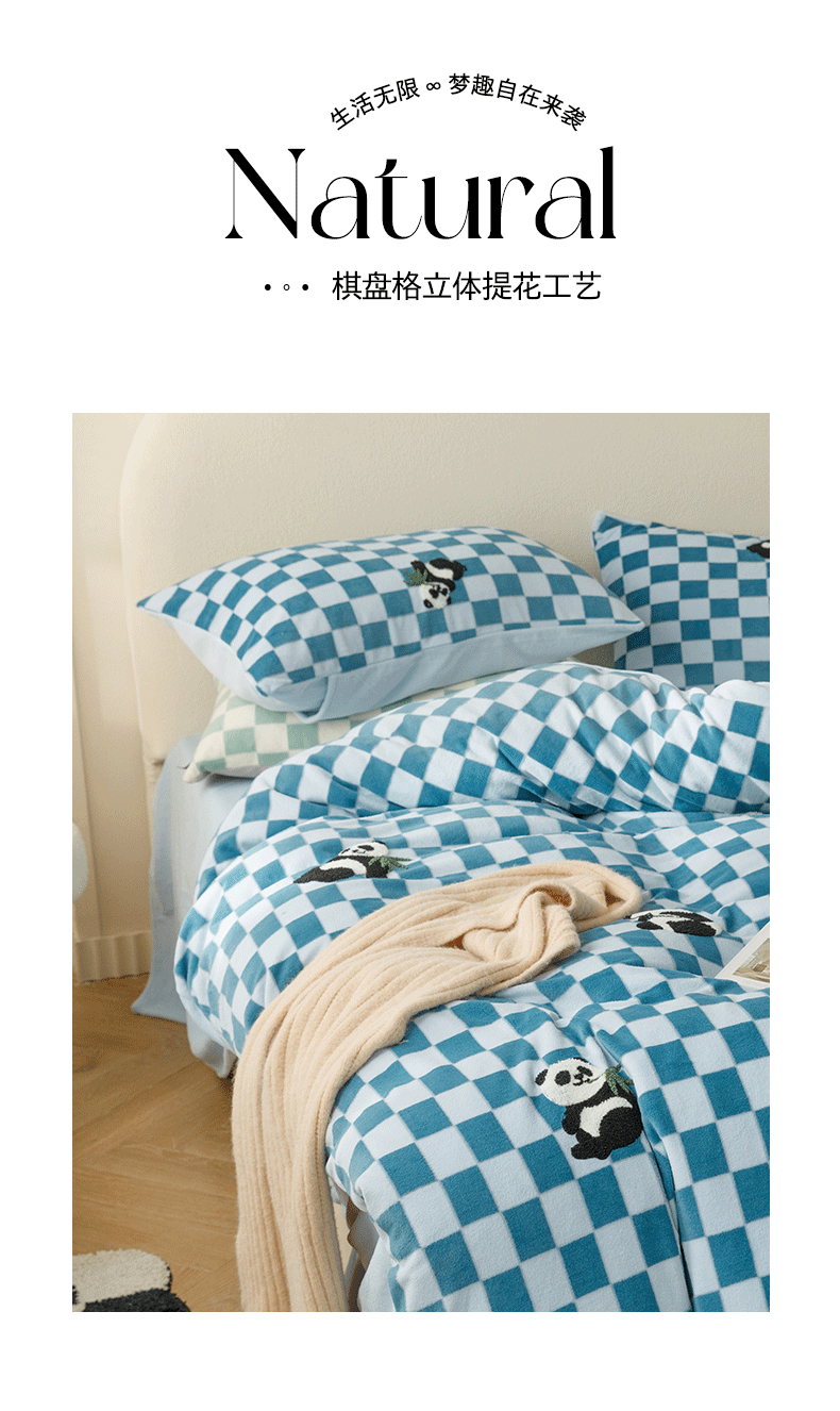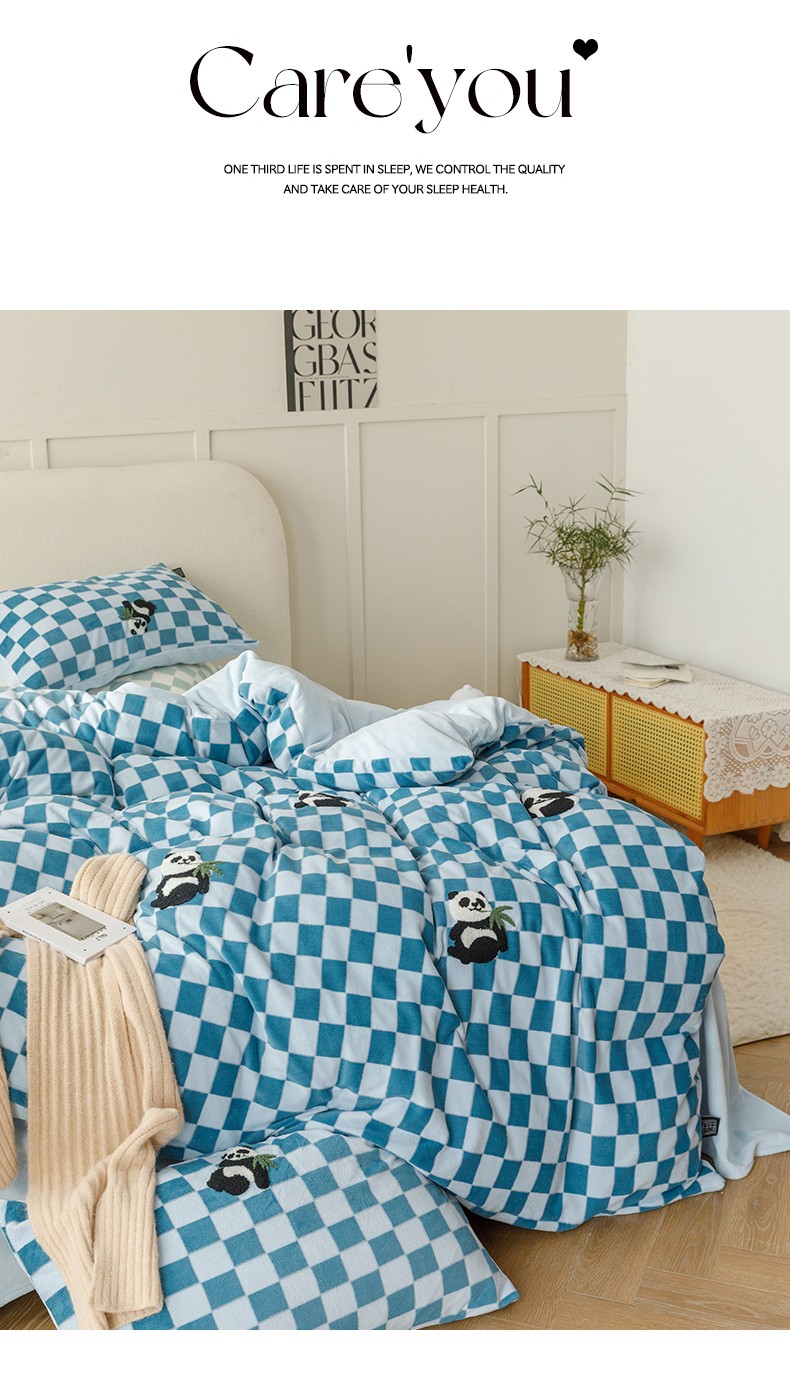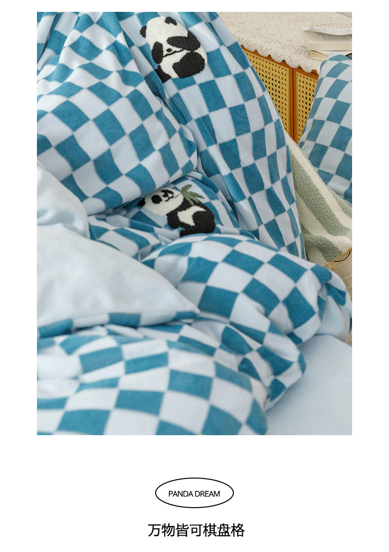 A类母婴级棋盘格牛奶绒毛巾绣熊猫系列(风格二) 棋盘格熊猫-夜海蓝