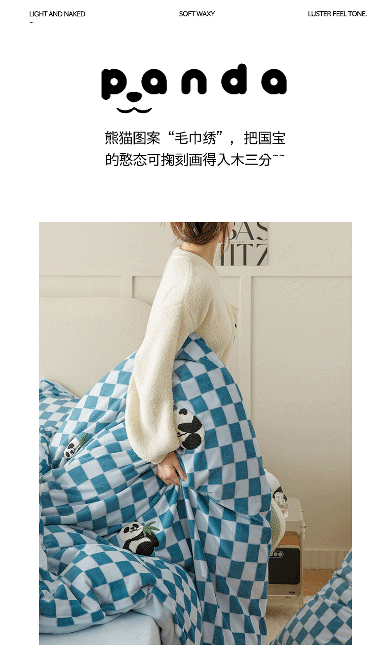 商品名称:A类母婴级棋盘格牛奶绒毛巾绣熊猫系列(风格二) 棋盘格熊猫-夜海蓝