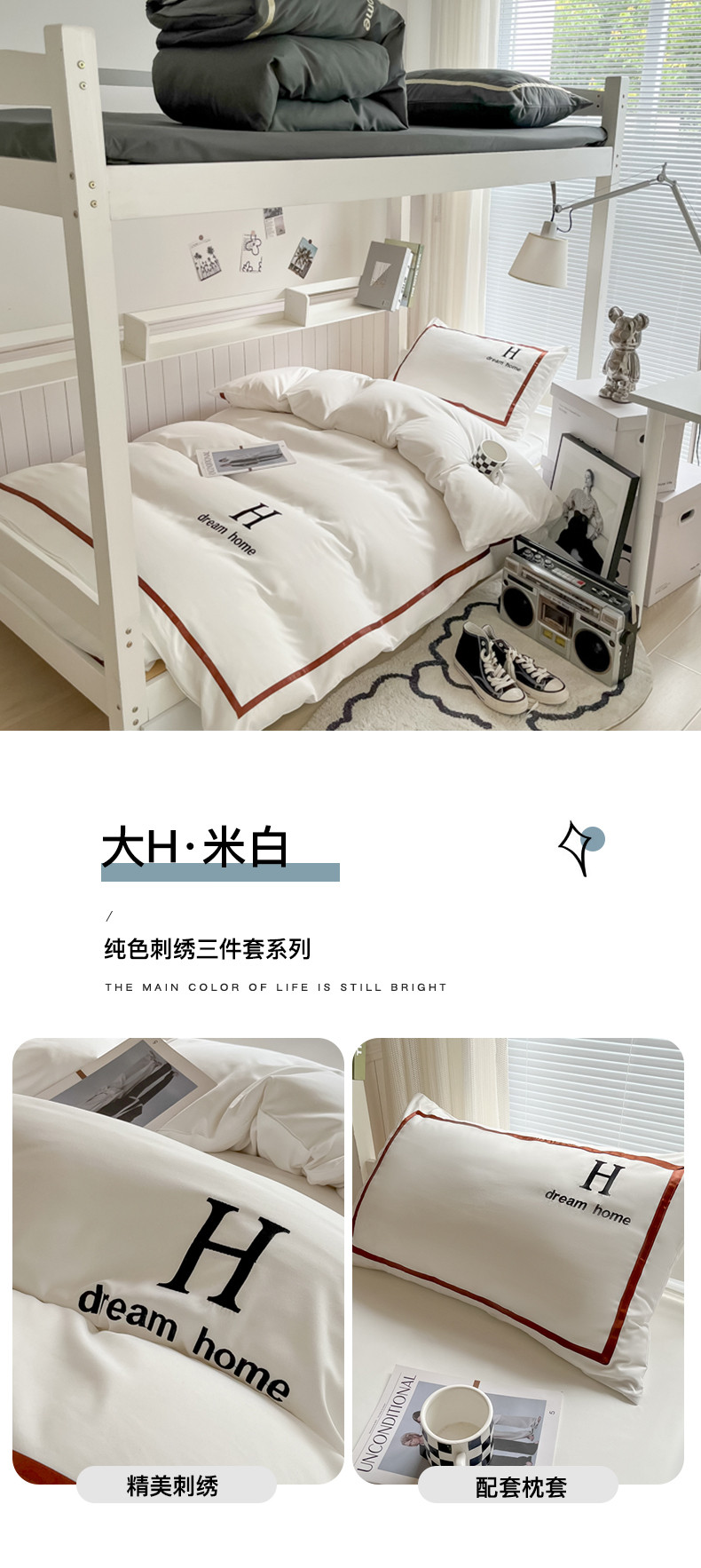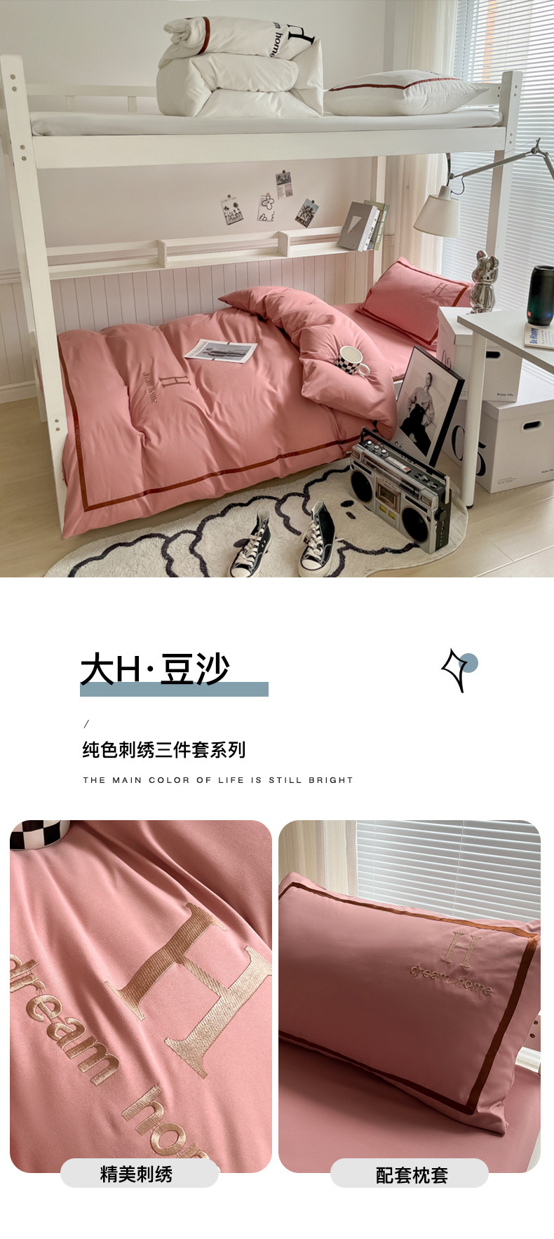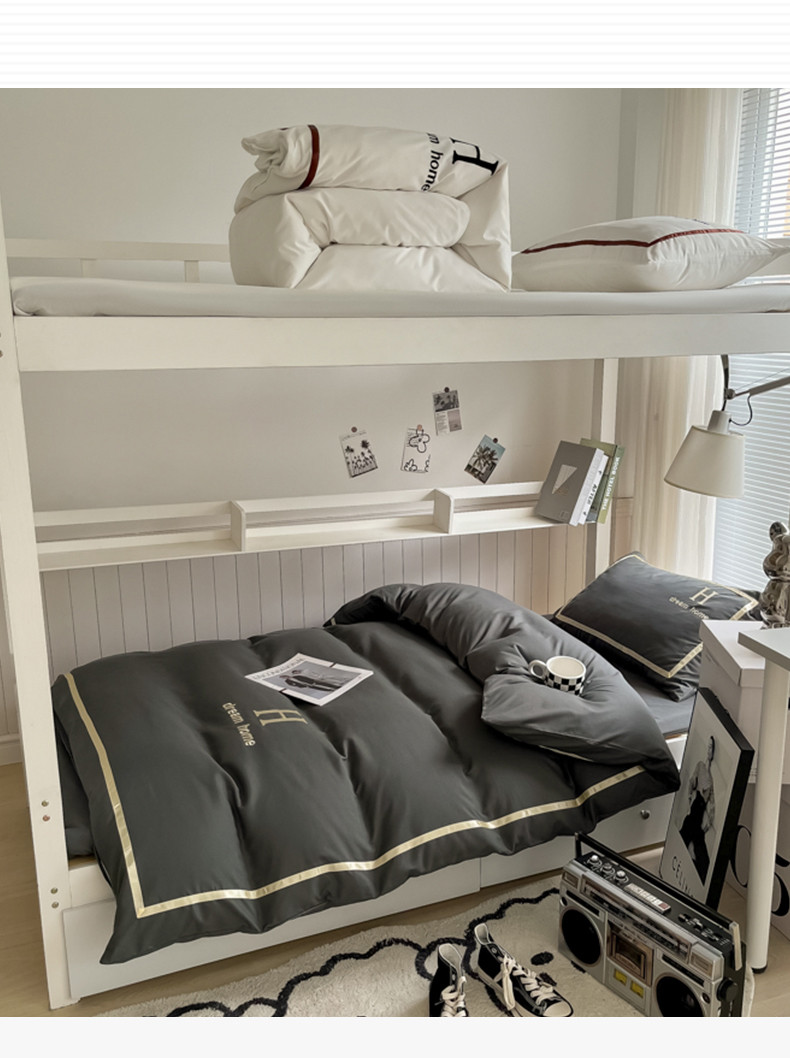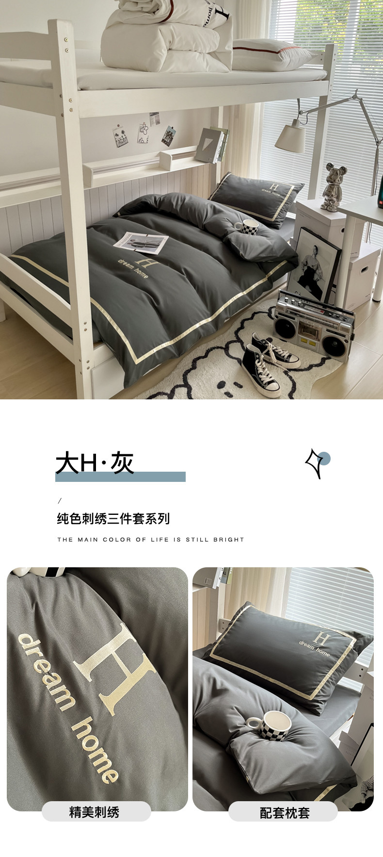 (总)千希家纺 2023新款水洗棉磨毛刺绣学生季上下铺宿舍三件套-大H款