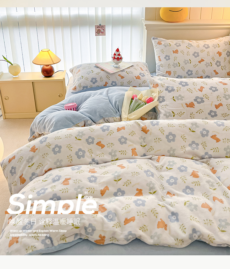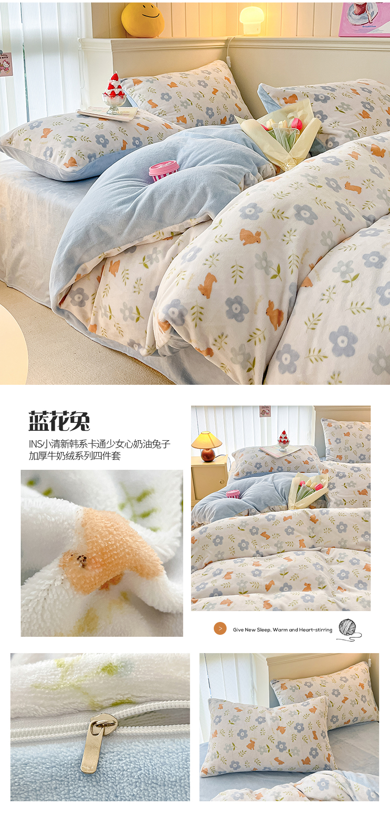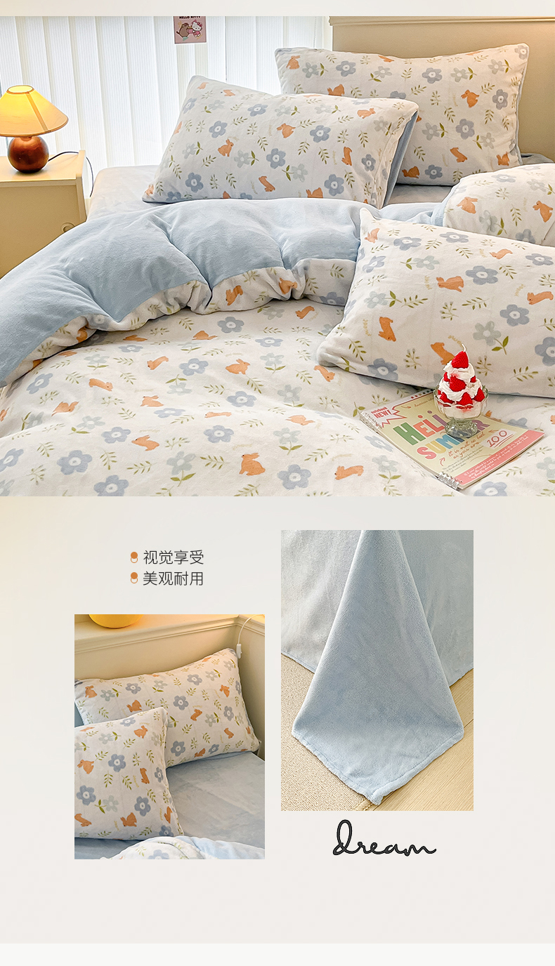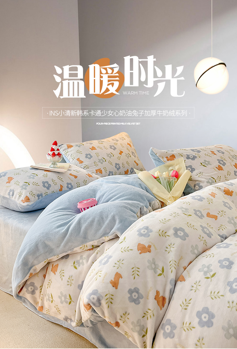 桃子 2023新款ins小清新韩系卡通少女心奶油兔子加厚牛奶绒系列四件套-第一批 绒-蓝花兔
