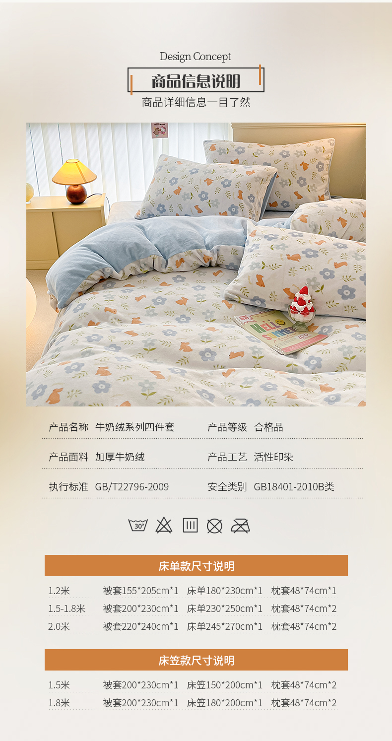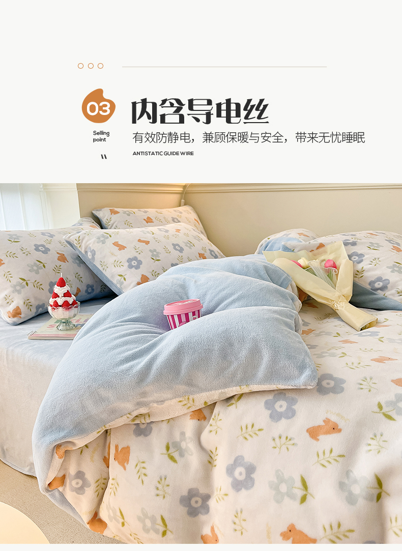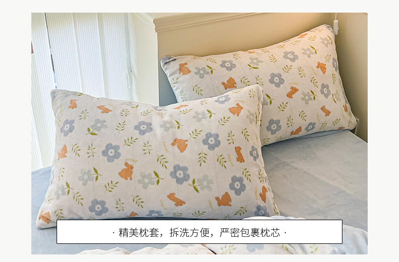 商品名称:桃子 2023新款ins小清新韩系卡通少女心奶油兔子加厚牛奶绒系列四件套-第一批 绒-蓝花兔