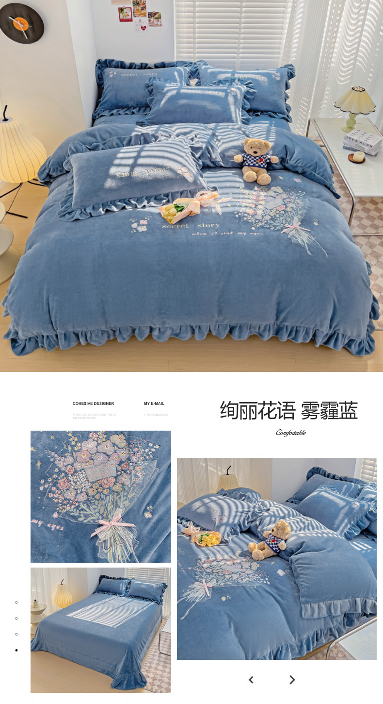 (总)星尚家纺 2024新款全消光A类230g牛奶绒韩版绣花绒四件套-绚丽花语,豆沙粉,浪漫紫,雾霾蓝,樱花粉,晨雾绿