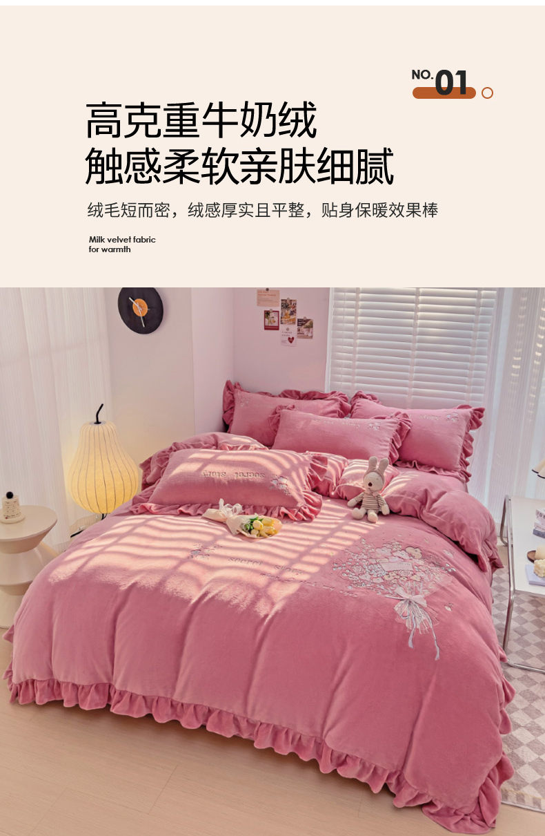 (总)星尚家纺 2024新款加厚保暖全消光牛奶绒夹棉床裙四件套-玫瑰之恋,粉玉,寐紫,浅蓝,水绿