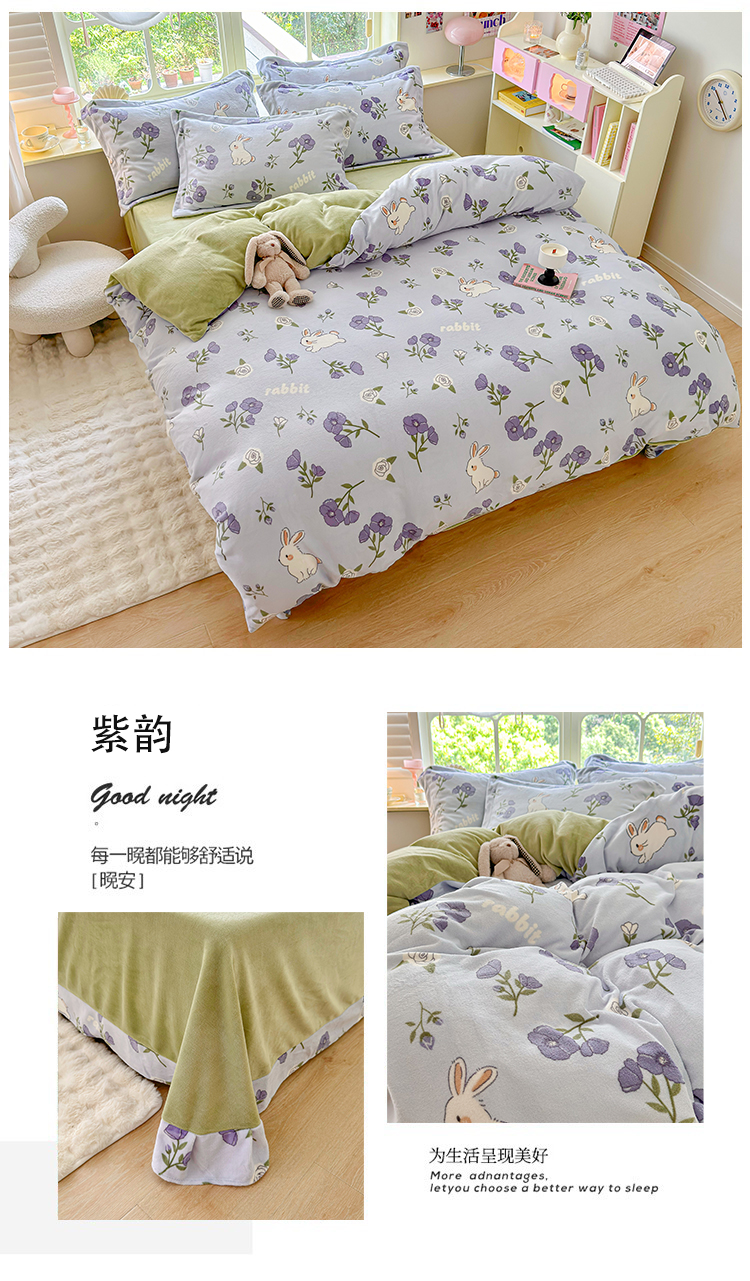 商品名称:呗旺鹿 2023新款高克重加厚印花牛奶绒四件套直播 紫韵