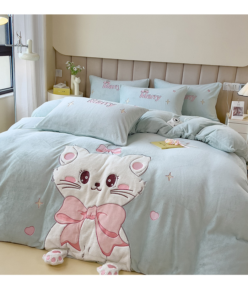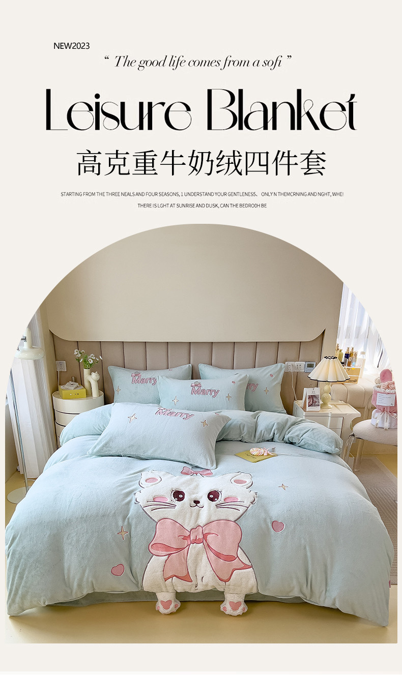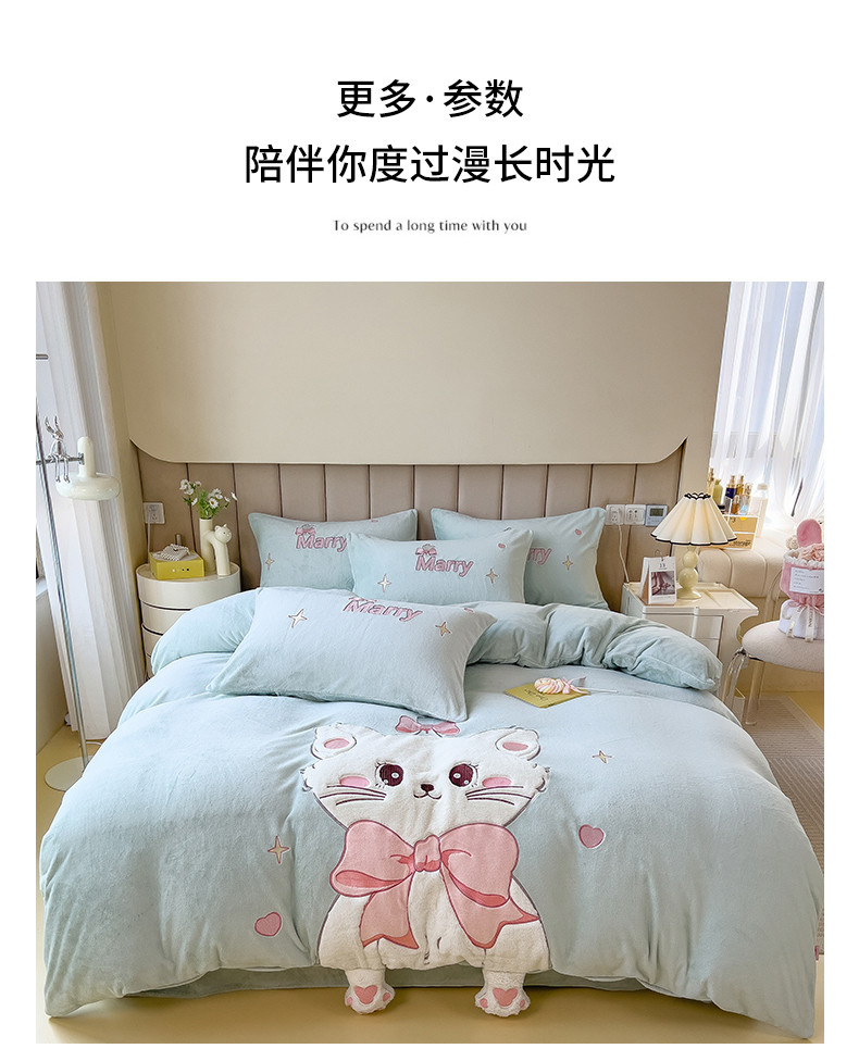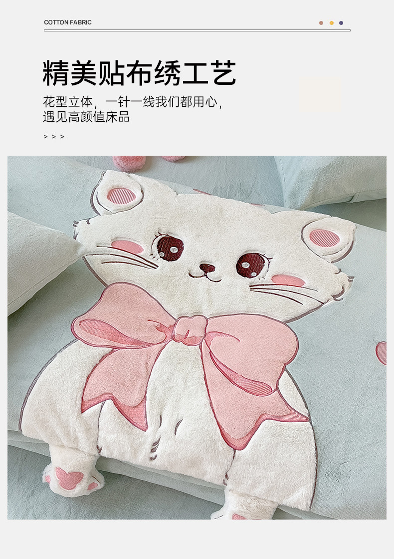 (总)金绣美居 2025新款卡通贴布绣款牛奶绒四件套-招财猫,招财猫-蓝,招财猫-粉