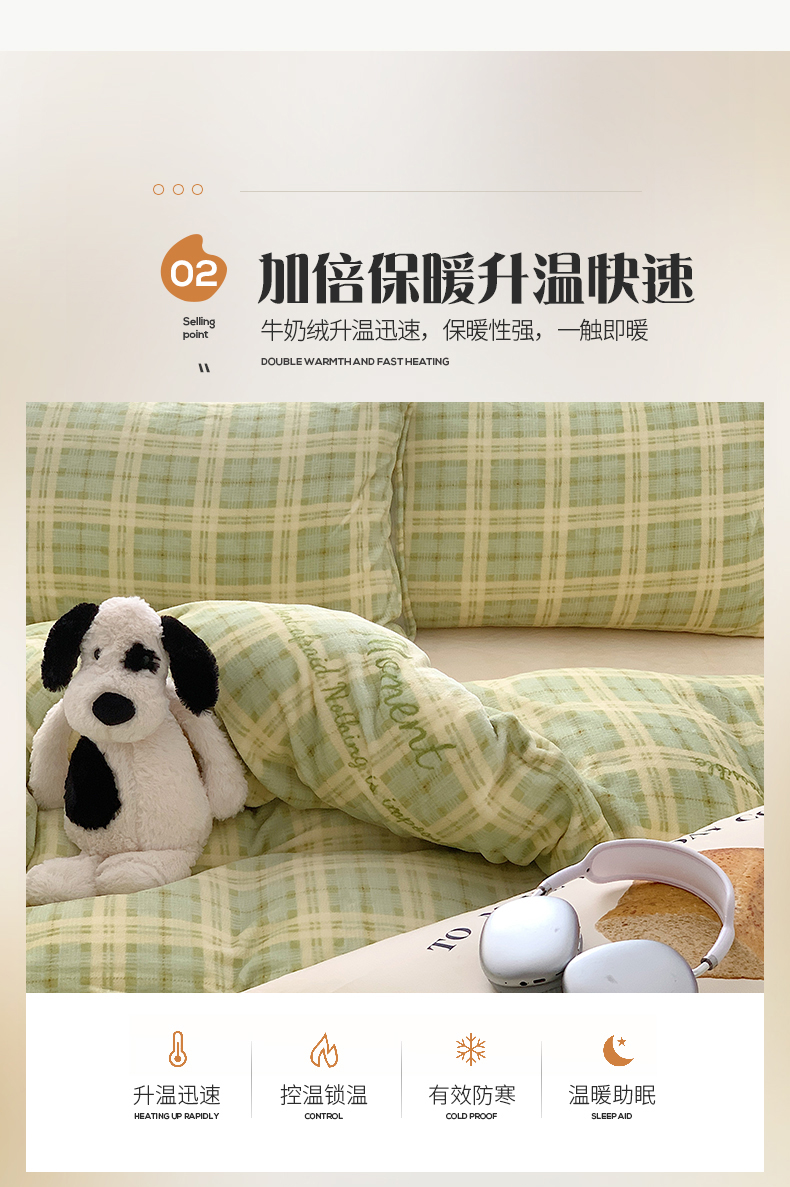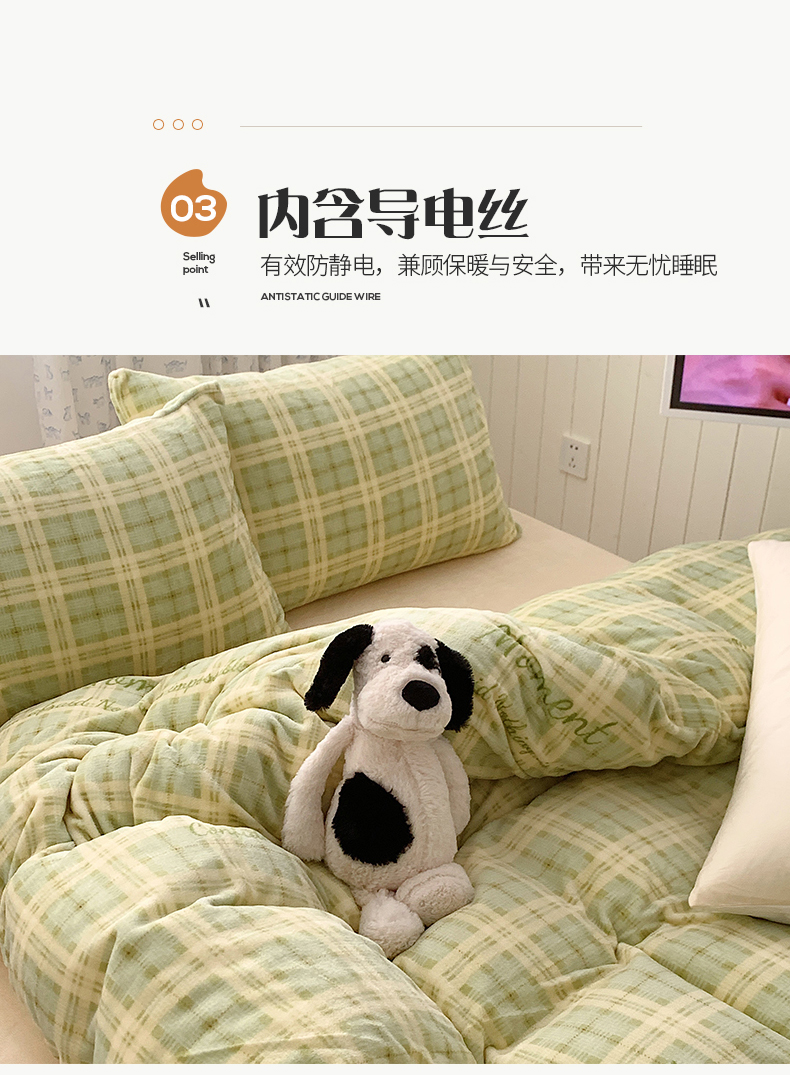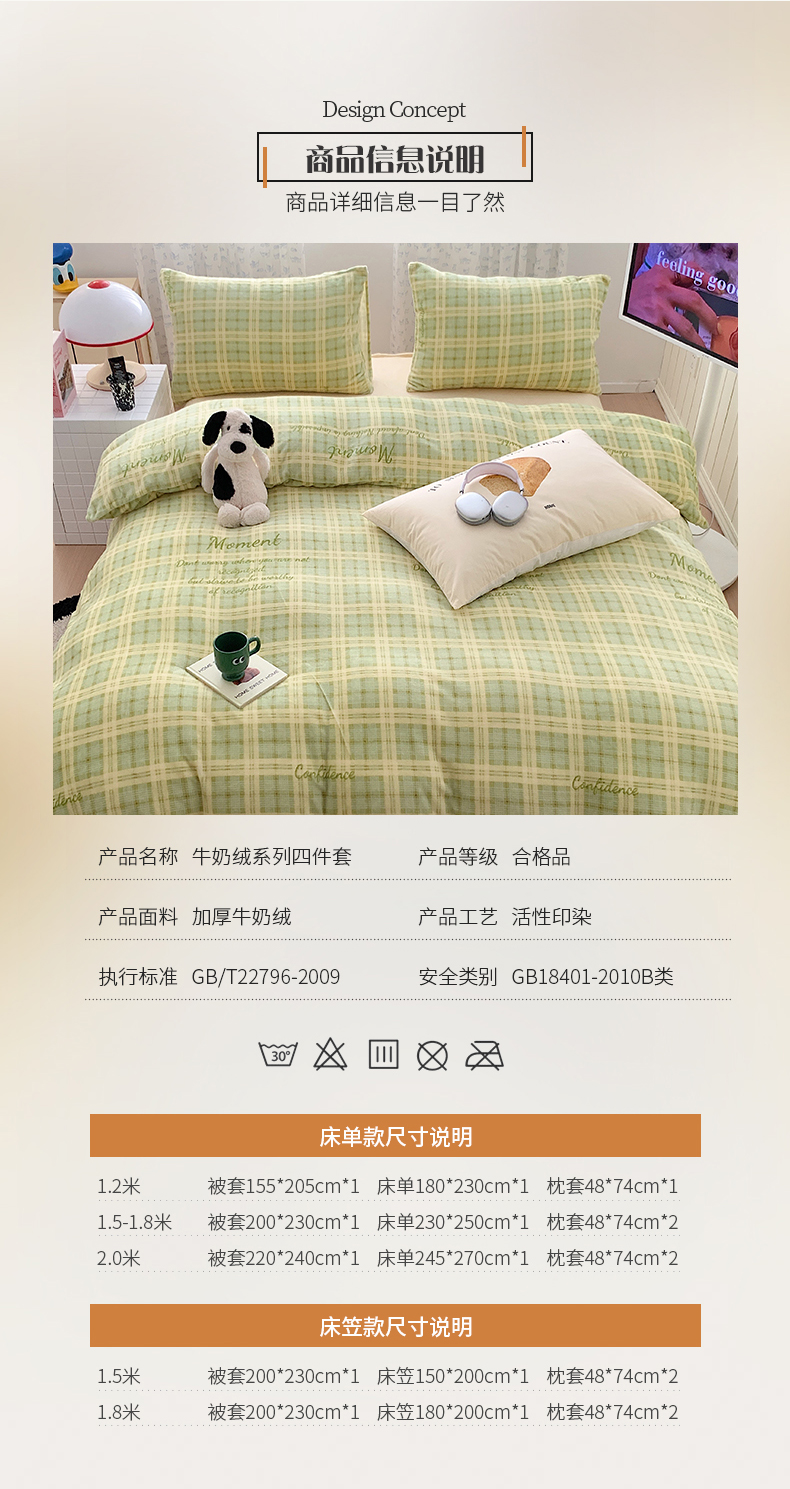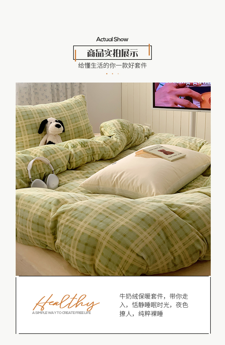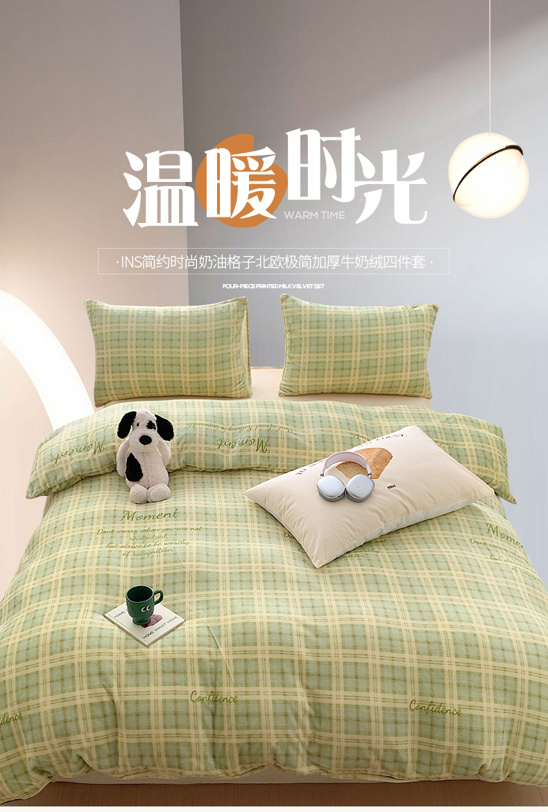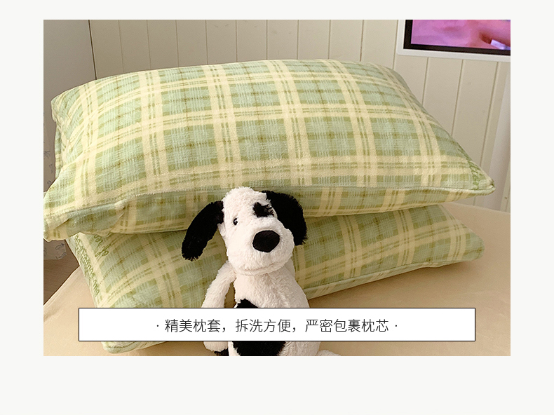 商品名称:桃子家居 2023新款ins简约时尚奶油格子北欧极简加厚牛奶绒四件套 冰淇淋格奶绿