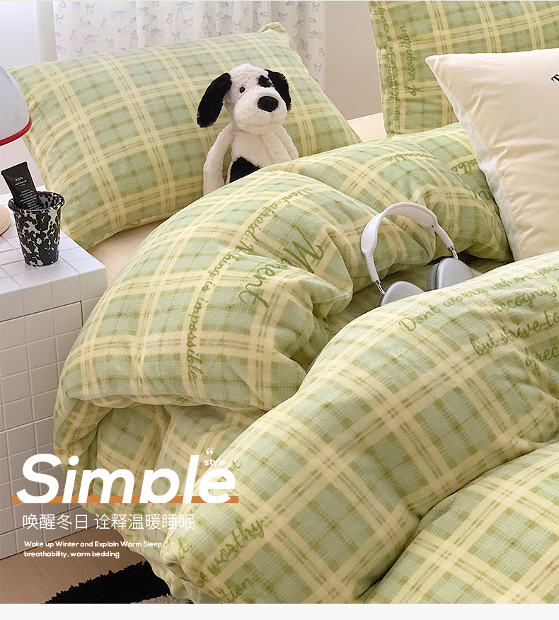 桃子家居 2023新款ins简约时尚奶油格子北欧极简加厚牛奶绒四件套 冰淇淋格奶绿
