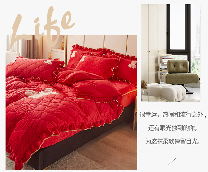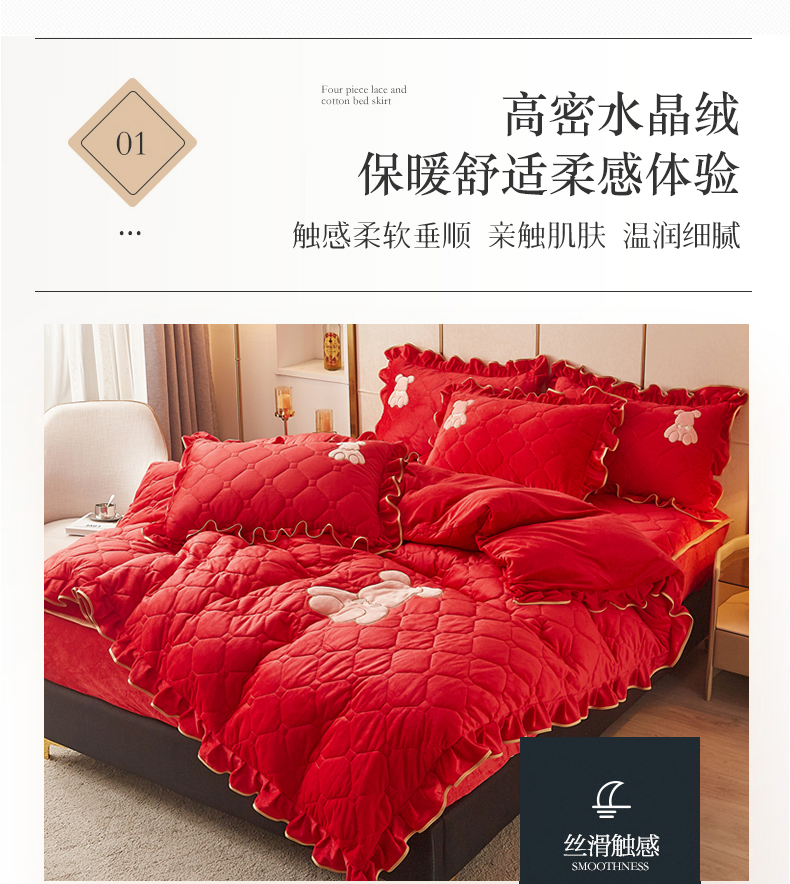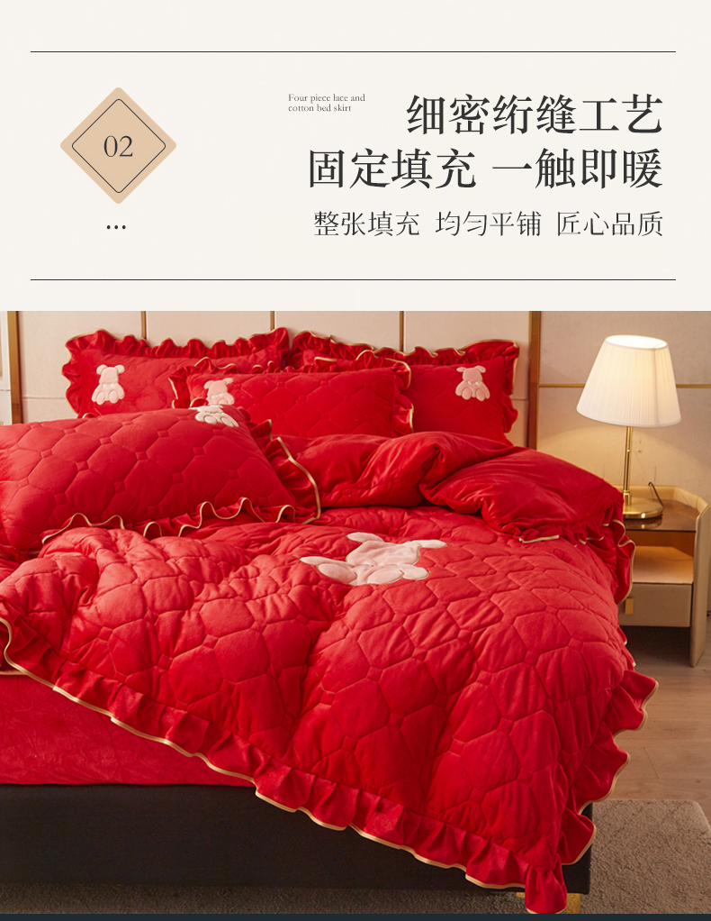 (总)屹成家纺2025新款水晶绒夹棉绗缝床裙四件套(塞纳河畔)四件套起售价不低于230元,大红,豆沙,翡翠绿,粉玉,橄榄绿,蔚蓝,银灰