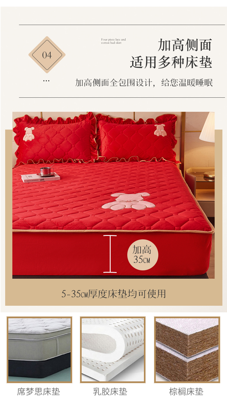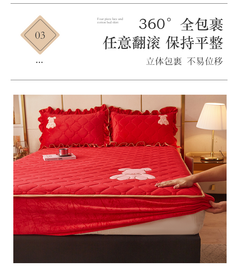 (总)屹成家纺2025新款水晶绒夹棉绗缝蕾丝床裙三件套(塞纳河畔)床裙单件起售价不低于105元,大红,豆沙,翡翠绿,粉玉,橄榄绿,蔚蓝,银灰