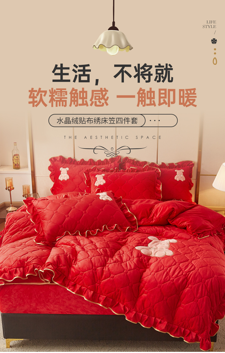 商品名称:屹成 2024新款水晶绒夹棉床笠款四件套贴布绣款-小熊款 典雅红