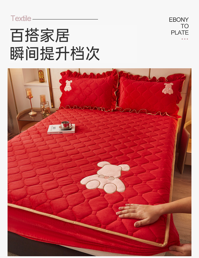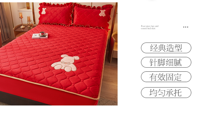 屹成 2024新款水晶绒夹棉床笠款四件套贴布绣款-小熊款 典雅红