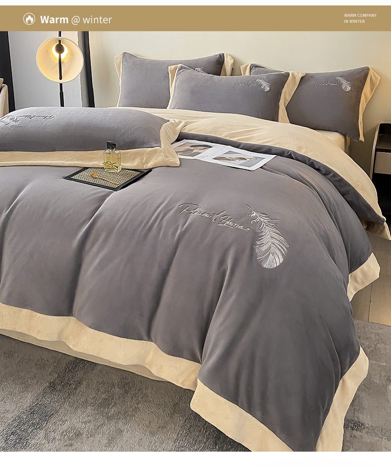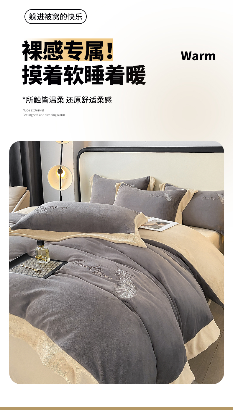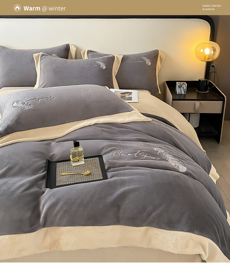 露梦家纺 2025新款加厚保暖牛奶绒刺绣款四件套-轻羽(风格二) 轻羽-高极灰