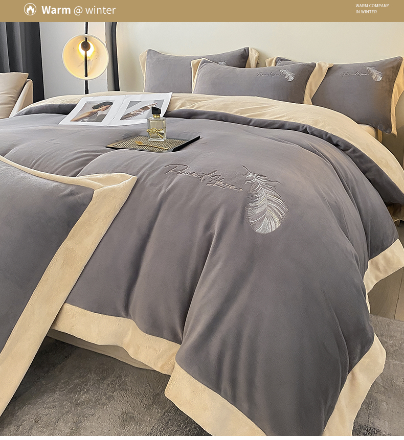 露梦家纺 2025新款加厚保暖牛奶绒刺绣款四件套-轻羽(风格二) 轻羽-银河灰,轻羽-银河灰