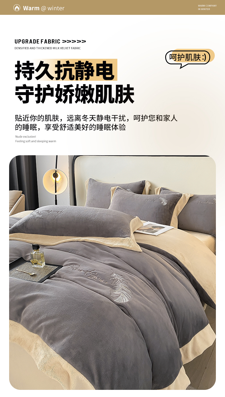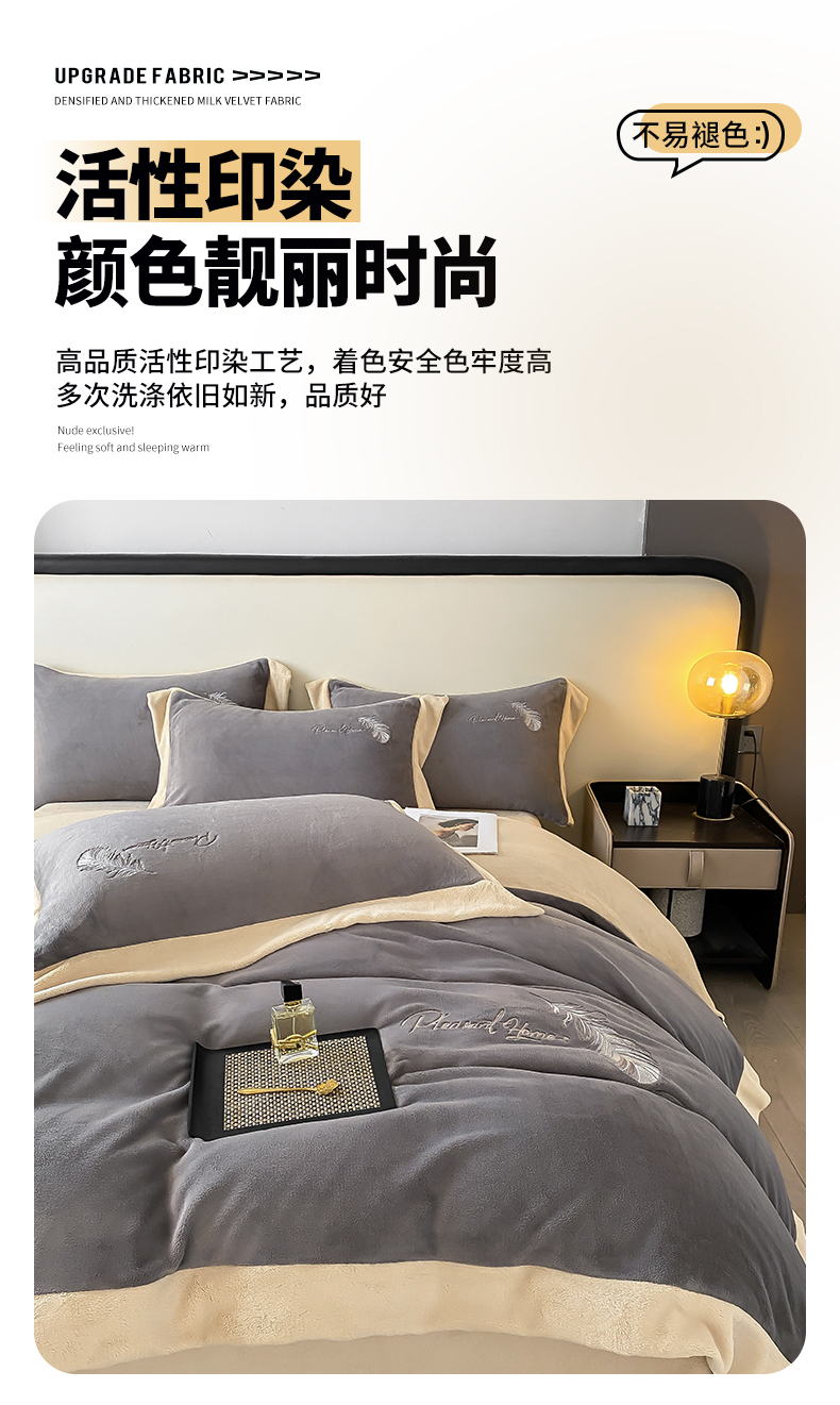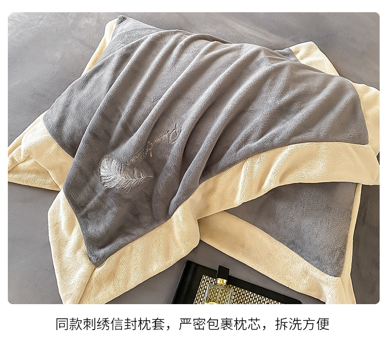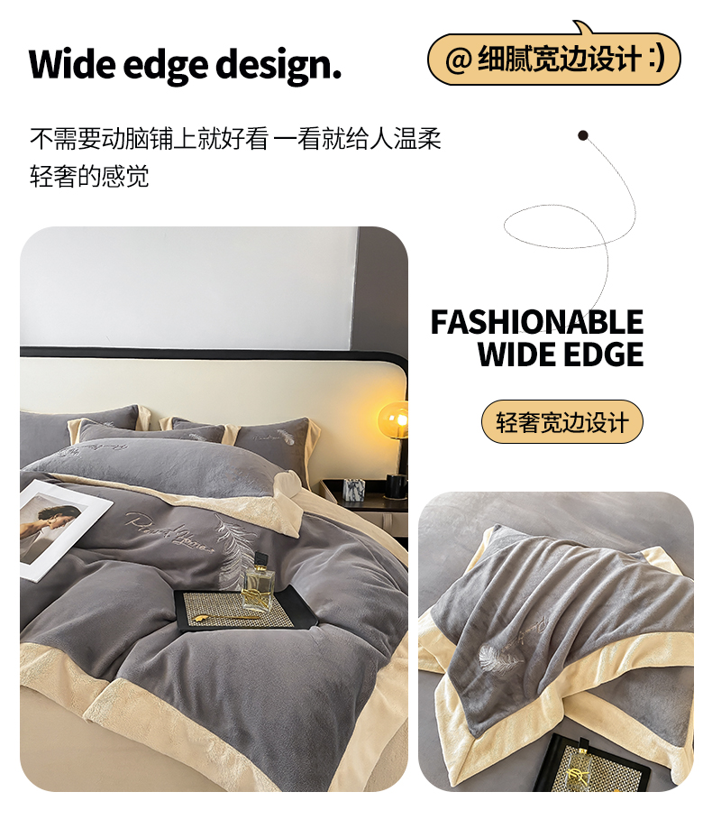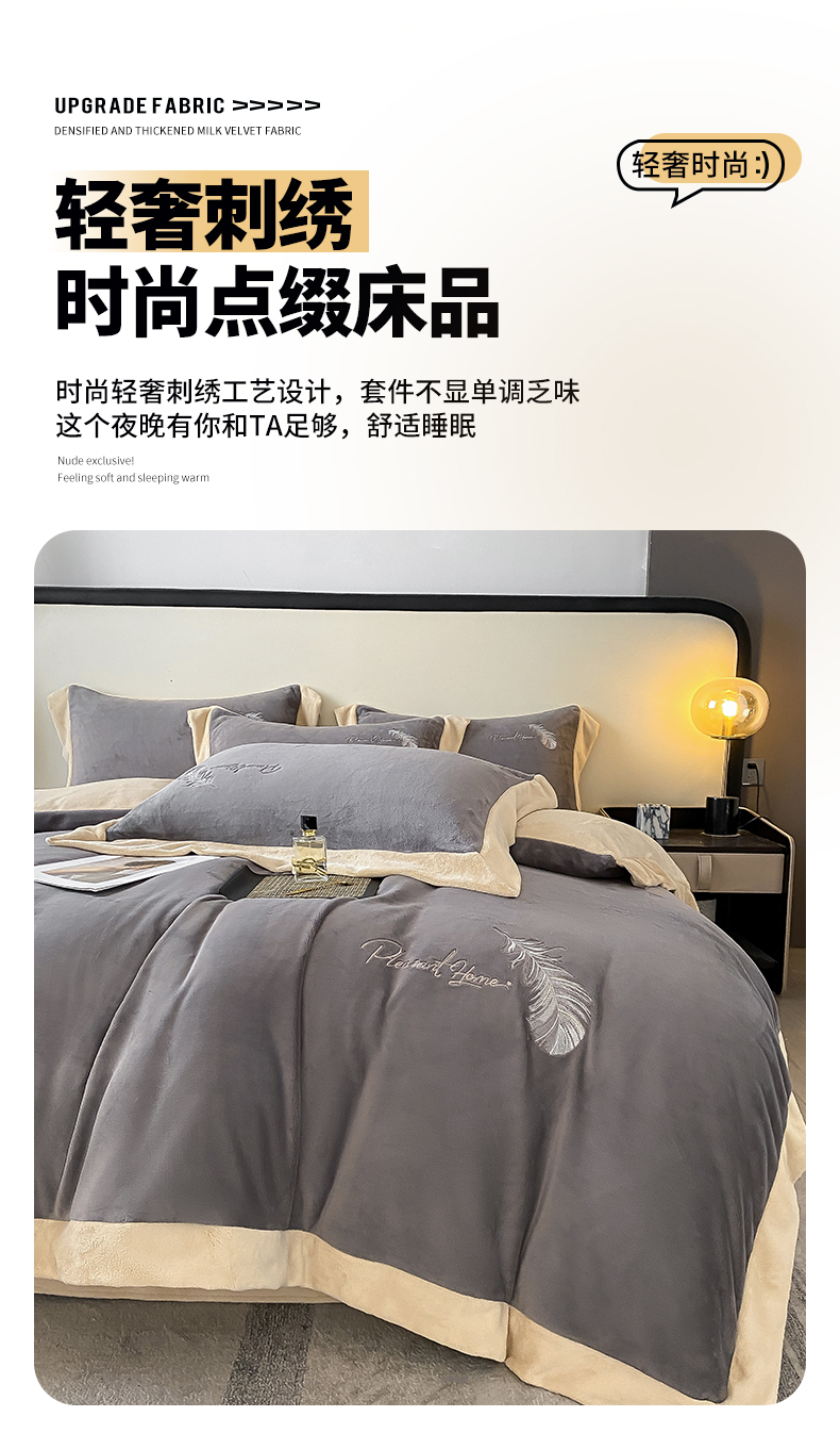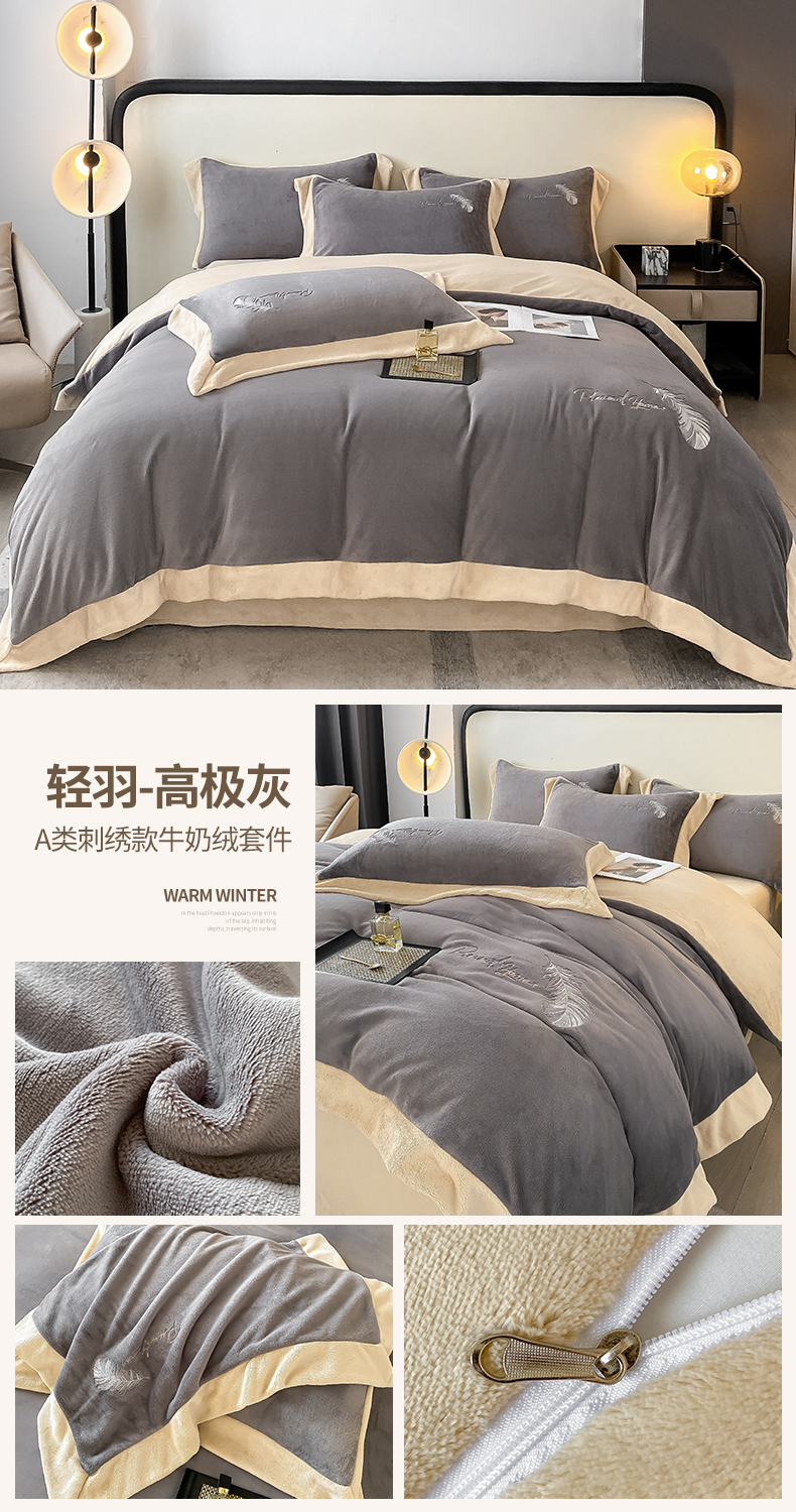 商品名称:露梦家纺 2025新款加厚保暖牛奶绒刺绣款四件套-轻羽(风格二) 轻羽-高极灰