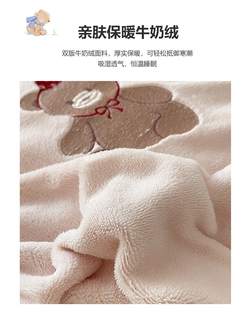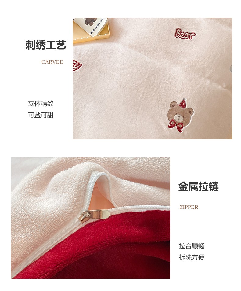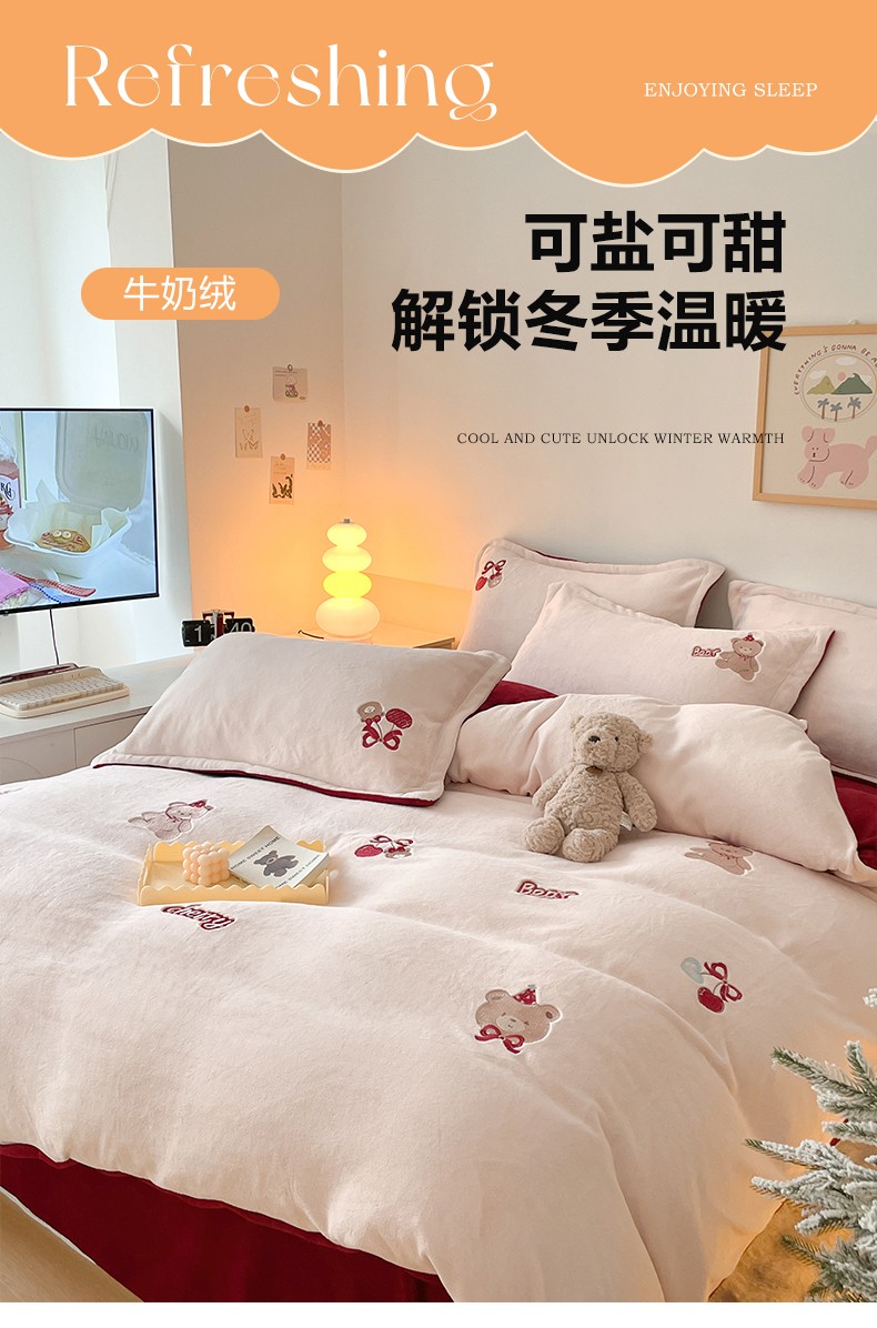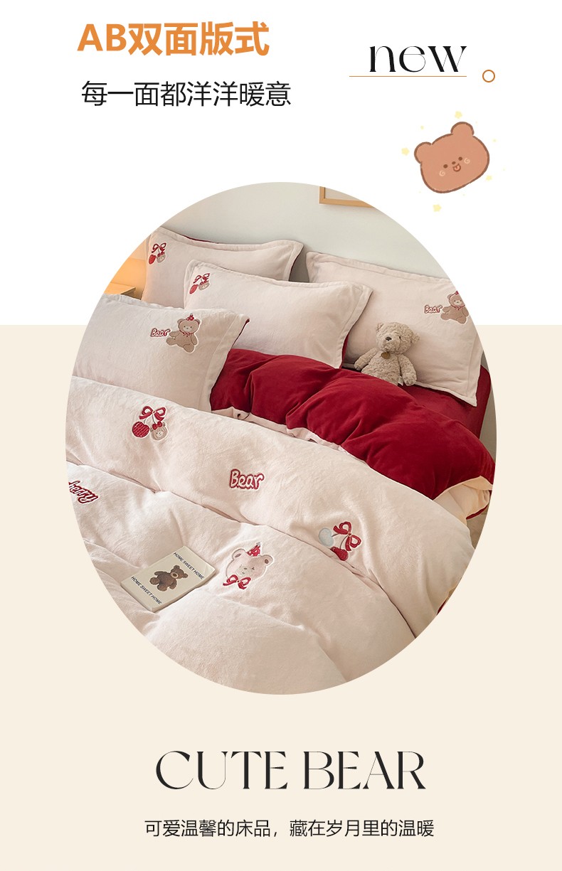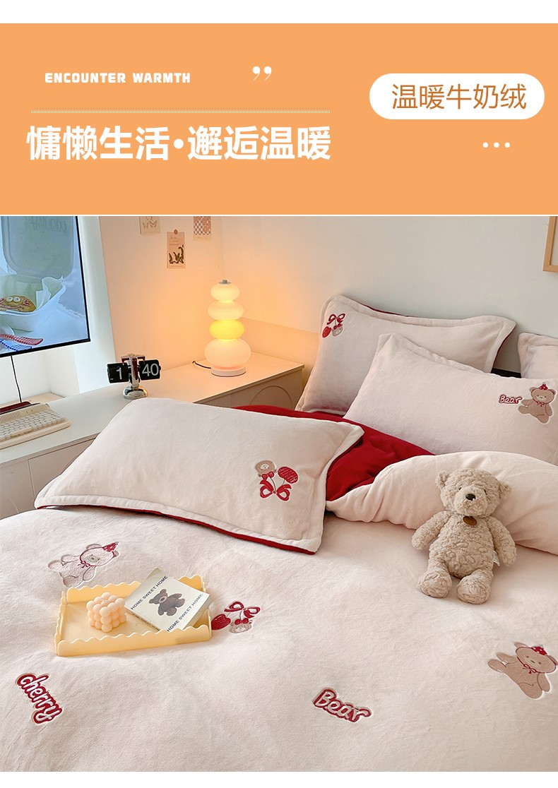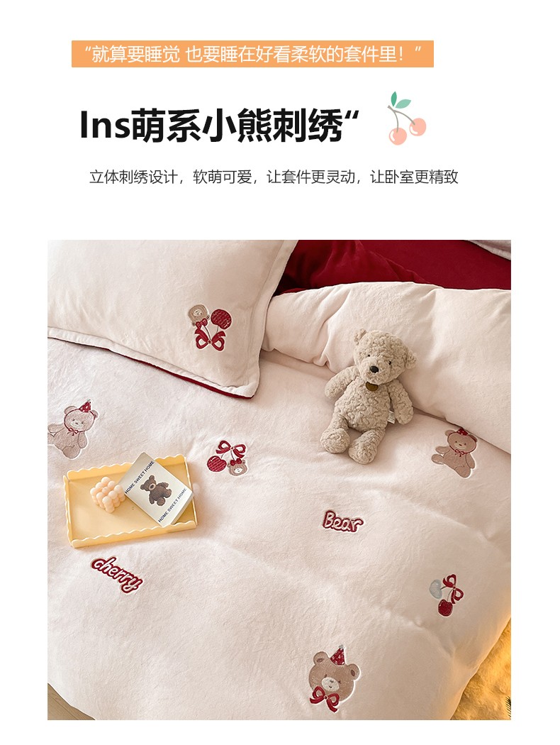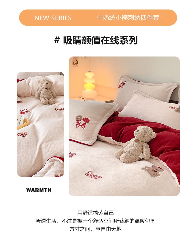 23直播新款秋冬高克重刺绣牛奶绒四件套小熊系列提供买家秀 小熊大红双拼