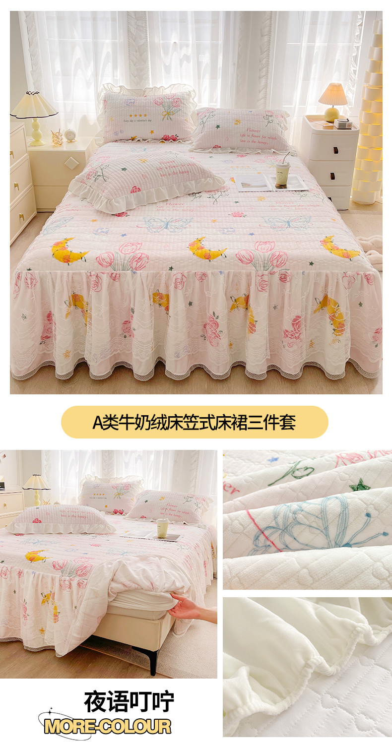 • 91家纺网 家纺一手货源 找家纺 宜凡家纺 2023新款牛奶绒印花夹棉被套床笠式床裙三件套 夜语叮咛