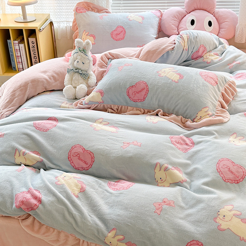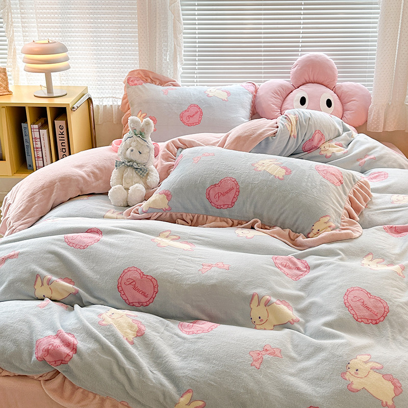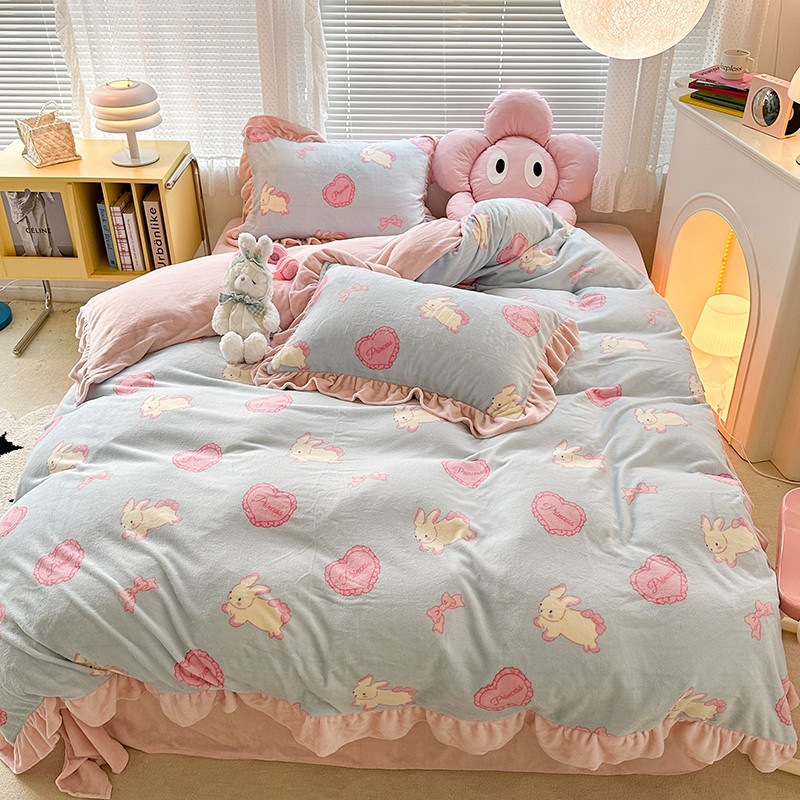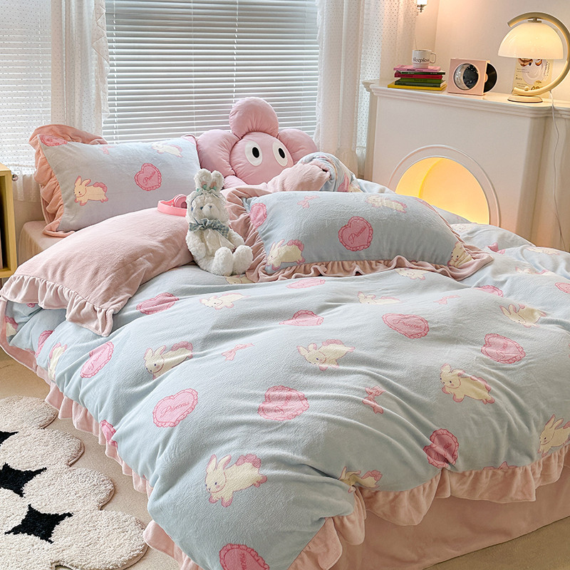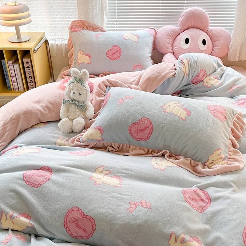 昔可 2023新款韩系ins花边款牛奶绒四件套 萝莉爱心兔
