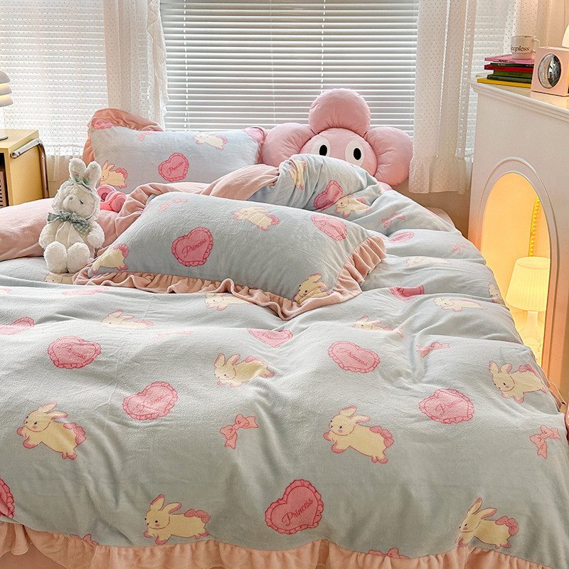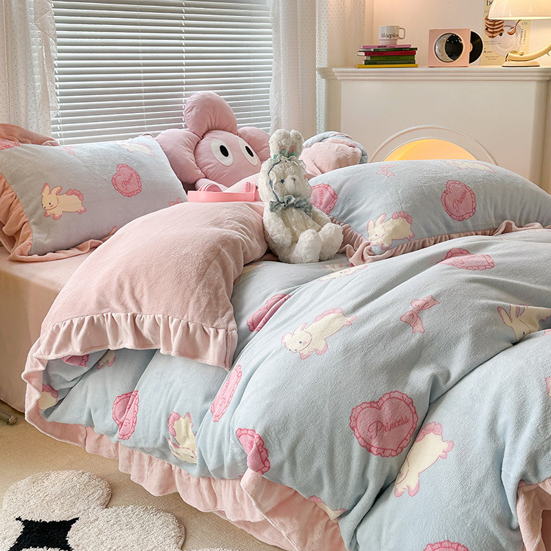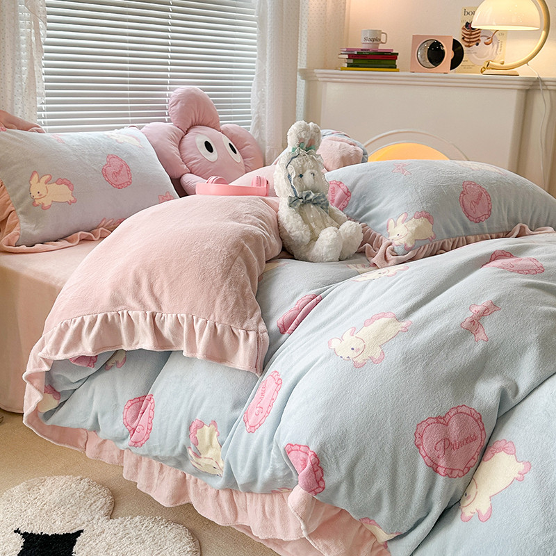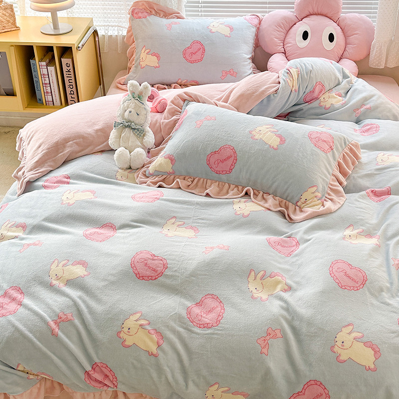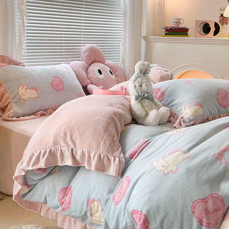昔可 2023新款韩系ins花边款牛奶绒四件套 萝莉爱心兔