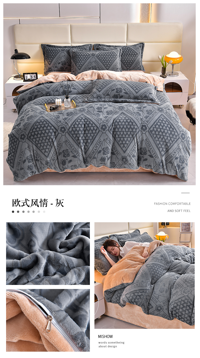商品名称:畅畅家纺 2024新款高克重8斤加厚牛奶绒6D雕花绒印花水晶绒金貂绒法莱绒四件套 欧式风情-灰
