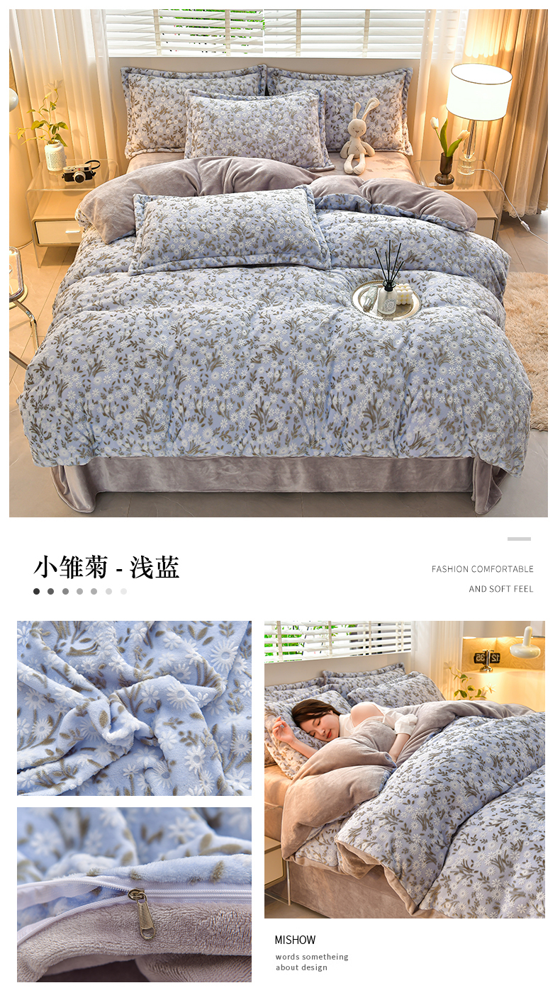 商品名称:畅畅家纺 2024新款高克重8斤加厚牛奶绒6D雕花绒印花水晶绒金貂绒法莱绒四件套 小雏菊-浅蓝