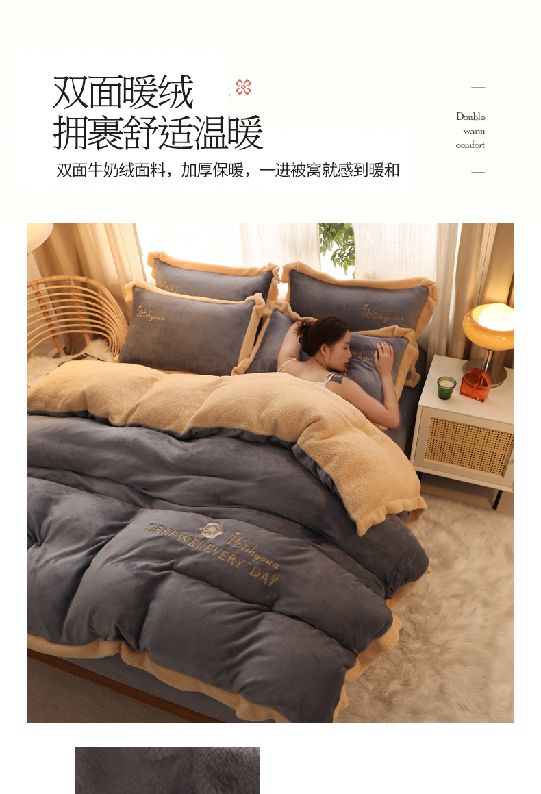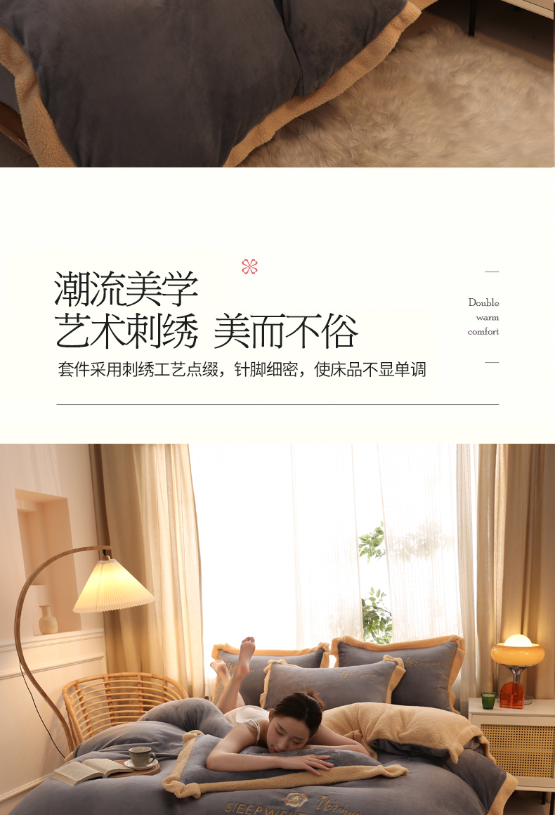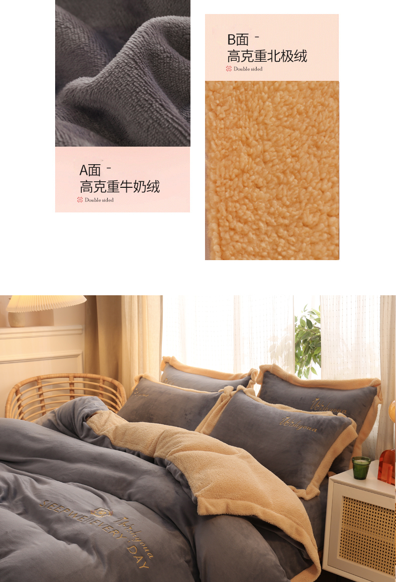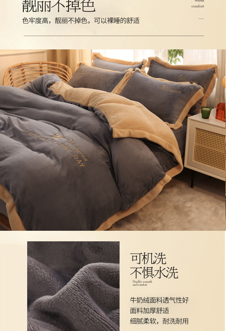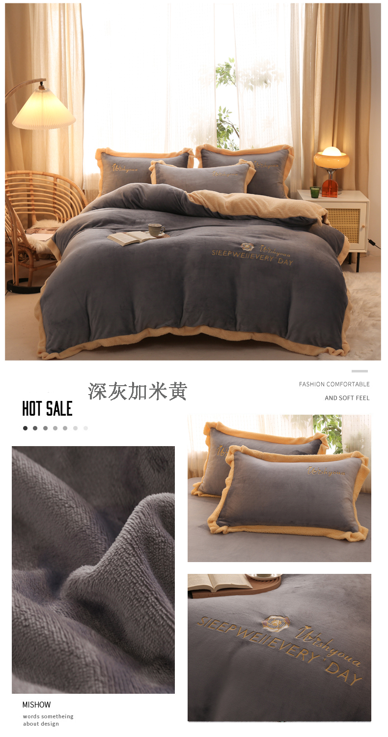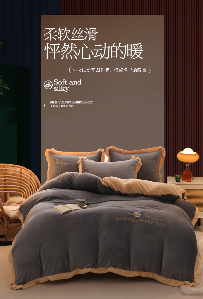 当前位置: 91家纺网 > 商品网购 > 床品套件 > 四件套 > 牛奶绒四件套 > 啊雅家居 2026新款绣花牛奶绒加羊羔绒四件套 深灰加米黄