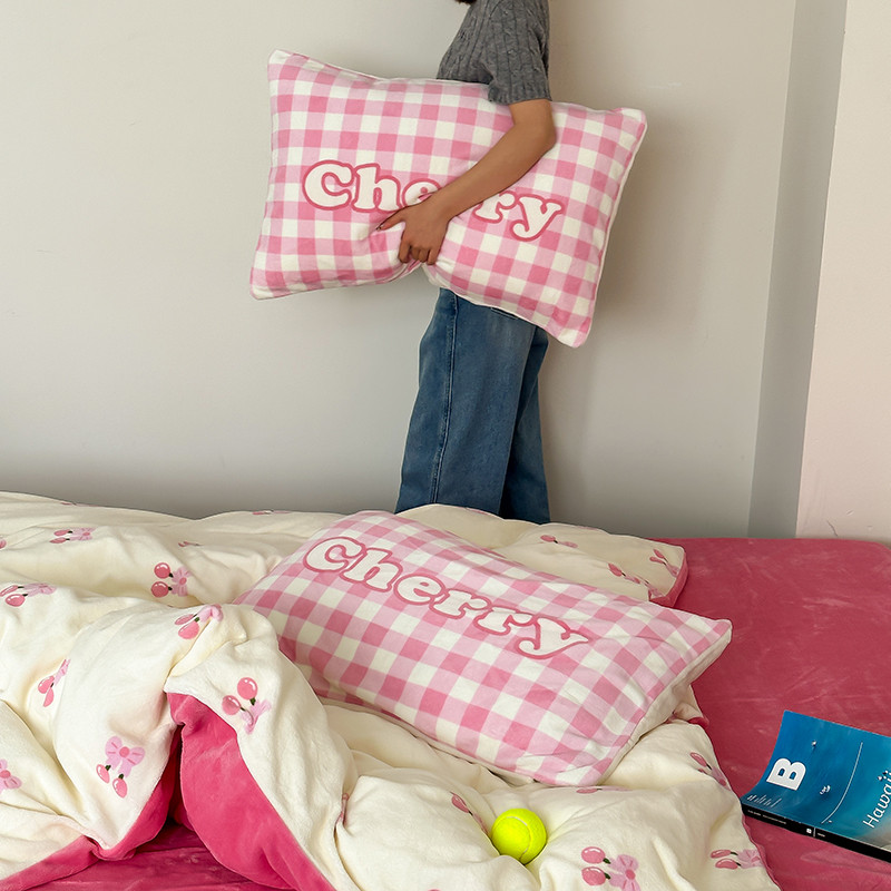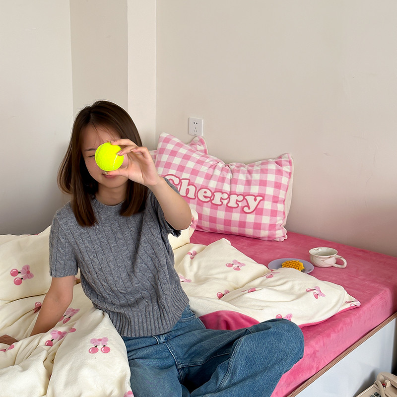 昔可 2023新款大版印花枕套牛奶绒系列四件套-模特图 一口樱桃