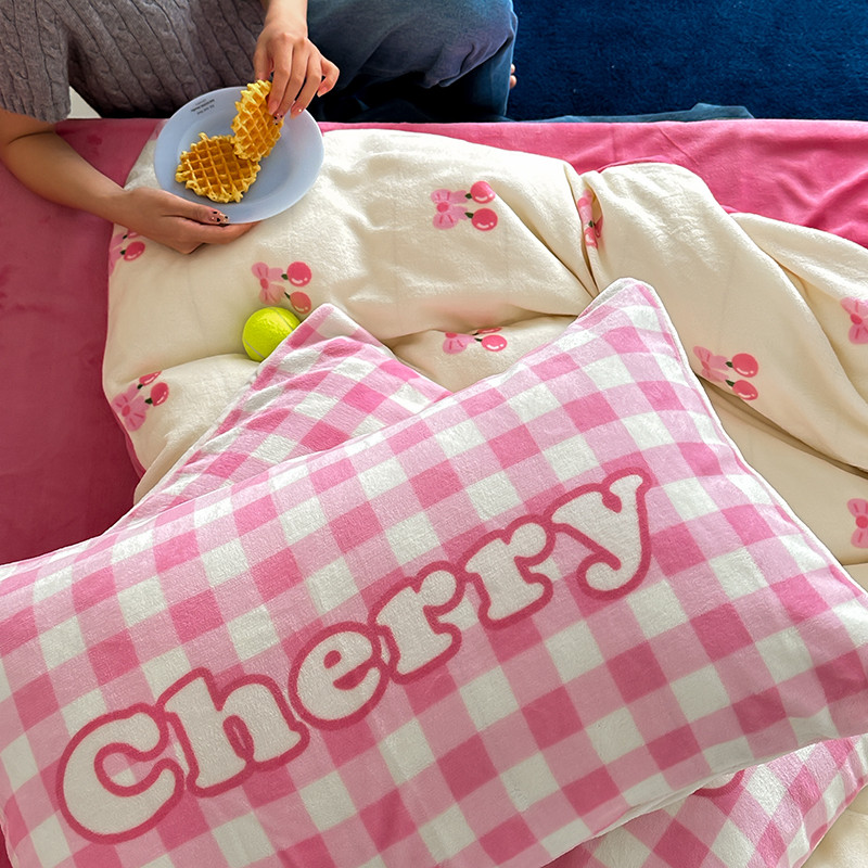 商品名称:昔可 2023新款大版印花枕套牛奶绒系列四件套-模特图 一口樱桃