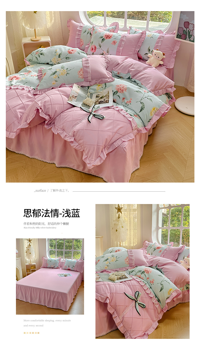 金米诺 2024新款蝴蝶结韩版蕾丝花边床裙四件套 思郁法情-浅蓝