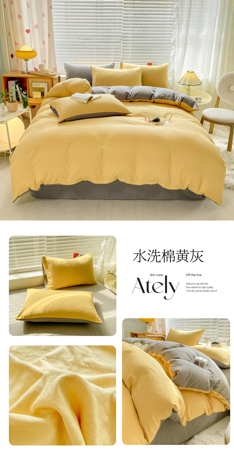 当前位置: 91家纺网 > 商品网购 > 床品套件 > 四件套 > 水洗棉四件套 > 雨帆家纺 2024新款简约亲肤水洗棉双拼四件套 水洗棉黄灰