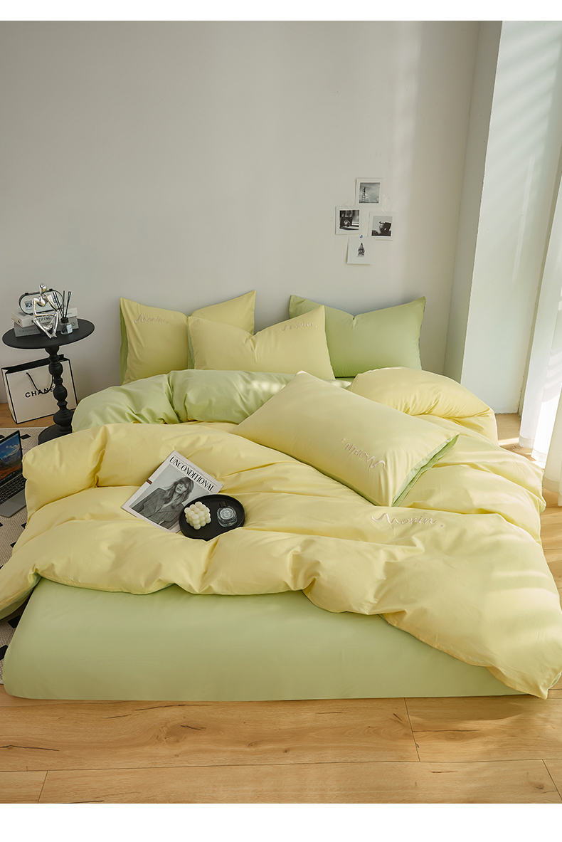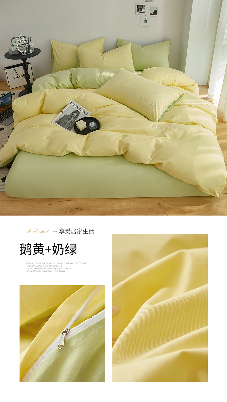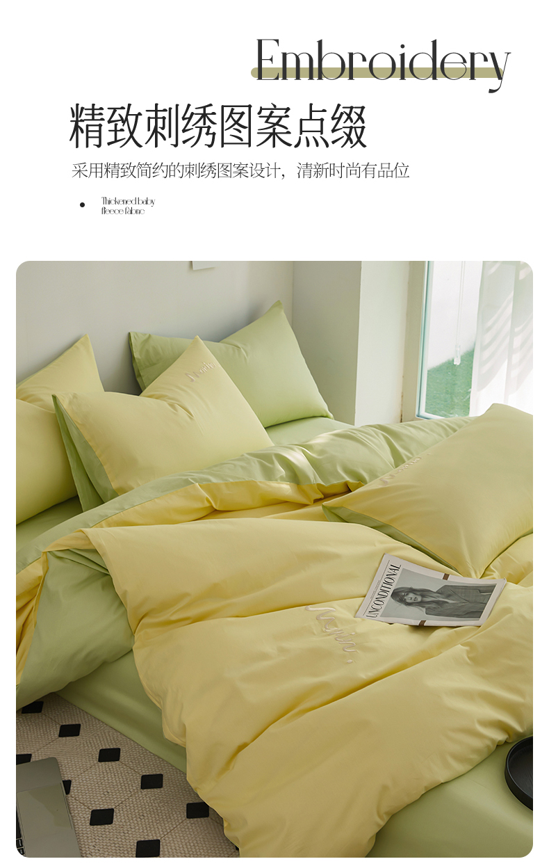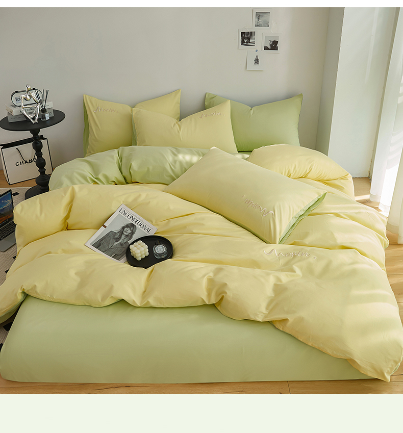 多品家纺 2024新款全棉纯色绣花四件套 鹅黄+奶绿