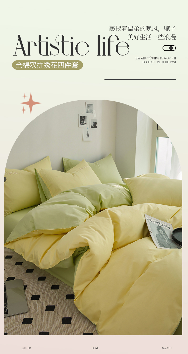 商品名称:多品家纺 2024新款全棉纯色绣花四件套 鹅黄+奶绿
