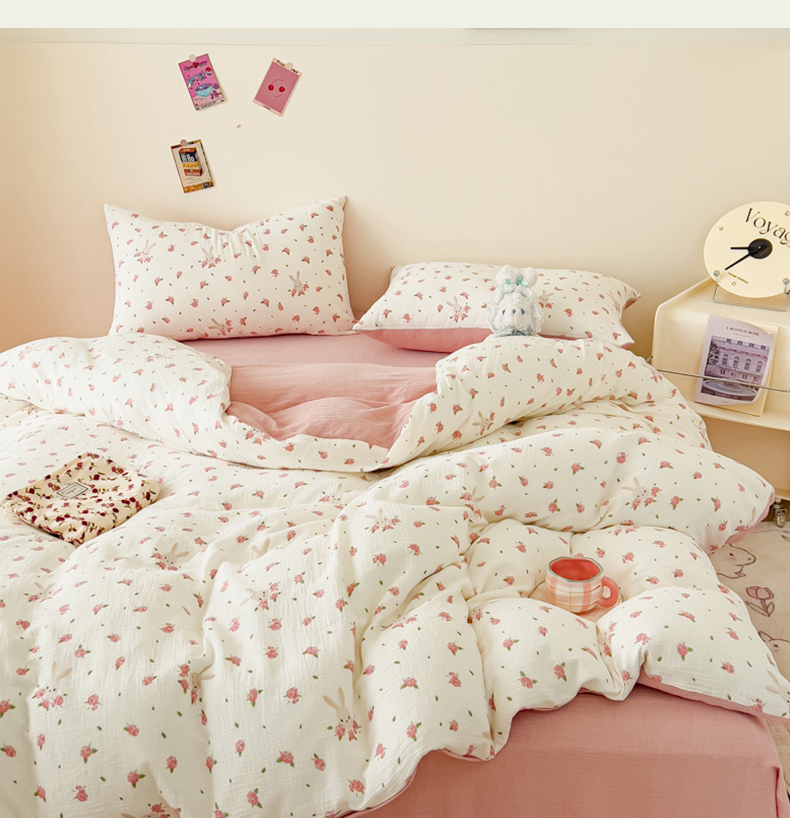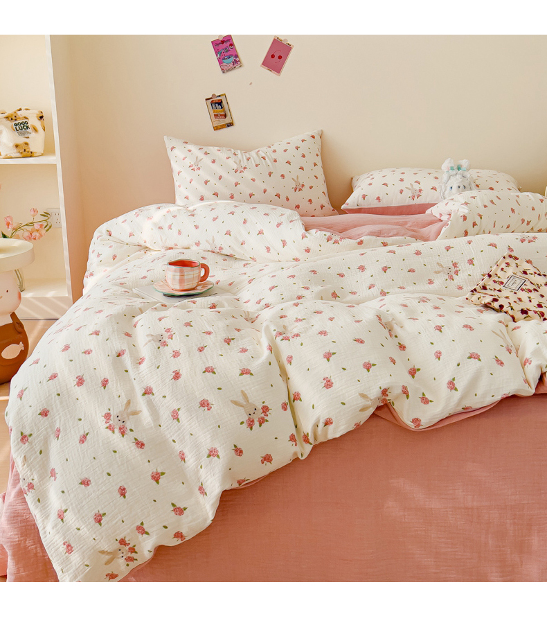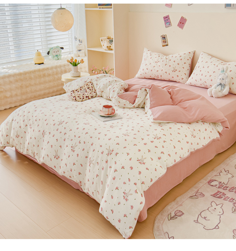 木楌 2025新款全棉A类皱皱纱印花四件套 花与兔