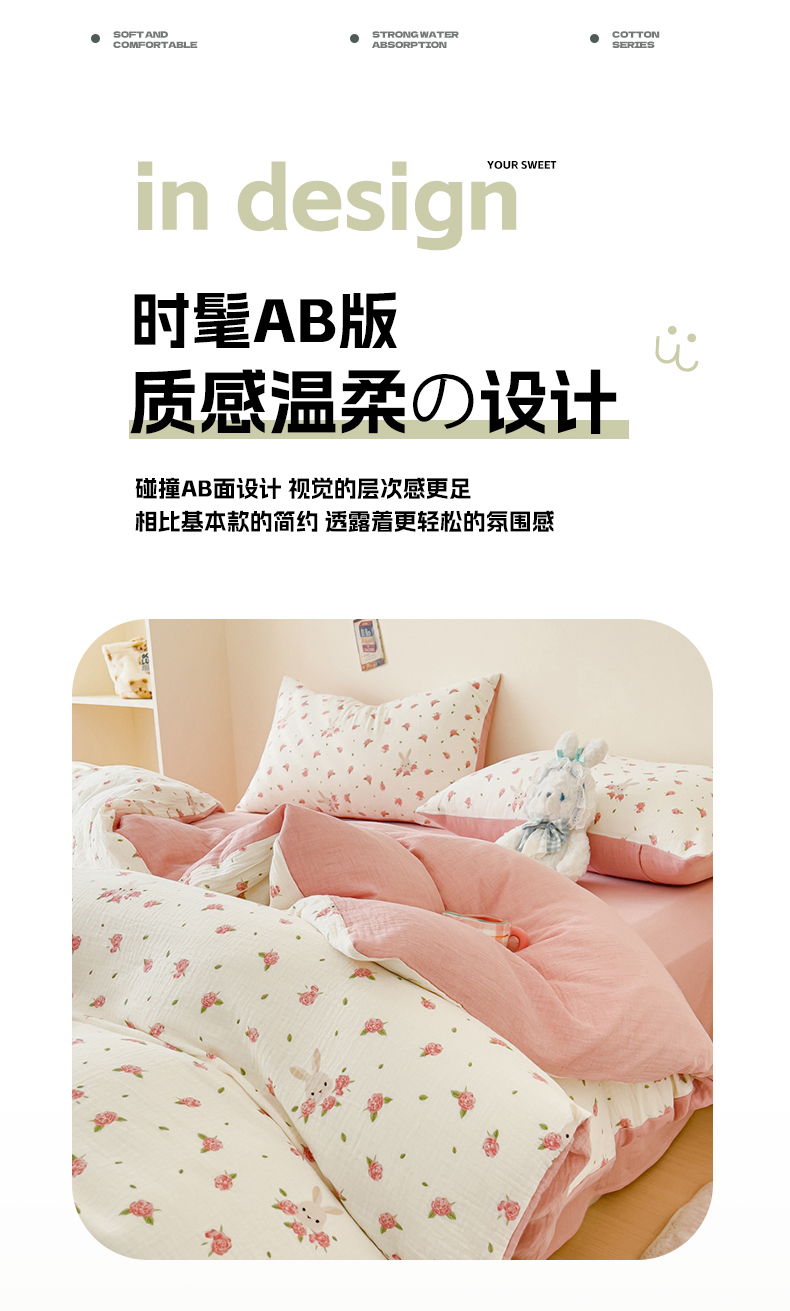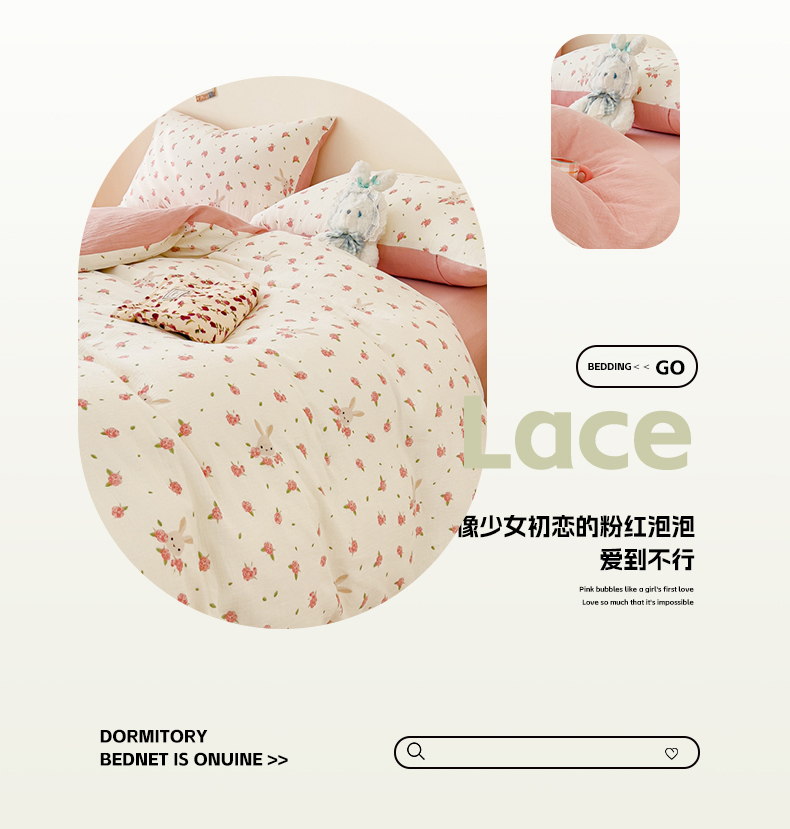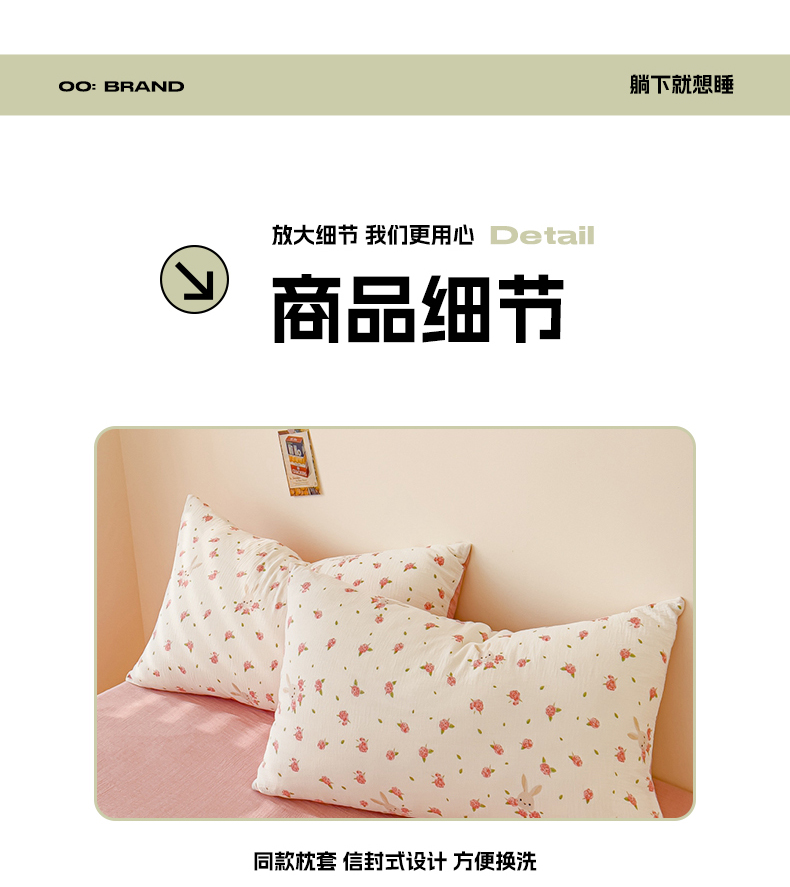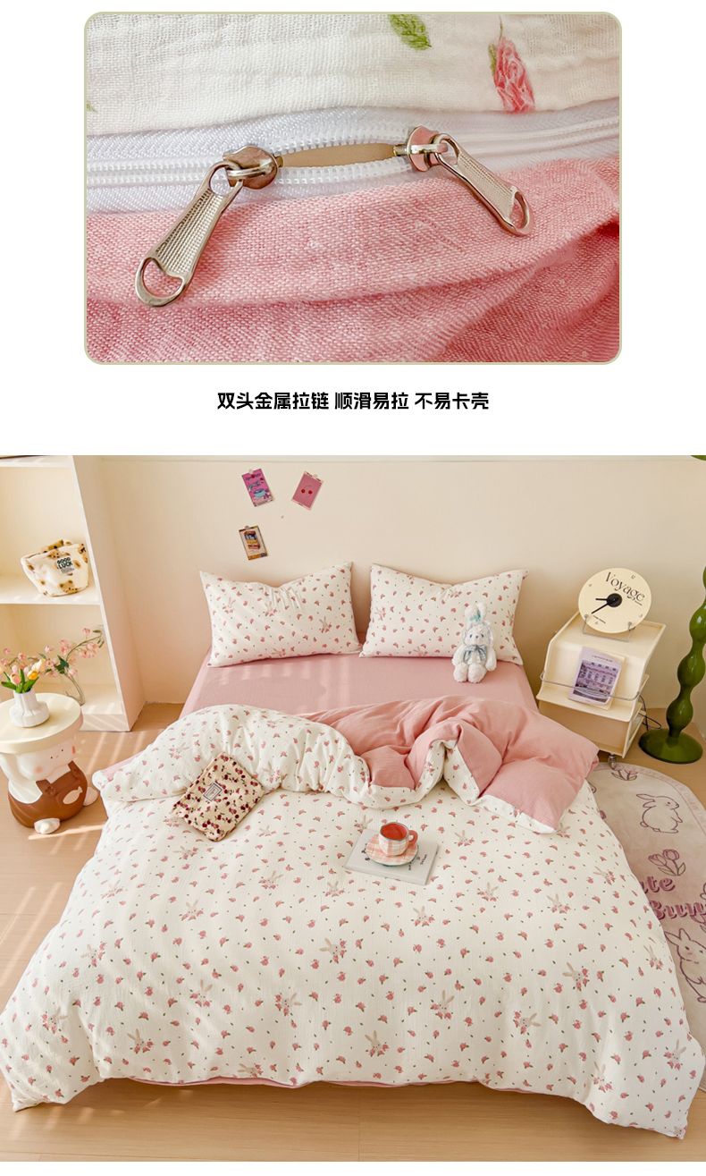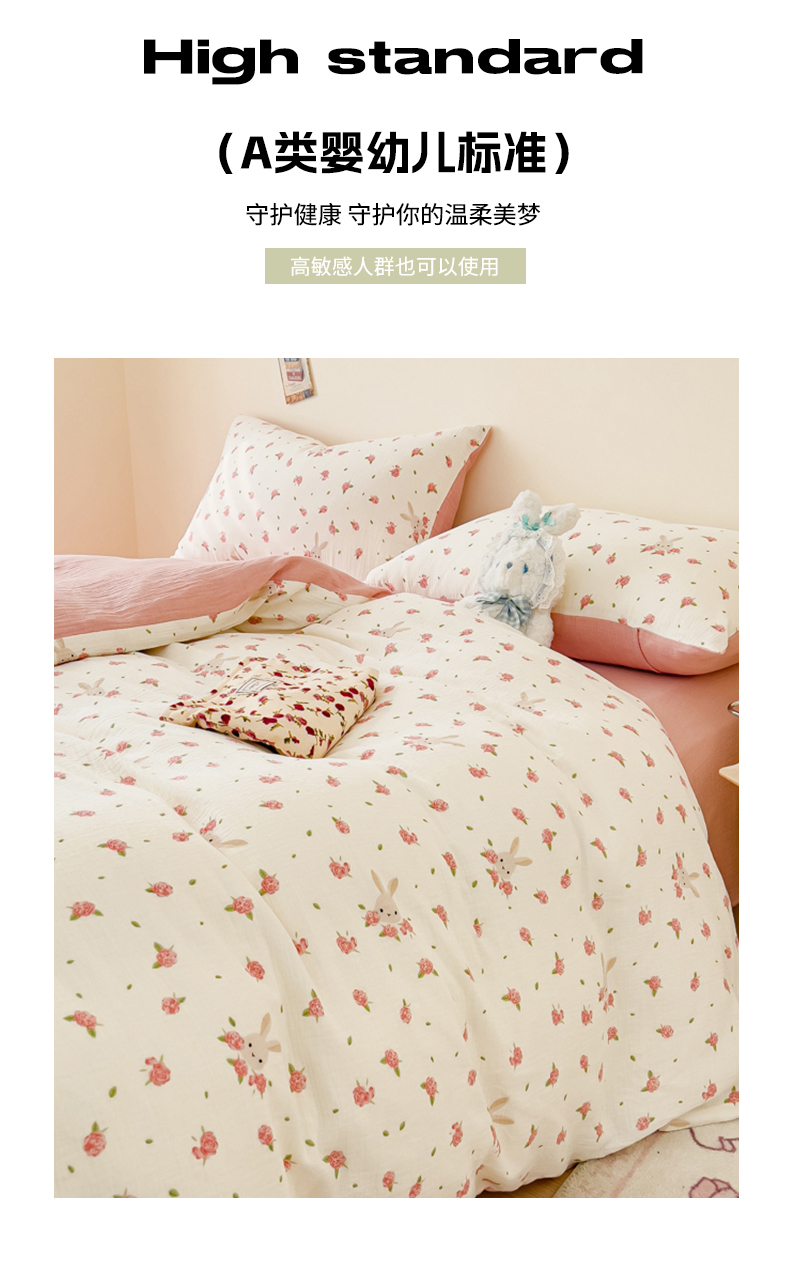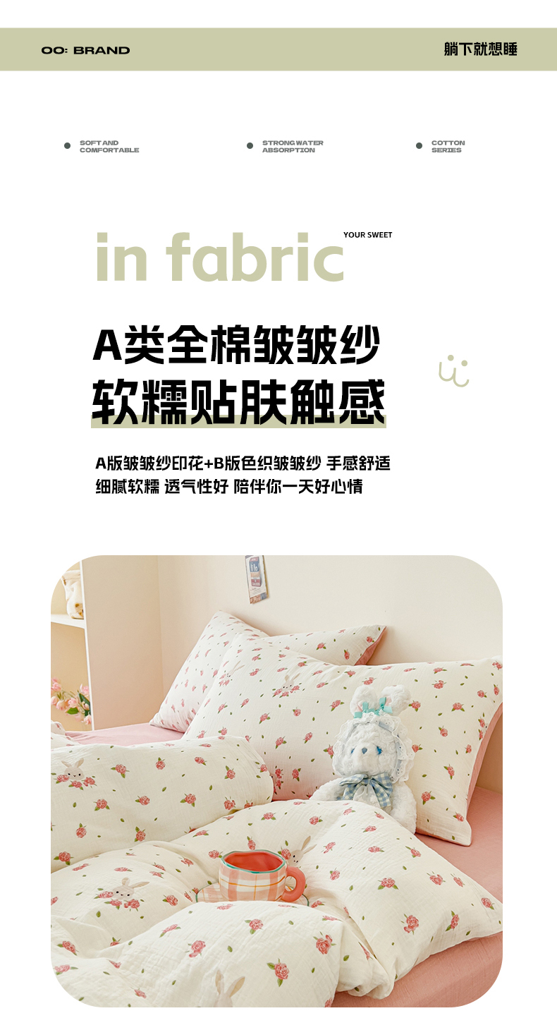 商品名称:木楌 2025新款全棉A类皱皱纱印花四件套 花与兔