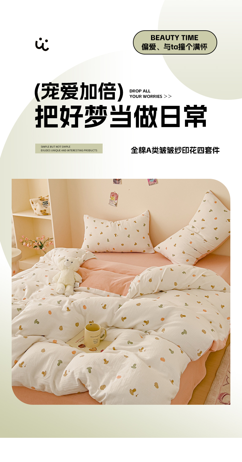 (总)木楌 2025新款全棉A类皱皱纱印花四件套,彼得熊,春泥,丁香-绿,丁香-紫,哈尼,海皮狗,涵雅,赫本熊,可心兰,可心咖,兰菲,美芽,木兰,奶油爱心,奶油波点,宁静,浅汐,沁香,微笑,星月,宾果熊,初颜,璎珞,花与兔,洛依,清新草莓,芮芮花,小彩蘑,小恐龙,小熊猫,幸运草,樱桃,知音,紫萱,小南国