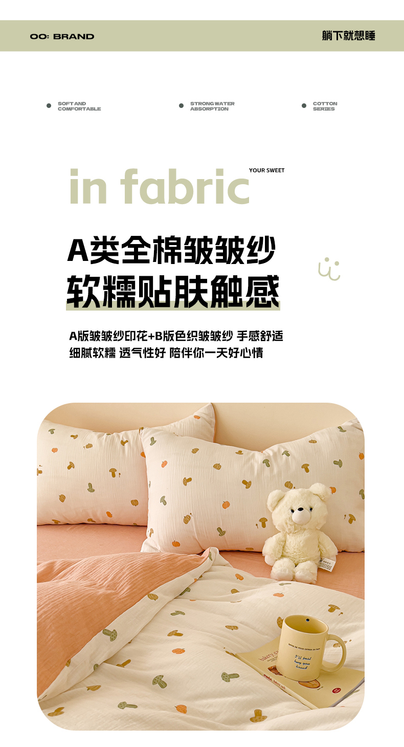 (总)木楌家居 2025新款A类全棉皱皱纱印花四件套,甜心宝贝,薄雾玫瑰,枫林 咖,枫林 绿,可颂,兰亭序,梦蝶,觅森,墨韵,晚棠,小确幸,伊洛娜,云梦泽,半夏 粉,草莓啵啵,初微,可心 兰,可心咖,哈尼,兰菲,黎夏 粉,黎夏 兰,木兰,奶油爱心,宁静,清颜,芮汐,时序 黄,时序 桔蓝,苏潼,西棠,潇湘,星月,悠然,月瑶