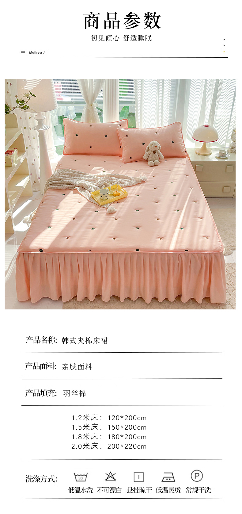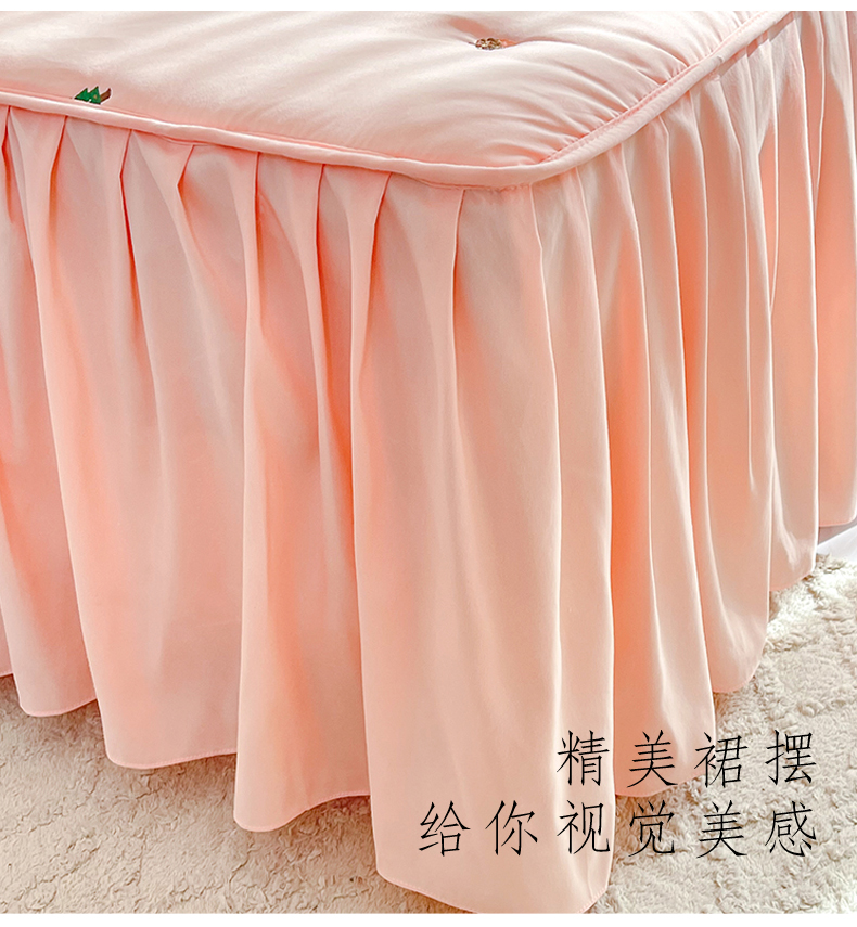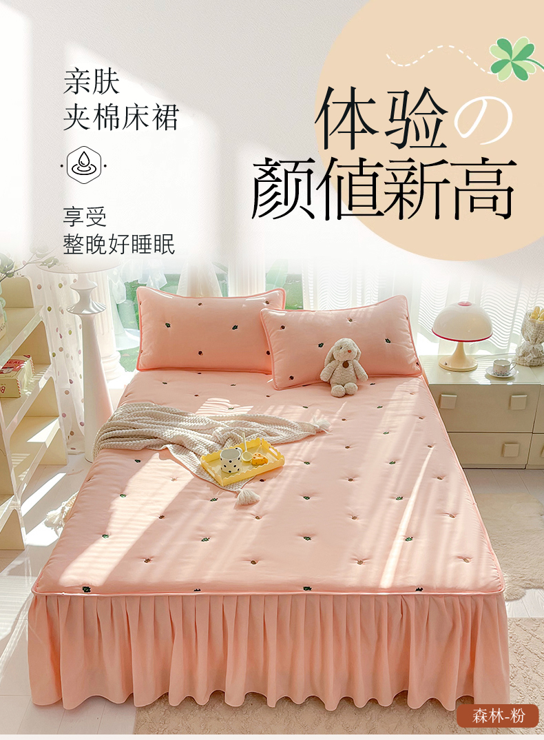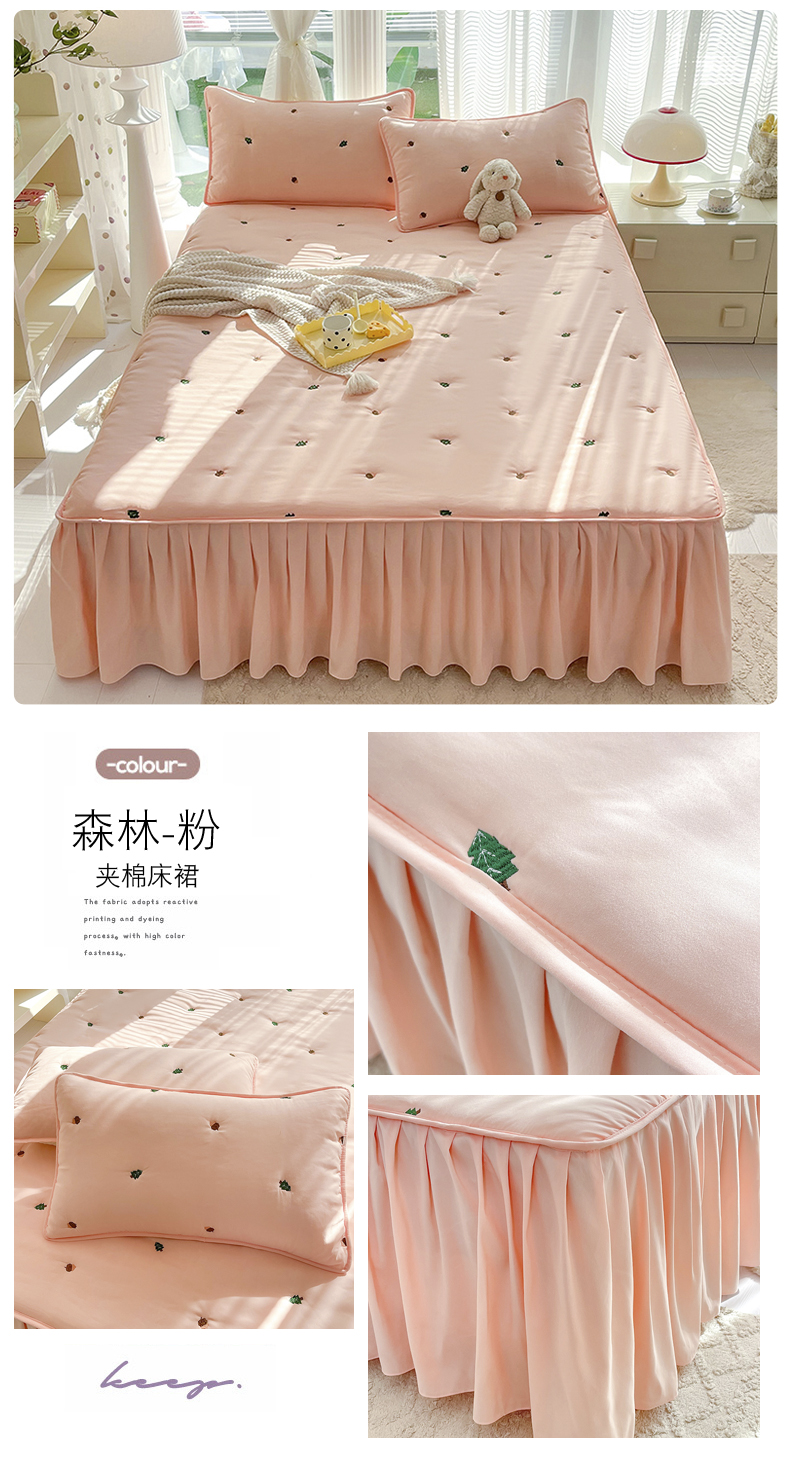 商品名称:美达家纺2025新品纯色刺绣水洗棉夹棉床裙 森林-粉